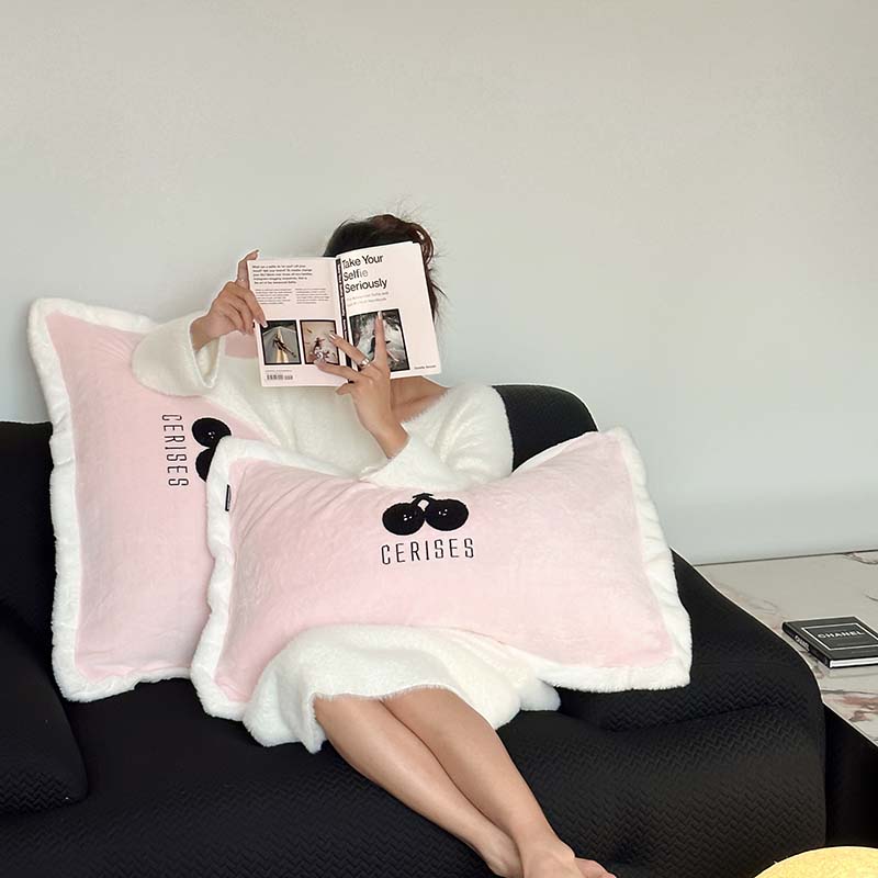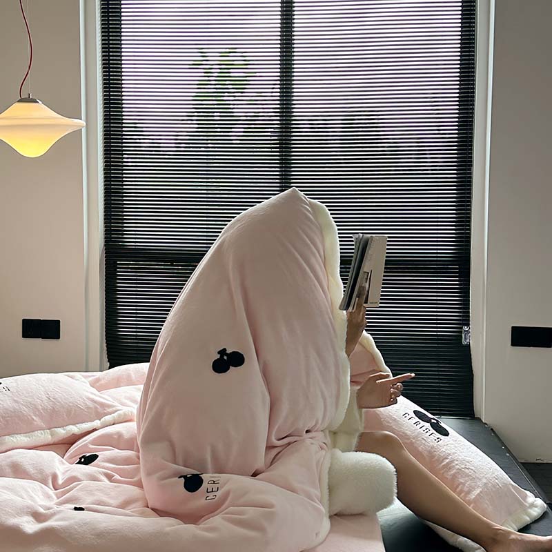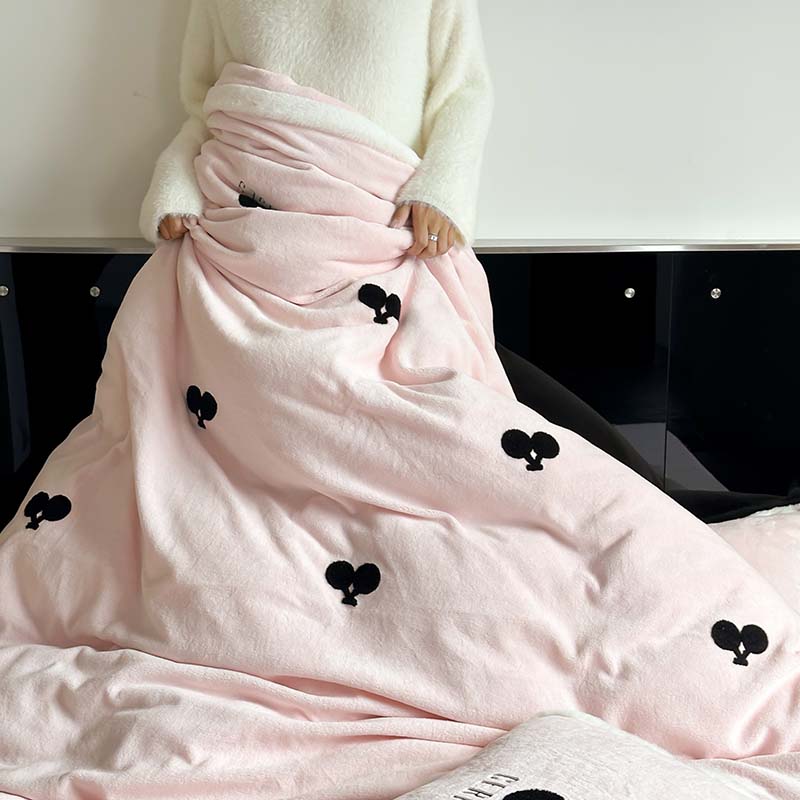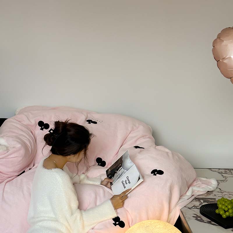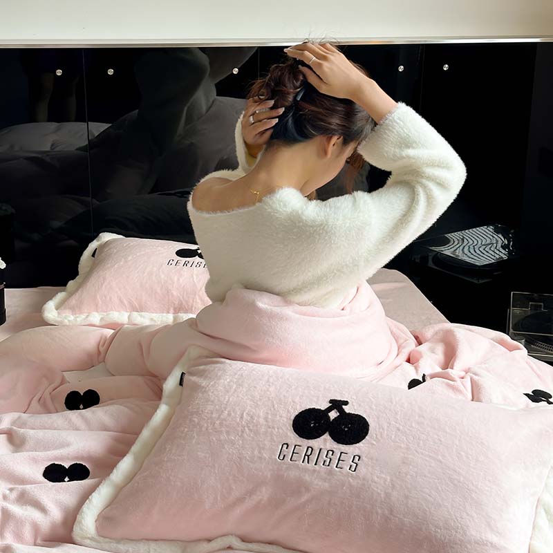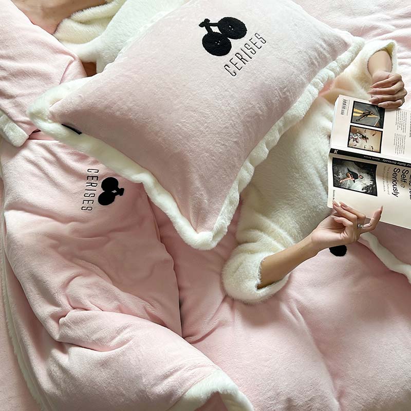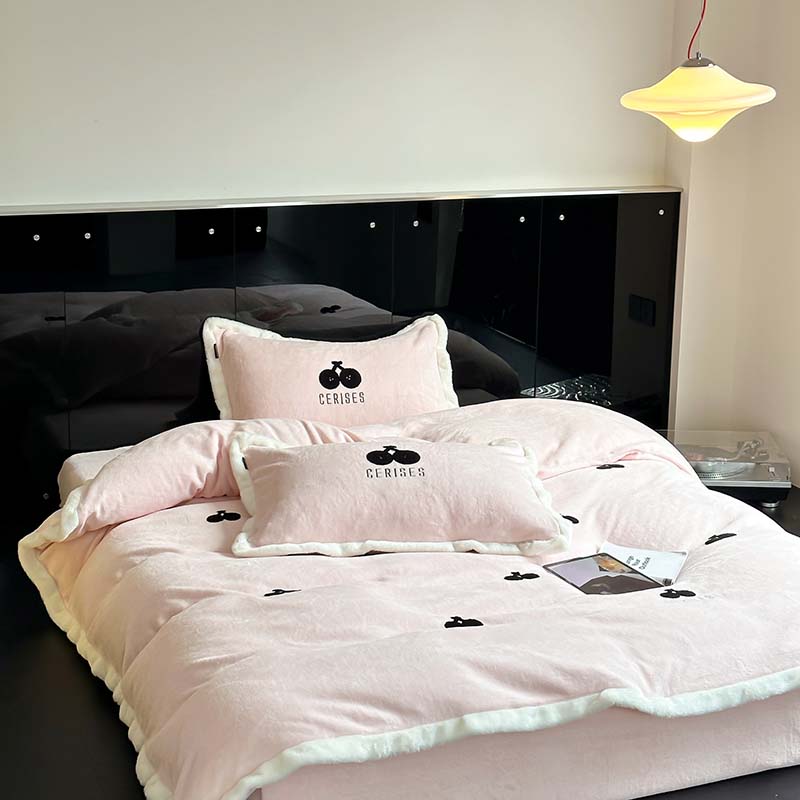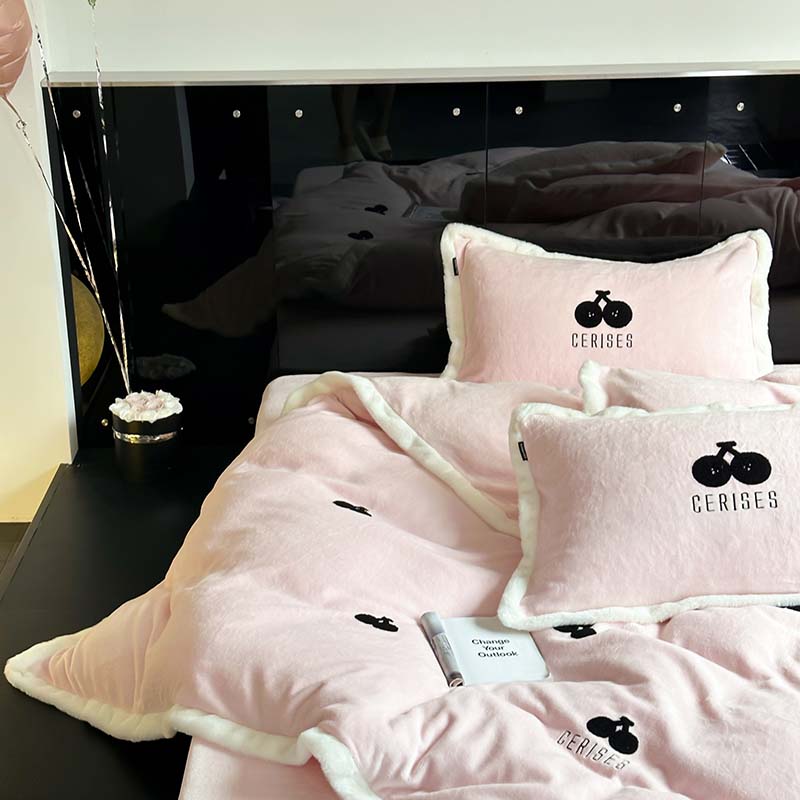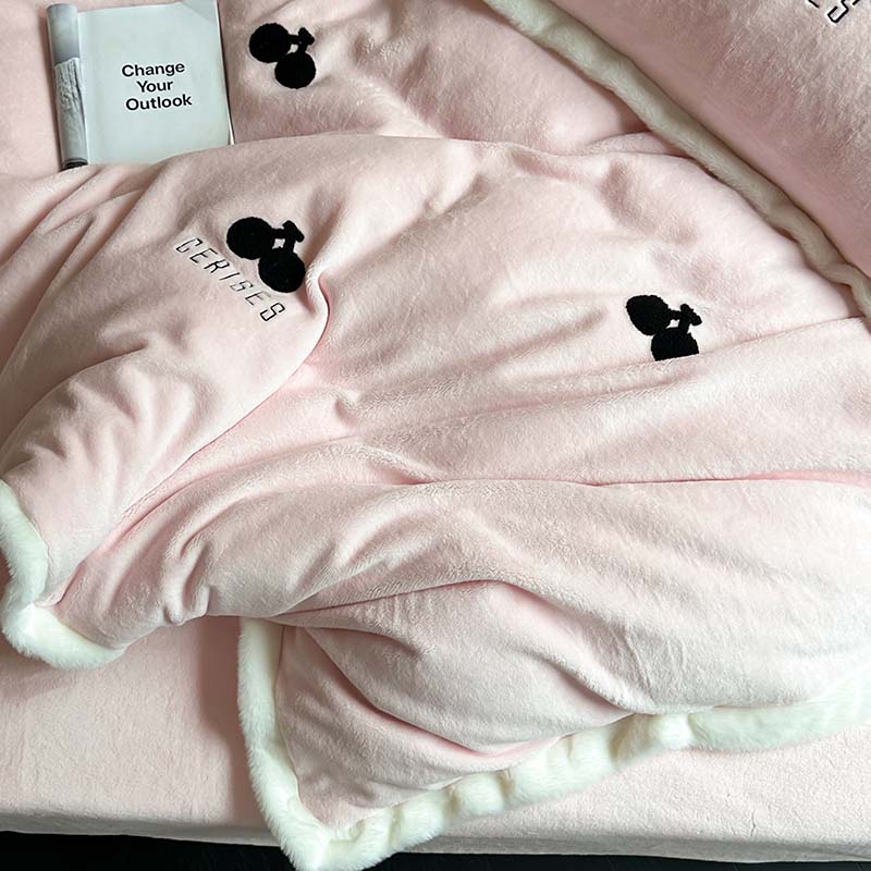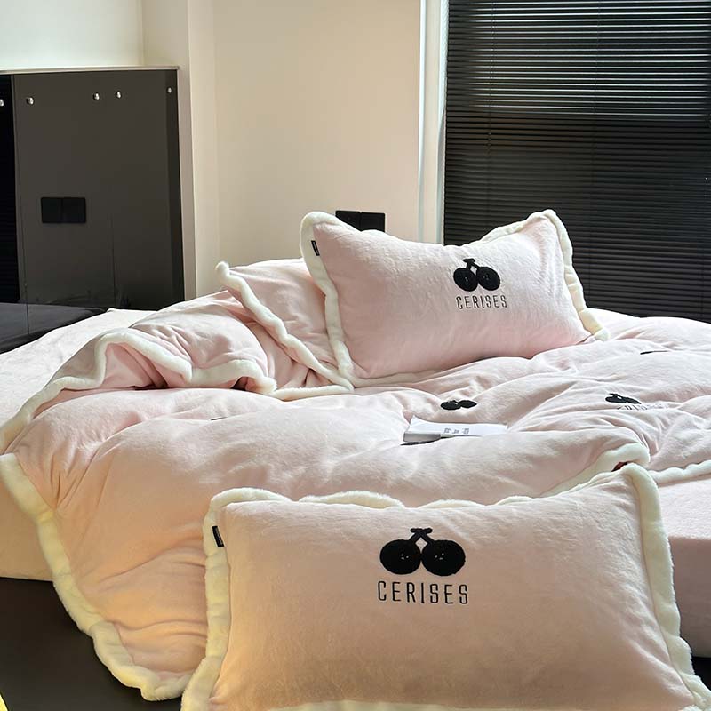 圆岛家纺 2023秋冬新款少女心桃心樱桃毛巾绣牛奶绒四件套 樱桃(玉粉)
