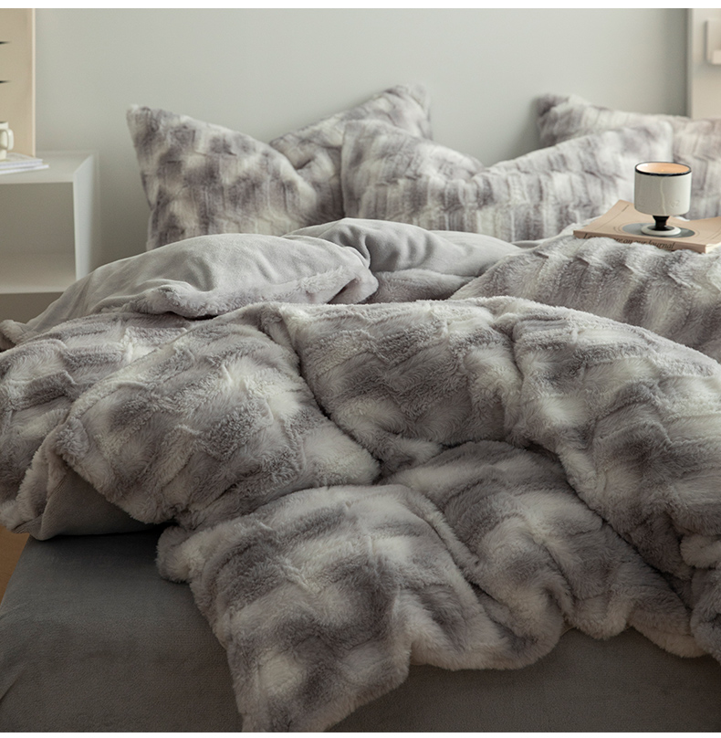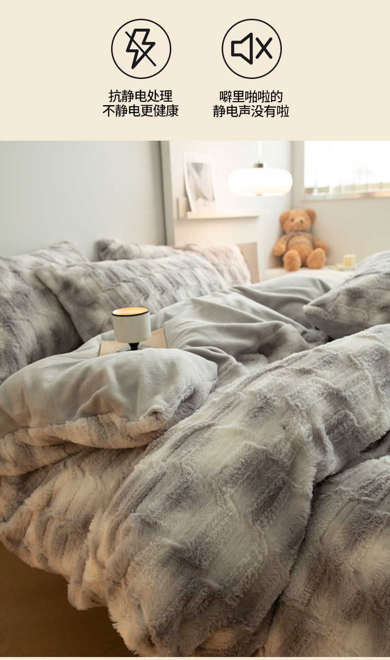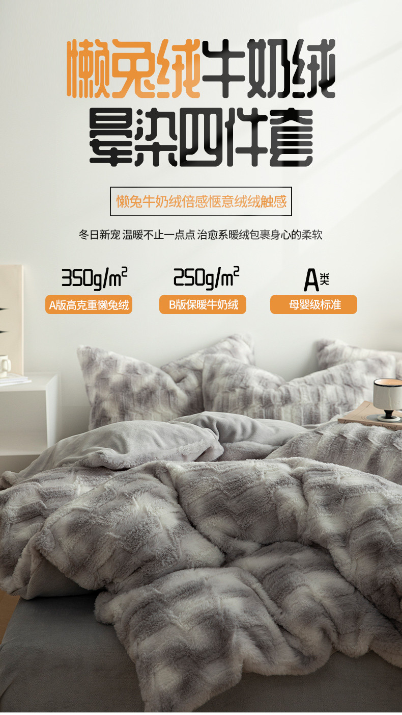 当前位置: 91家纺网 > 商品网购 > 床品套件 > 四件套 > 兔毛绒四件套 > 安哆啦家纺 2024新款濑兔绒毛晕染色系牛奶绒四件套 晕染灰