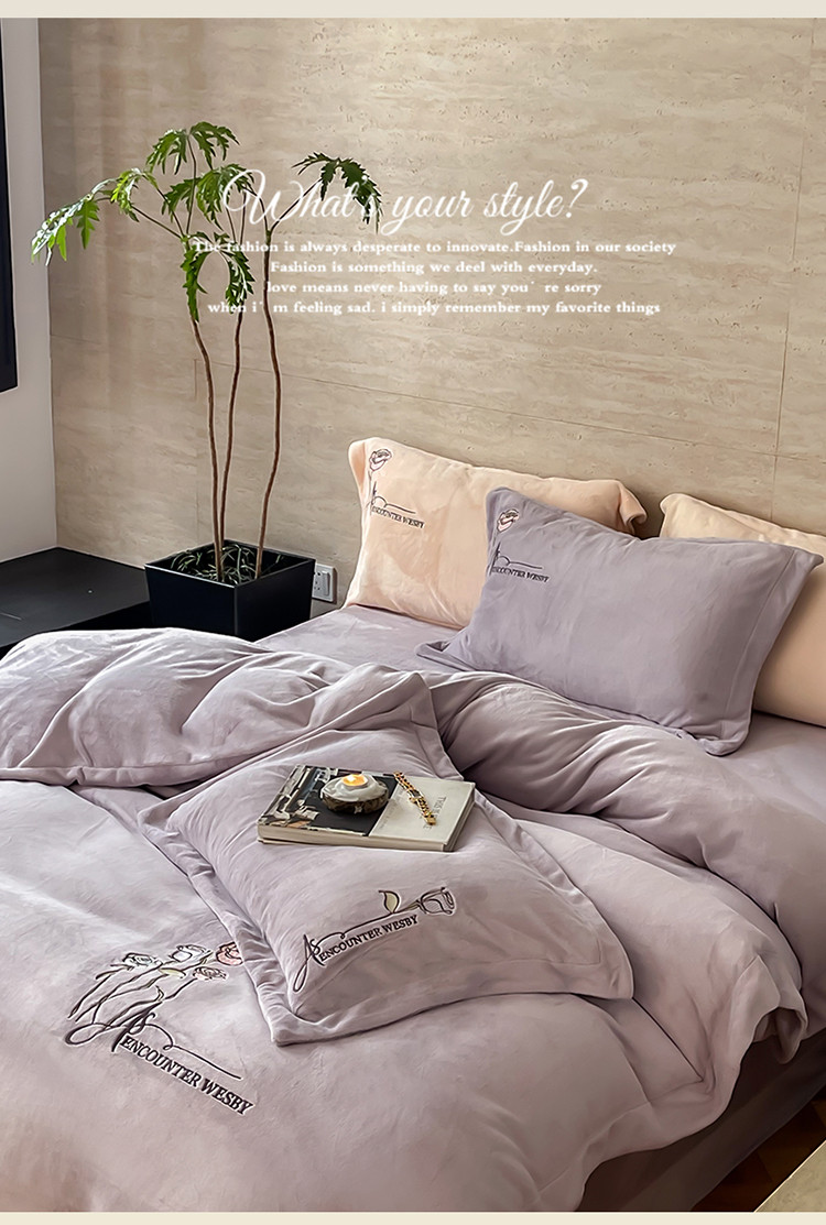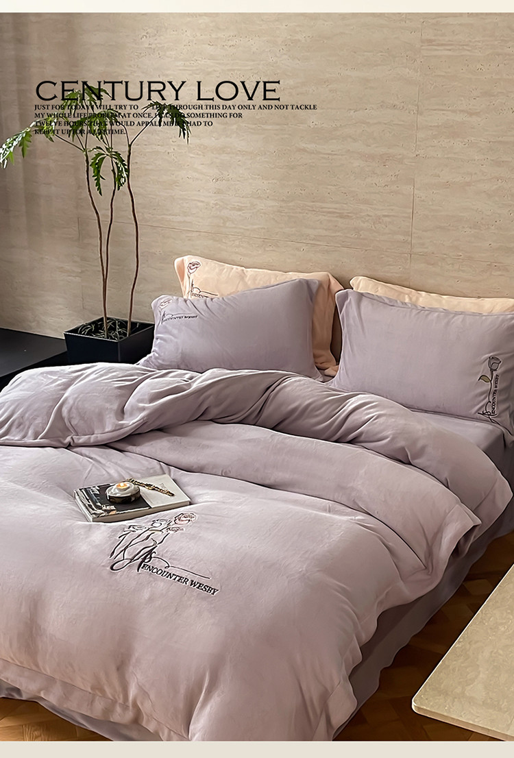 名品优仓 2023新款高克重230克牛奶绒绣花款四件套-保加利亚 保加利亚-浅紫