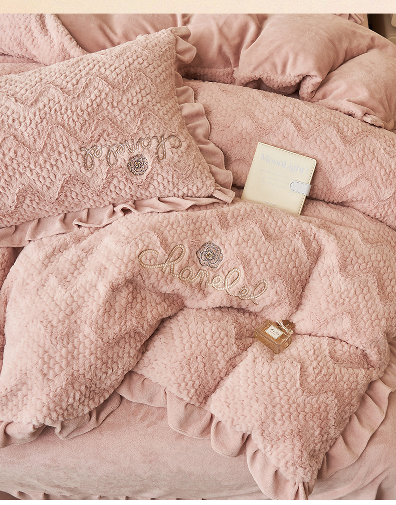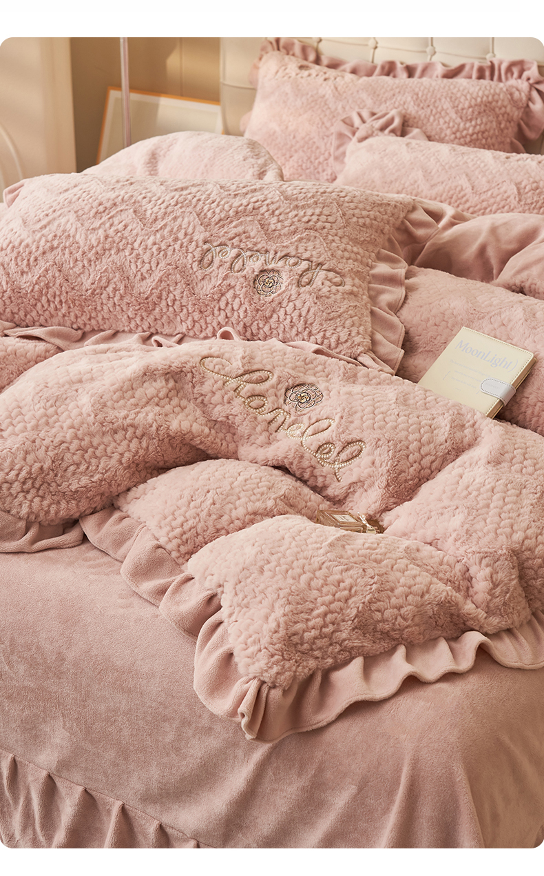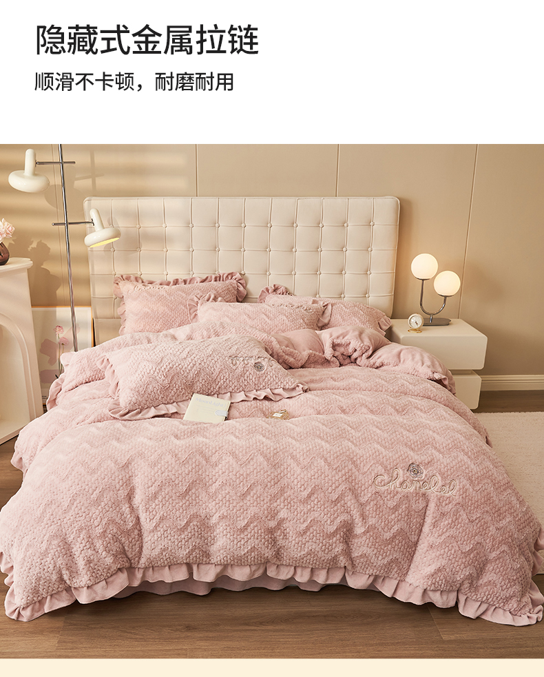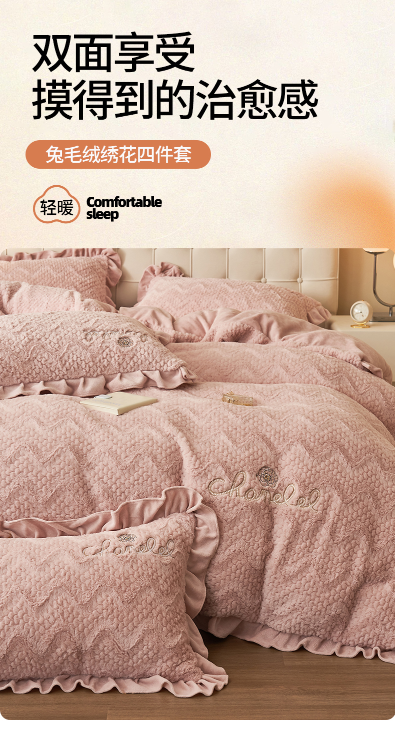 恒爱家纺 2023新款兔毛绒绣花四件套 波浪款-浅粉