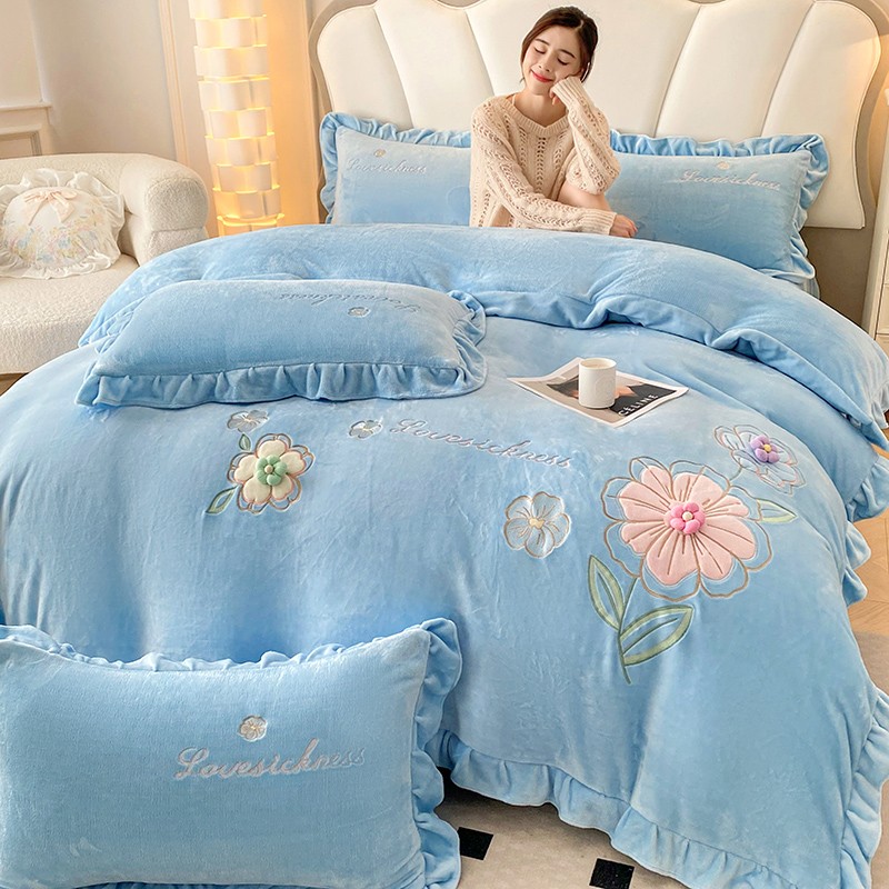 (总)漫布云 2025新款230g高克重韩版立体盘花牛奶蚕丝绒绣花四件套床裙款被套-洛丽塔系列,洛丽塔-嫩黄 ,洛丽塔-香芋紫,洛丽塔-珍珠粉, 洛丽塔-婴儿蓝