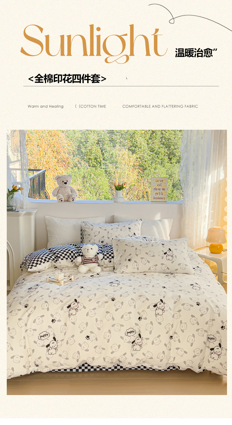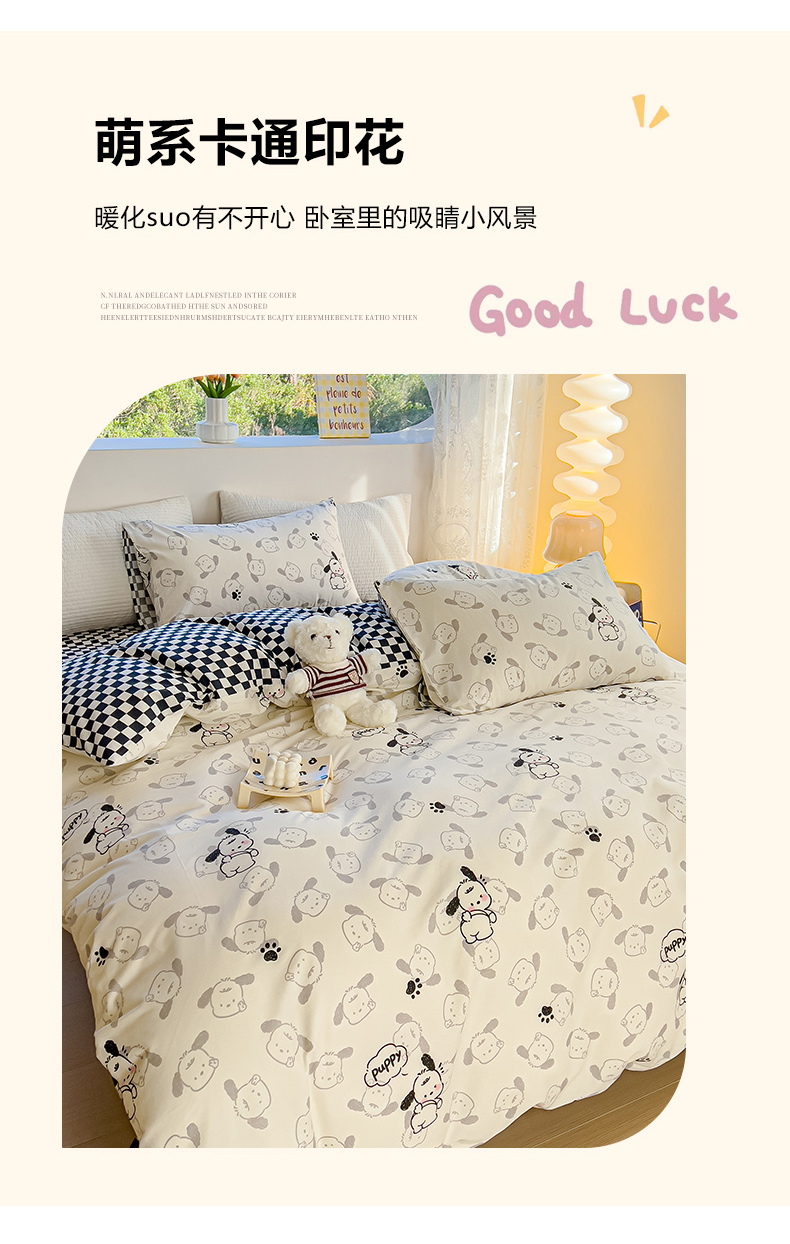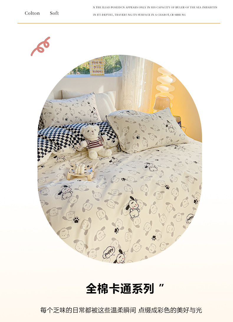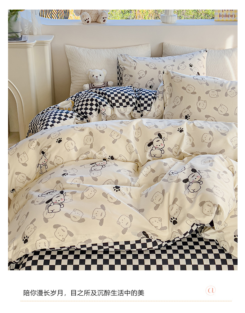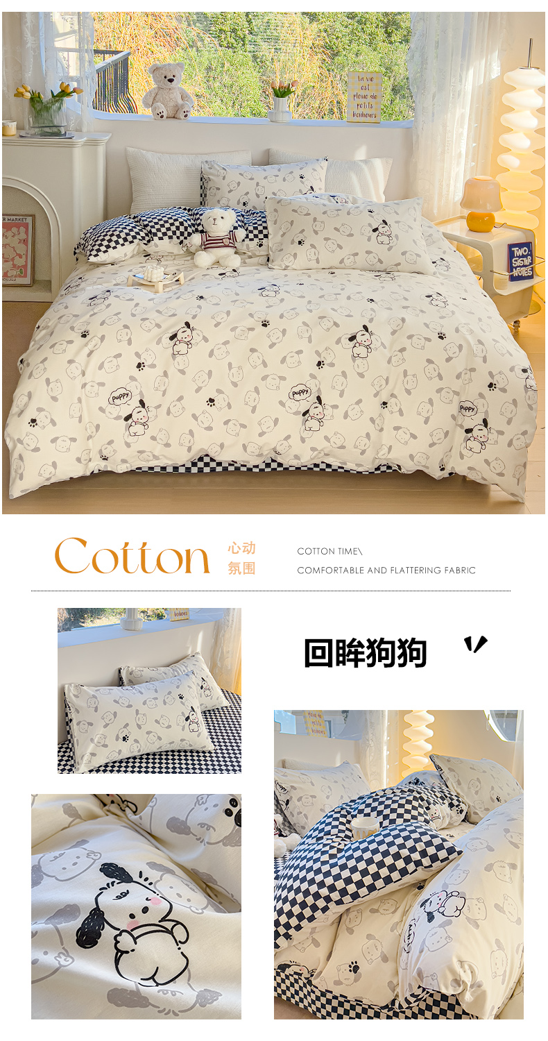 当前位置: 91家纺网 > 商品网购 > 床品套件 > 四件套 > 全棉普通四件套 > 感遇家纺 2024春夏新品全棉卡通印花四件套-第一批 回眸狗狗