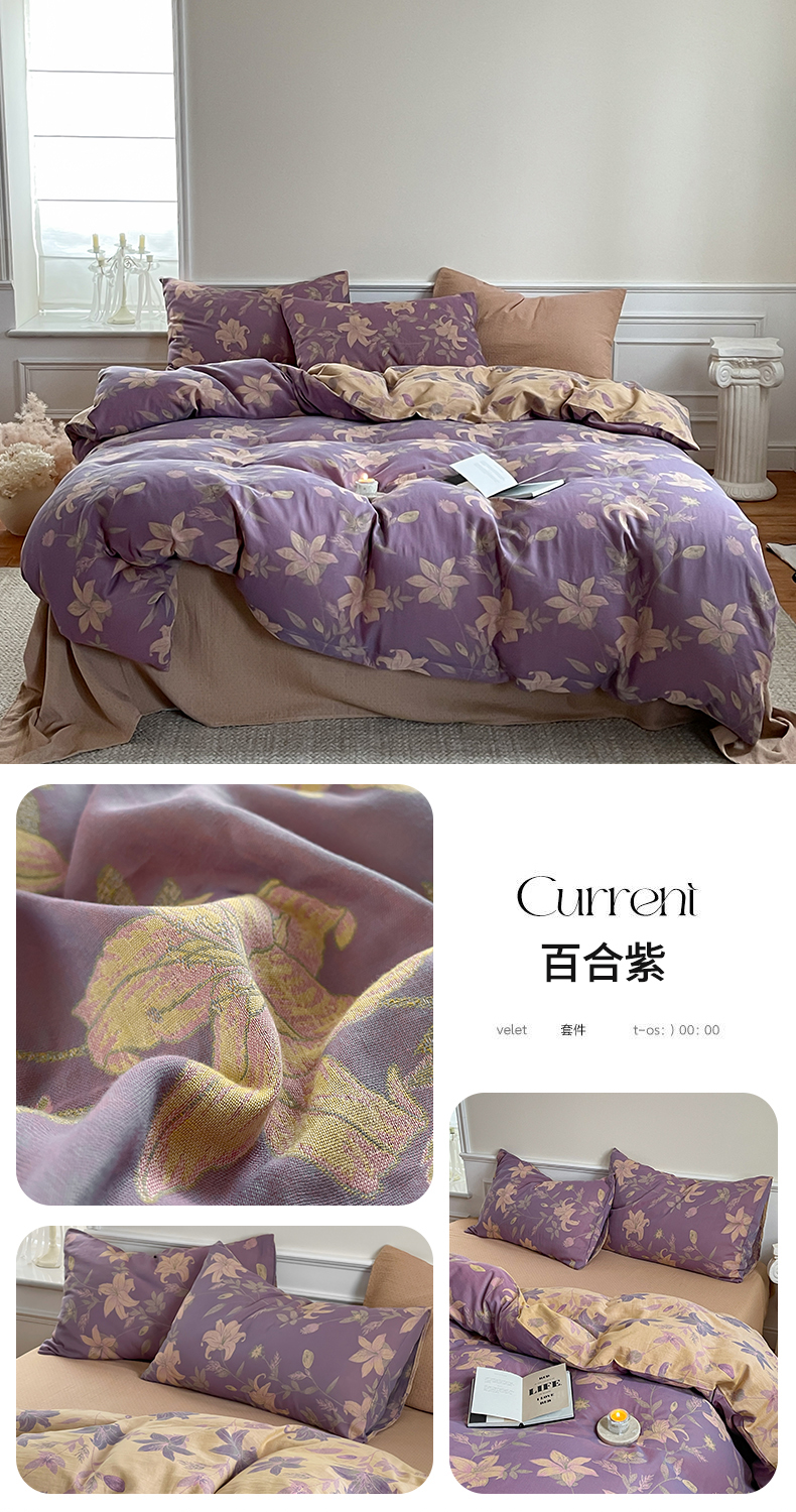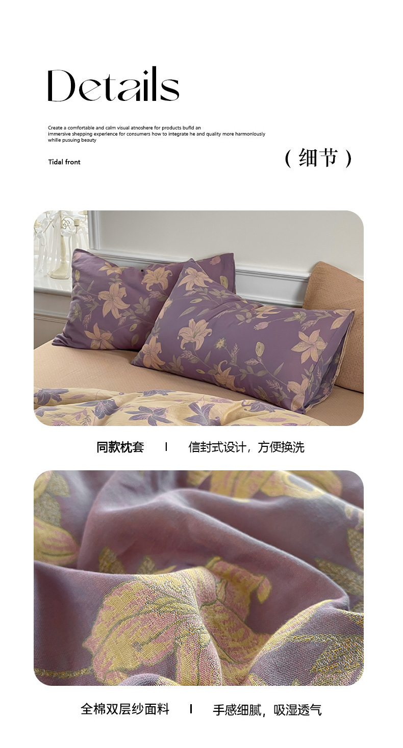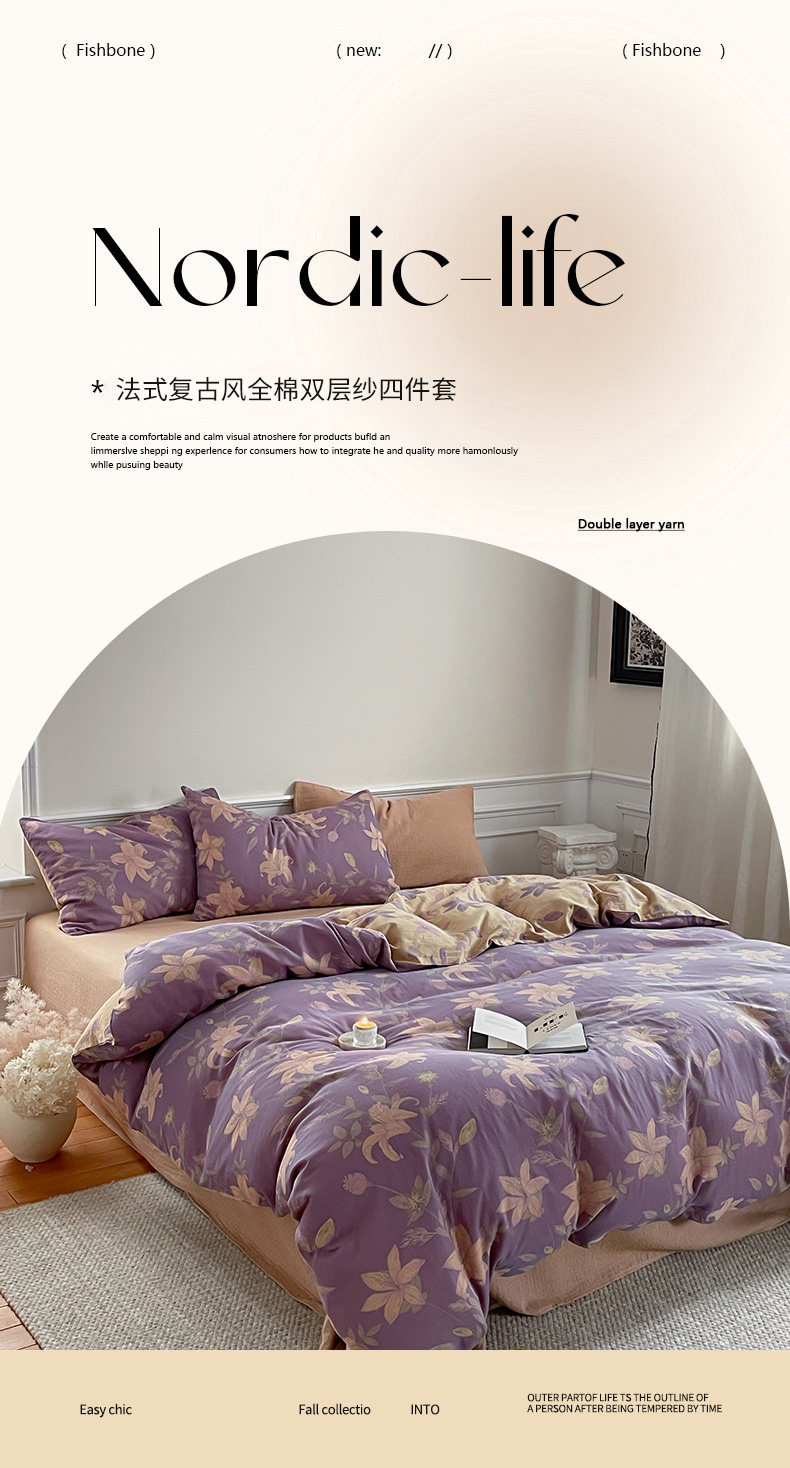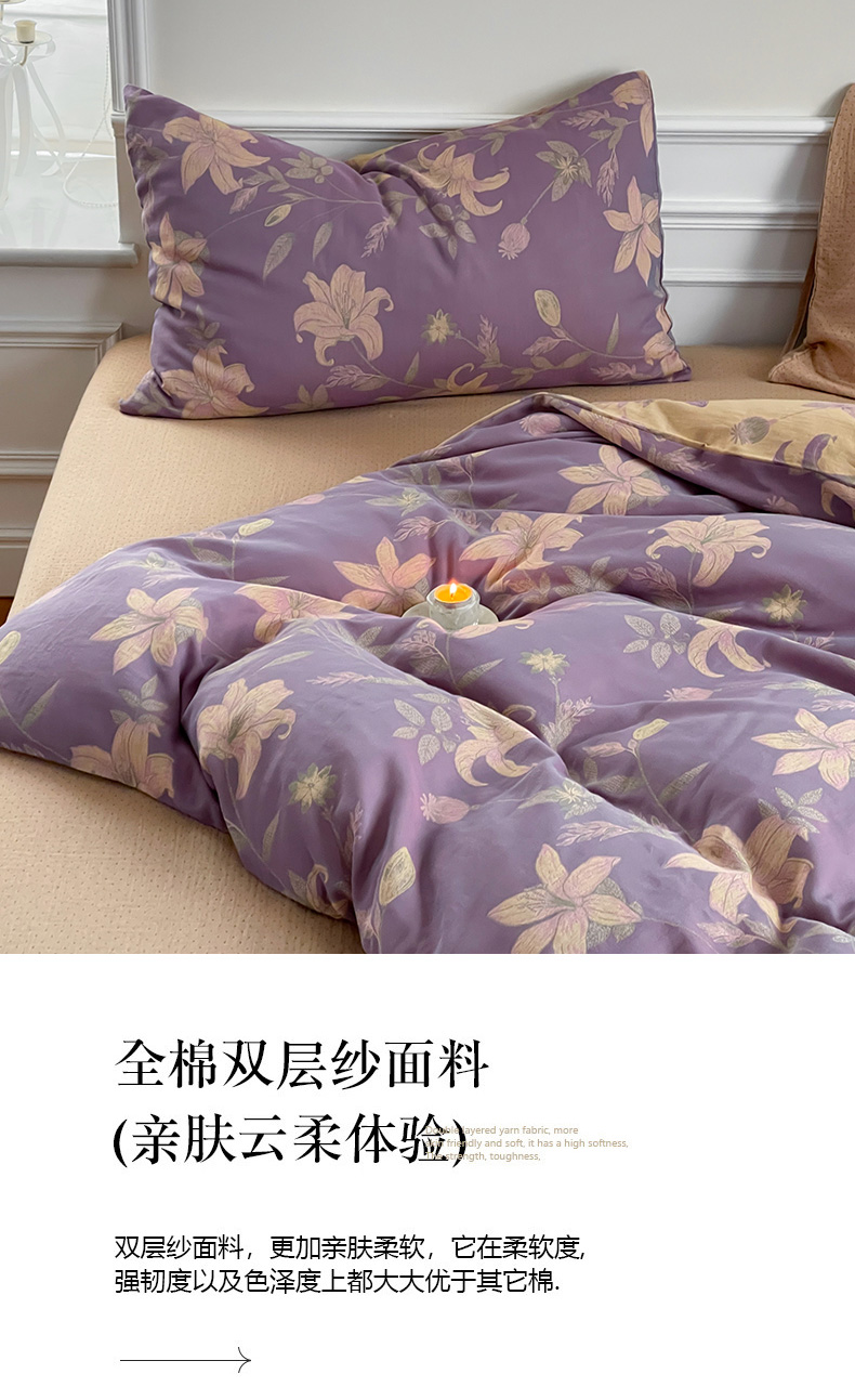 • 91家纺网 家纺一手货源 找家纺 艾咪 新款法式复古风纯棉双层纱布四件套(有单品售) 百合紫