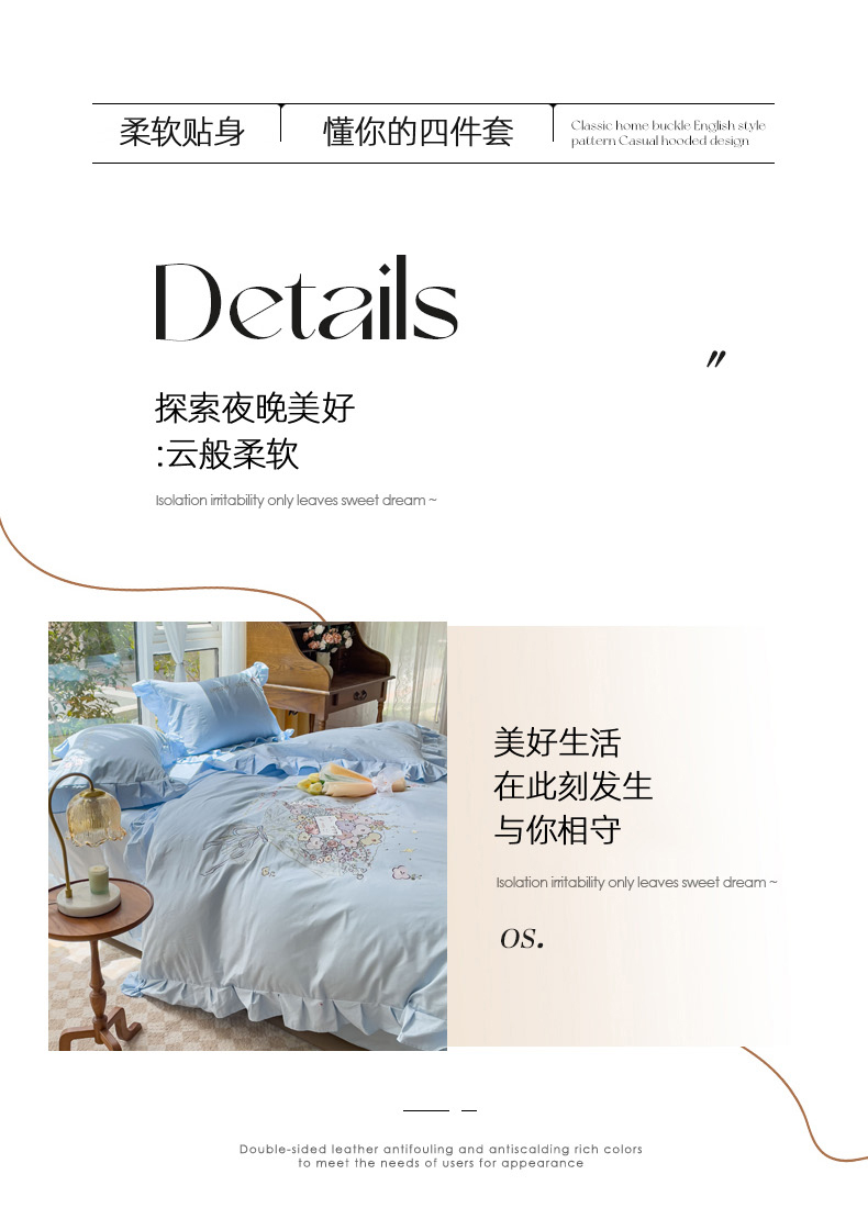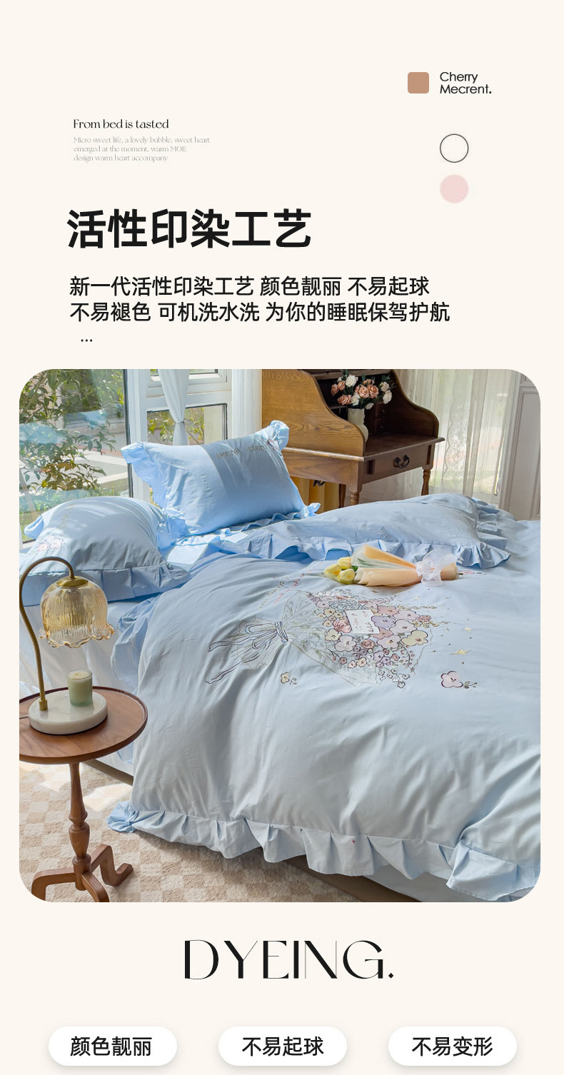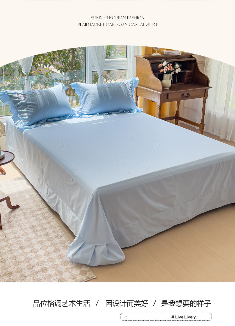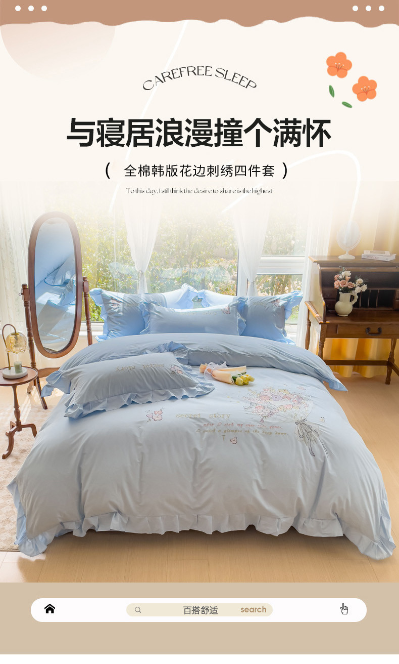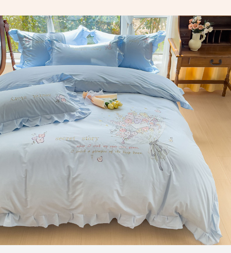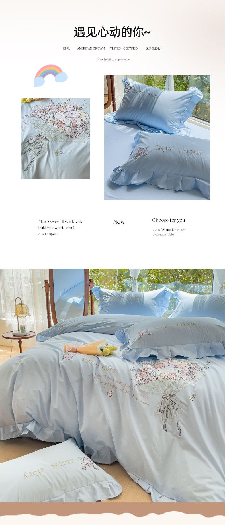 星尚家纺 2024新款全棉水洗棉韩版花边绣花纯棉四件套-馥郁 天蓝