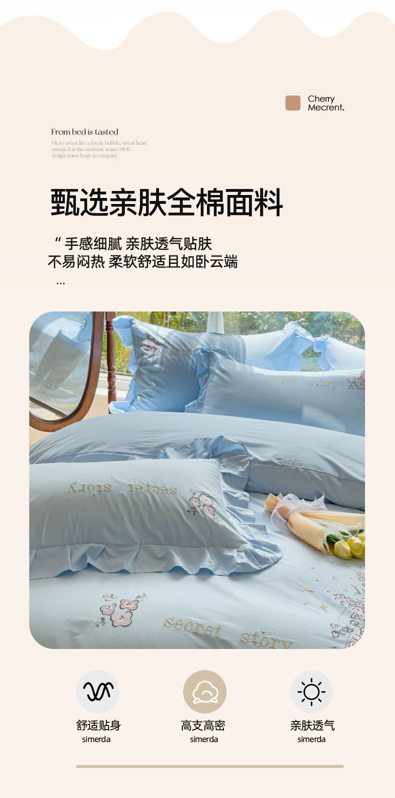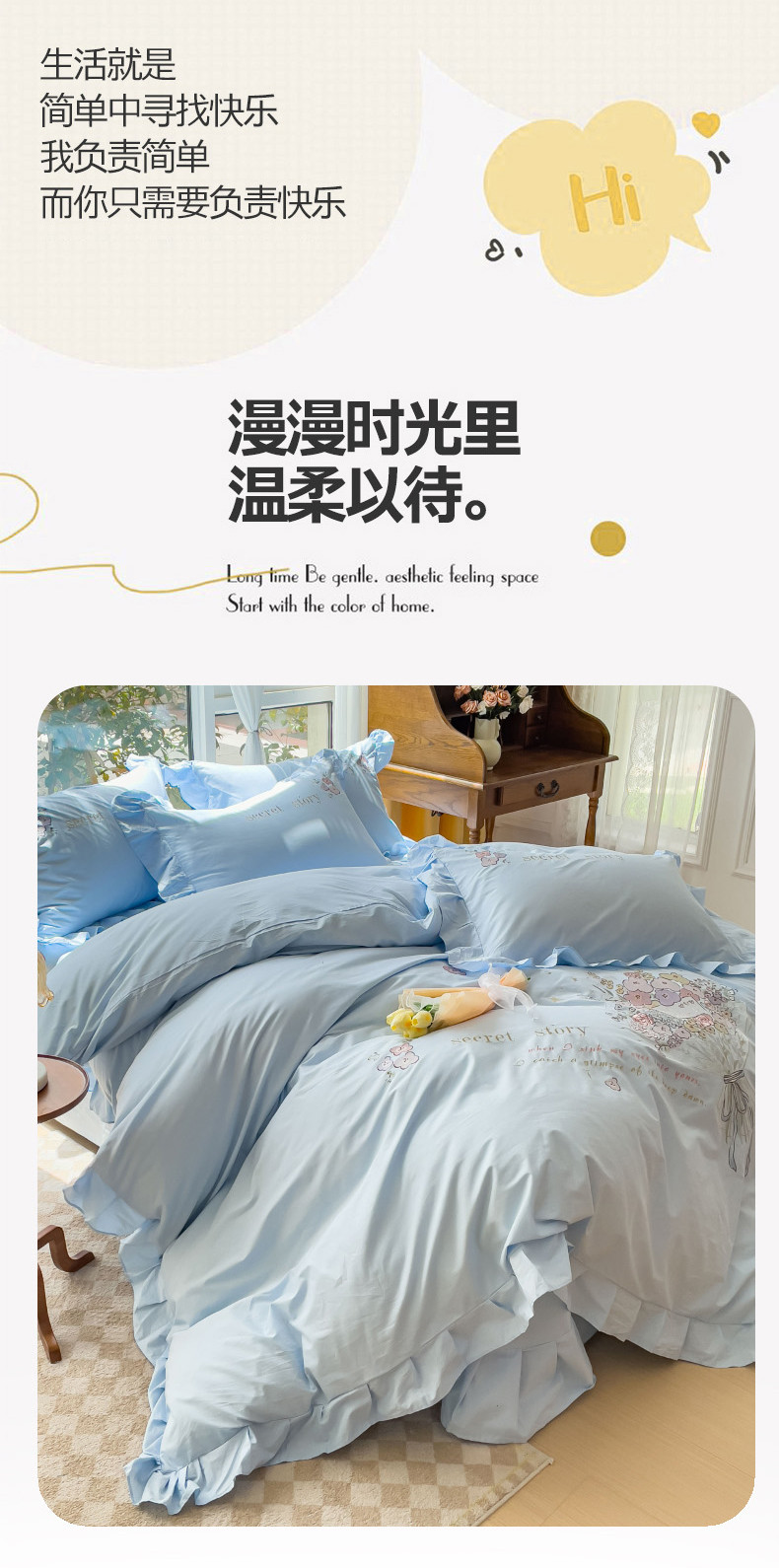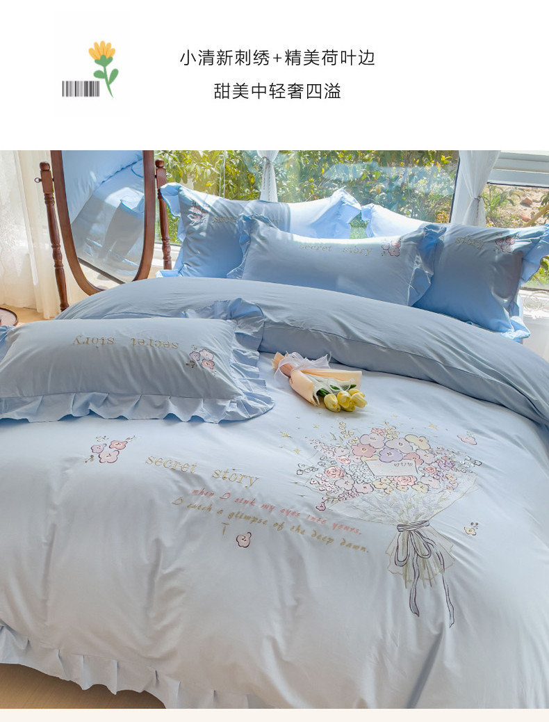 商品名称:星尚家纺 2024新款全棉水洗棉韩版花边绣花纯棉四件套-馥郁 天蓝