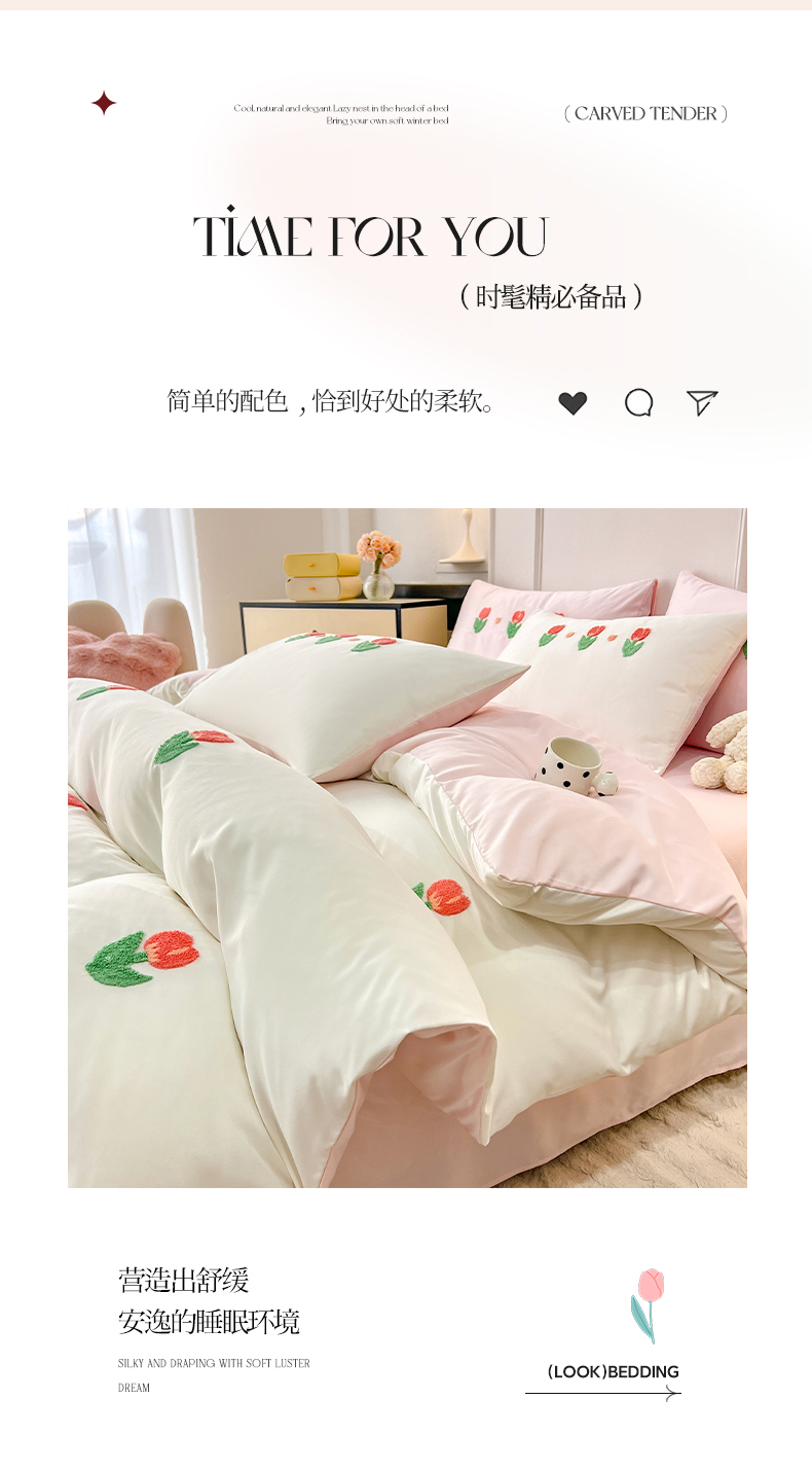 艾米家居 2025水洗真丝四件套毛巾绣四件套-郁金香系列 白加粉