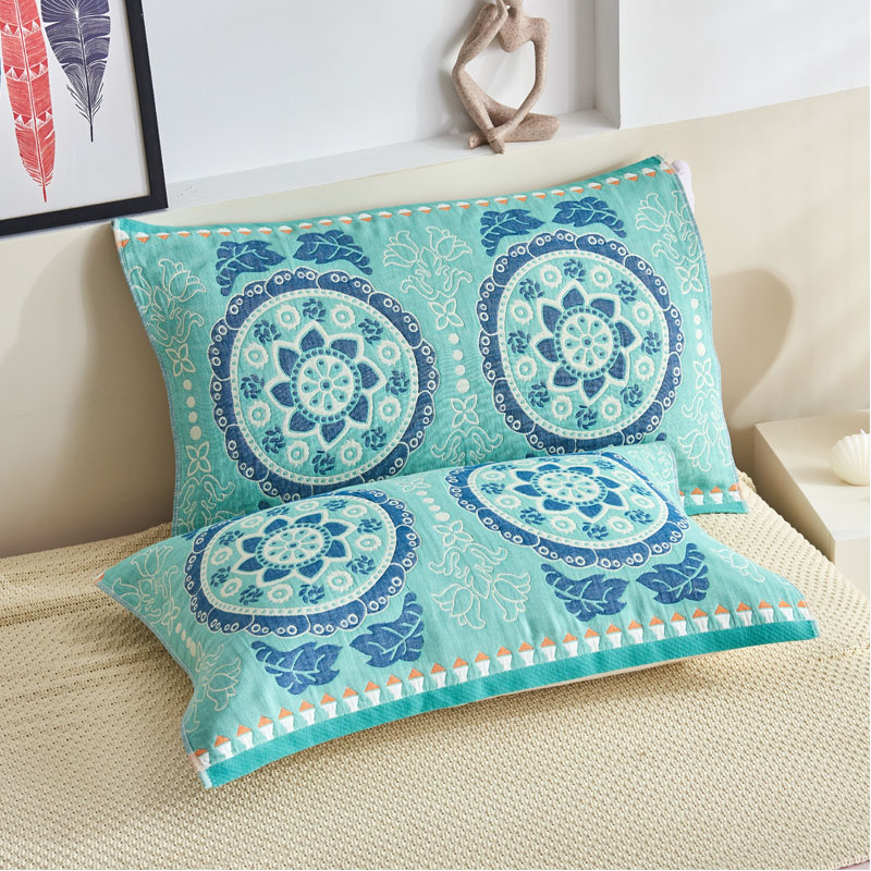 当前位置: 91家纺网 > 商品网购 > 床上用品 > 枕巾 > 朴尔毛巾被 2024年民族风彩棉系列四层纱布枕巾 太阳花绿52*78cm/一对