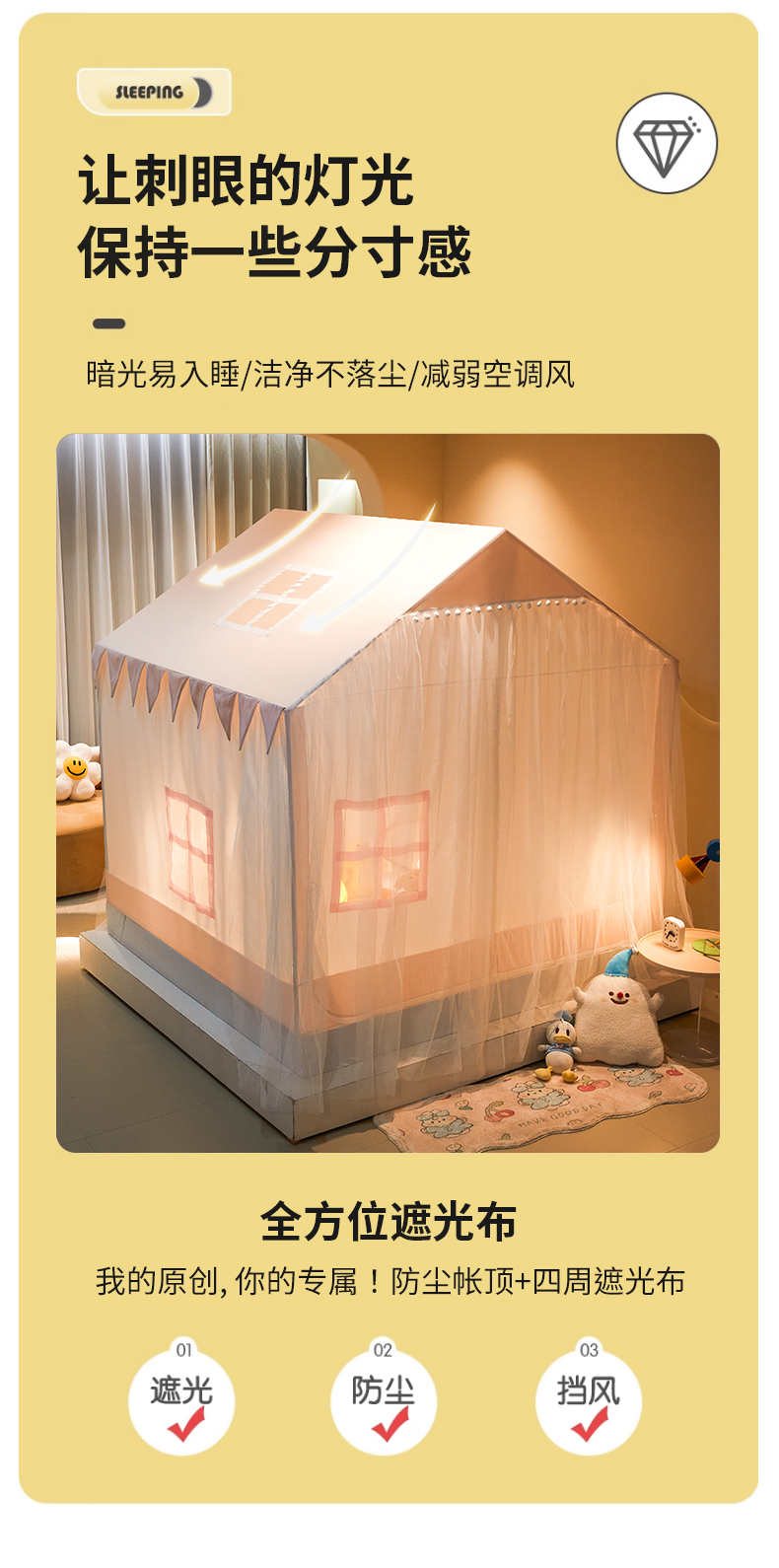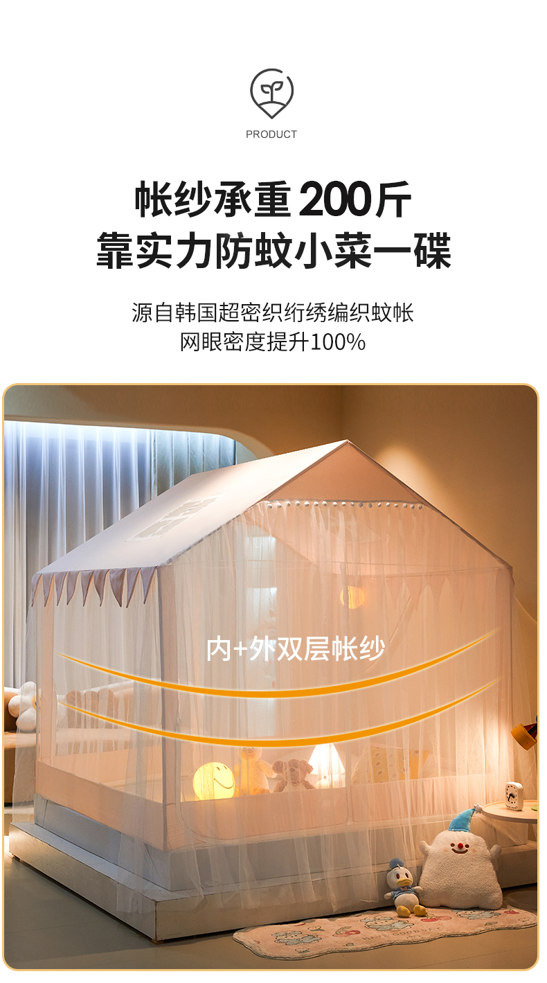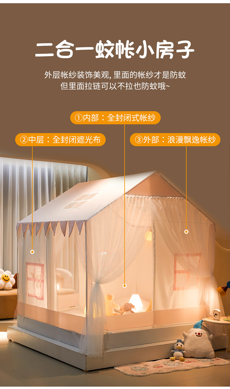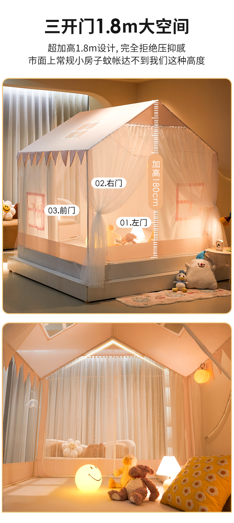 商品名称:(总)卓尔居 2024新款A类防蚊遮光三开门小房子床帘加密帐纱