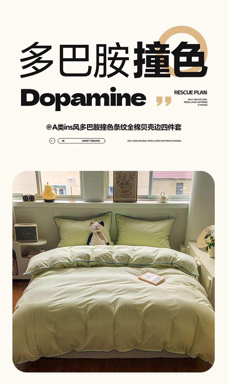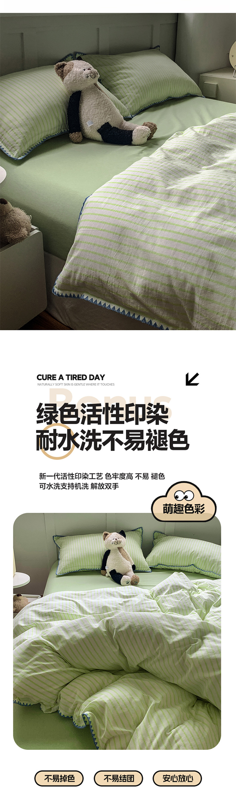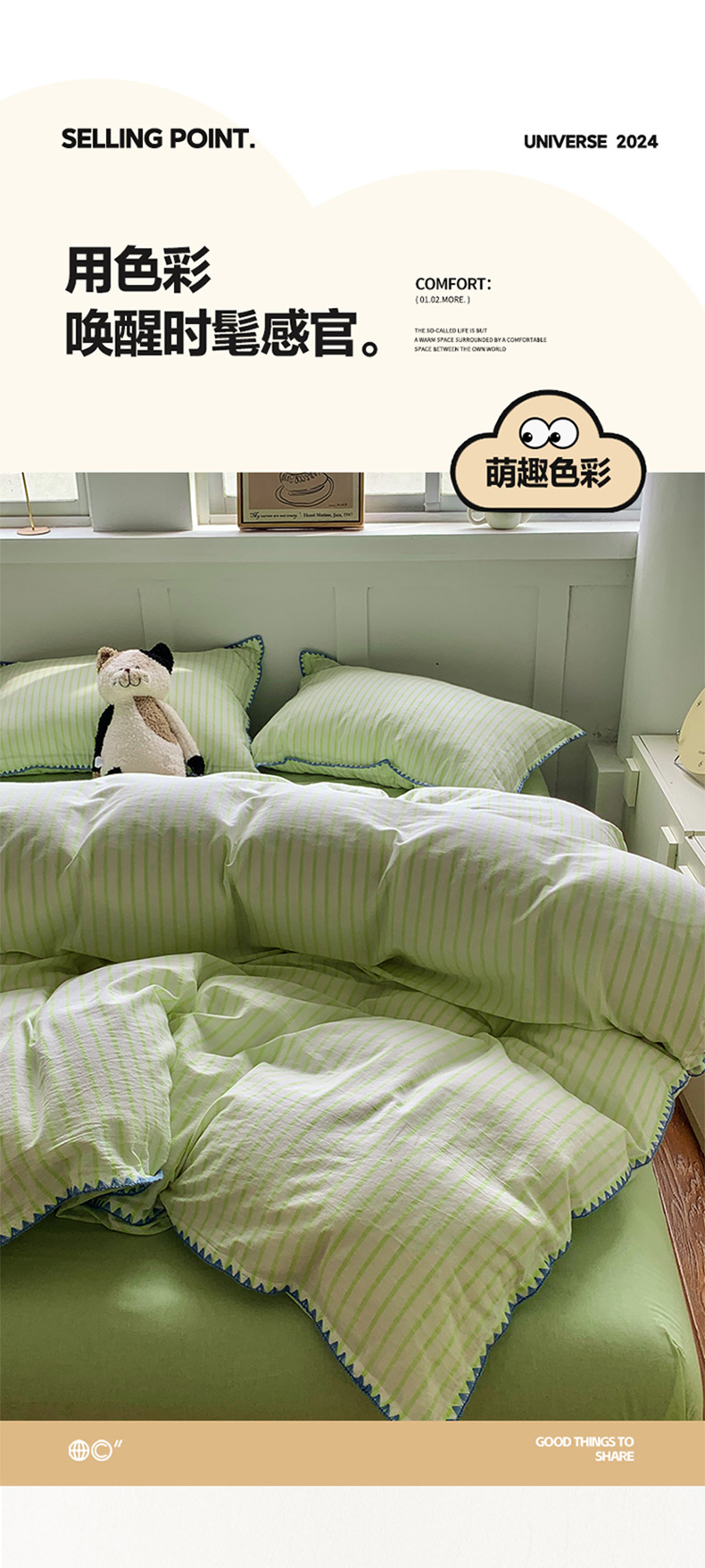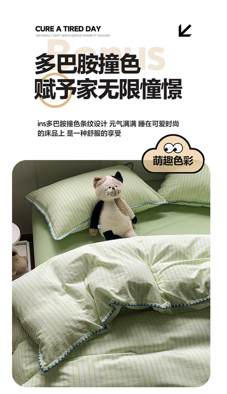 当前位置: 91家纺网 > 商品网购 > 床品套件 > 四件套 > 全棉普通四件套 > 莱茵家居 2024新款A类多巴胺撞色全棉水洗棉四件套荧光绿细条