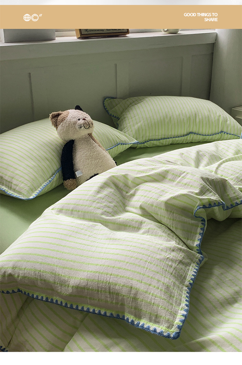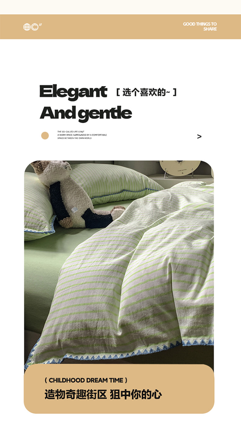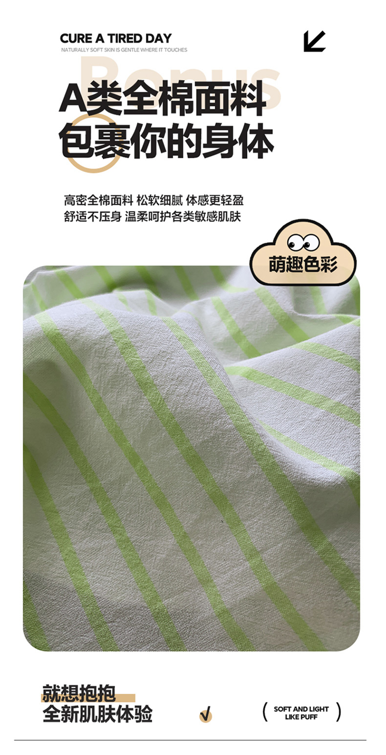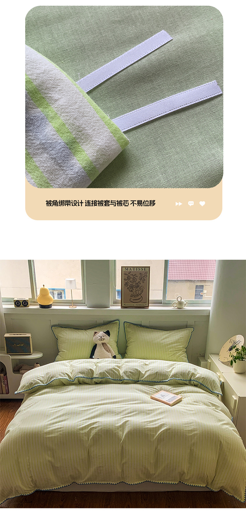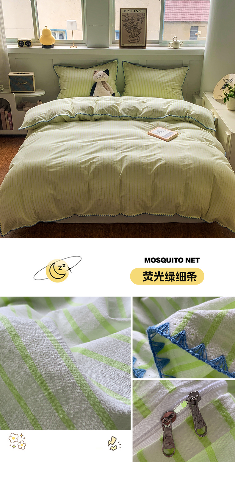 当前位置: 91家纺网 > 商品网购 > 床品套件 > 四件套 > 全棉普通四件套 > 莱茵家居 2024新款A类多巴胺撞色全棉水洗棉四件套荧光绿细条