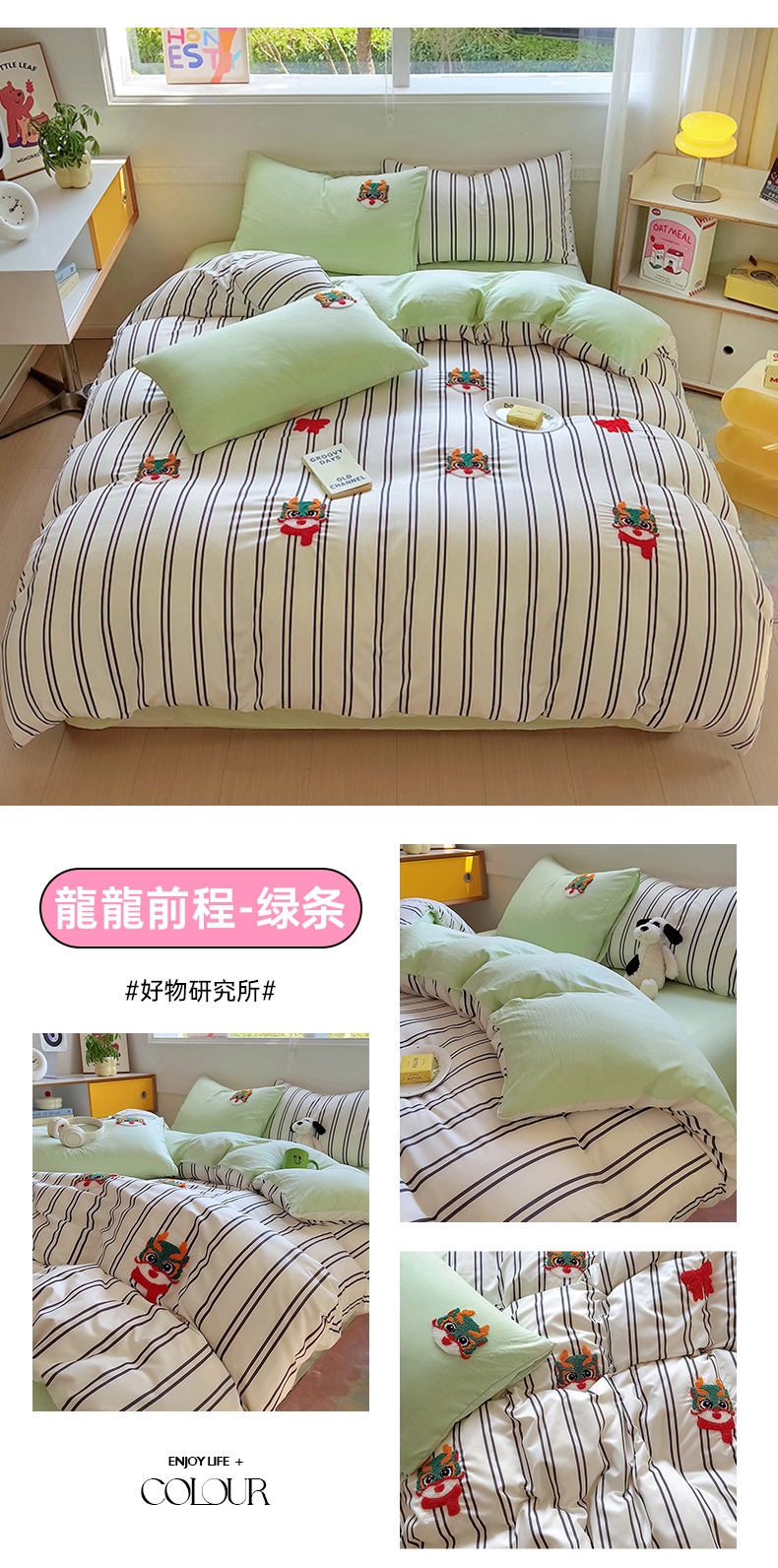 当前位置: 91家纺网 > 商品网购 > 床品套件 > 四件套 > 水洗棉四件套 > 易辰美 2024新款条纹水洗棉毛巾绣龙年限定四件套(专版) 龍龍前程-绿条