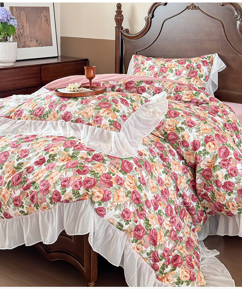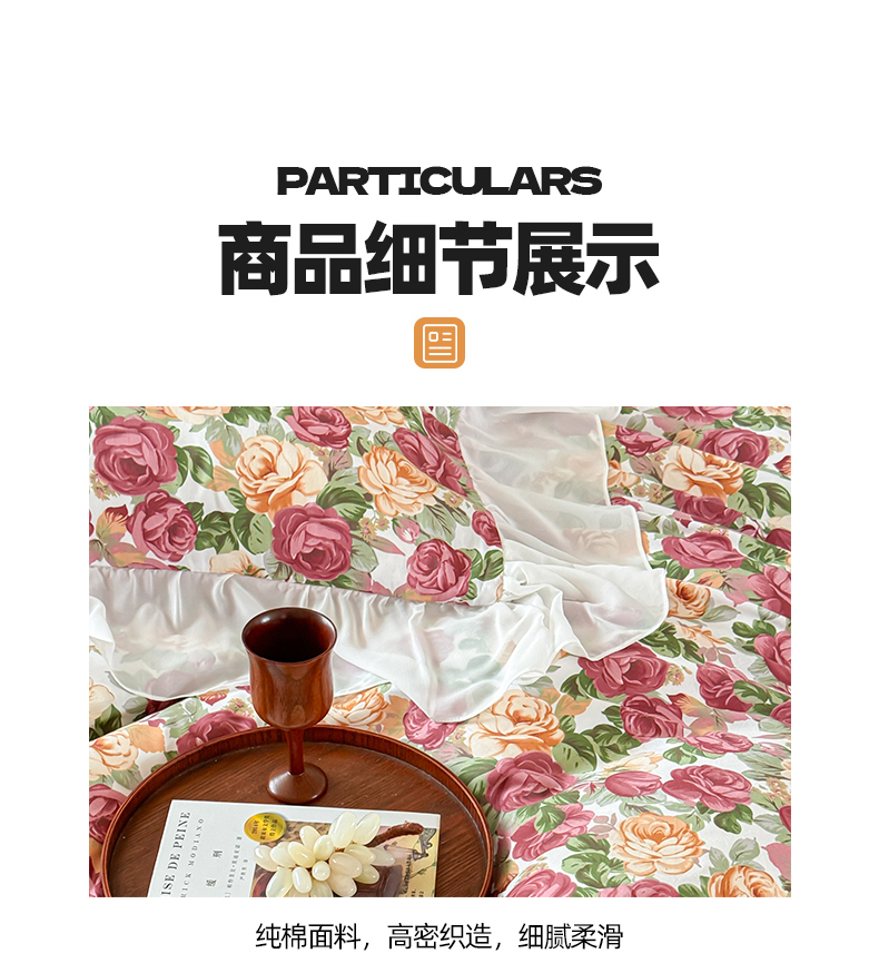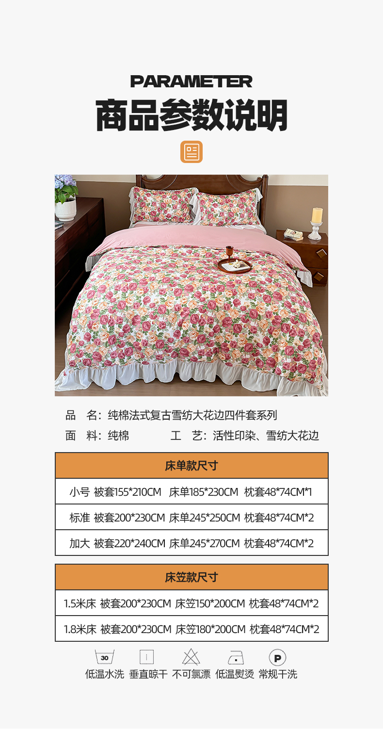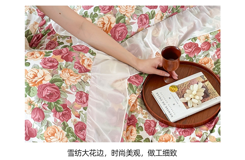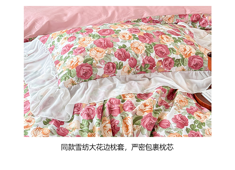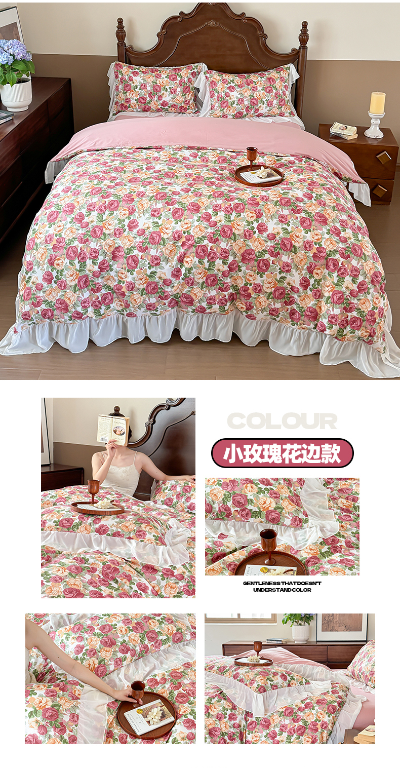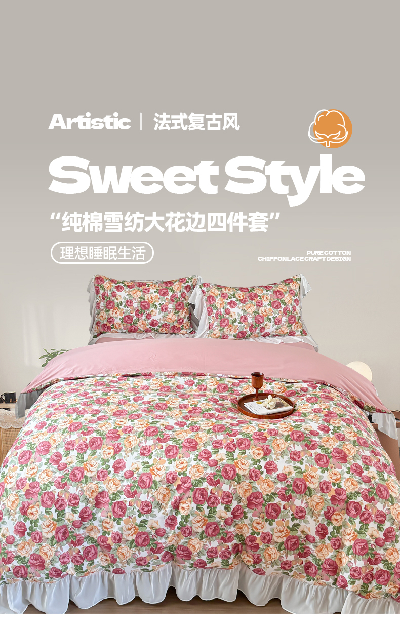 商品名称:窝米 2024夏季纯棉法式复古雪纺大花边四件套系列第二批 小玫瑰花边款