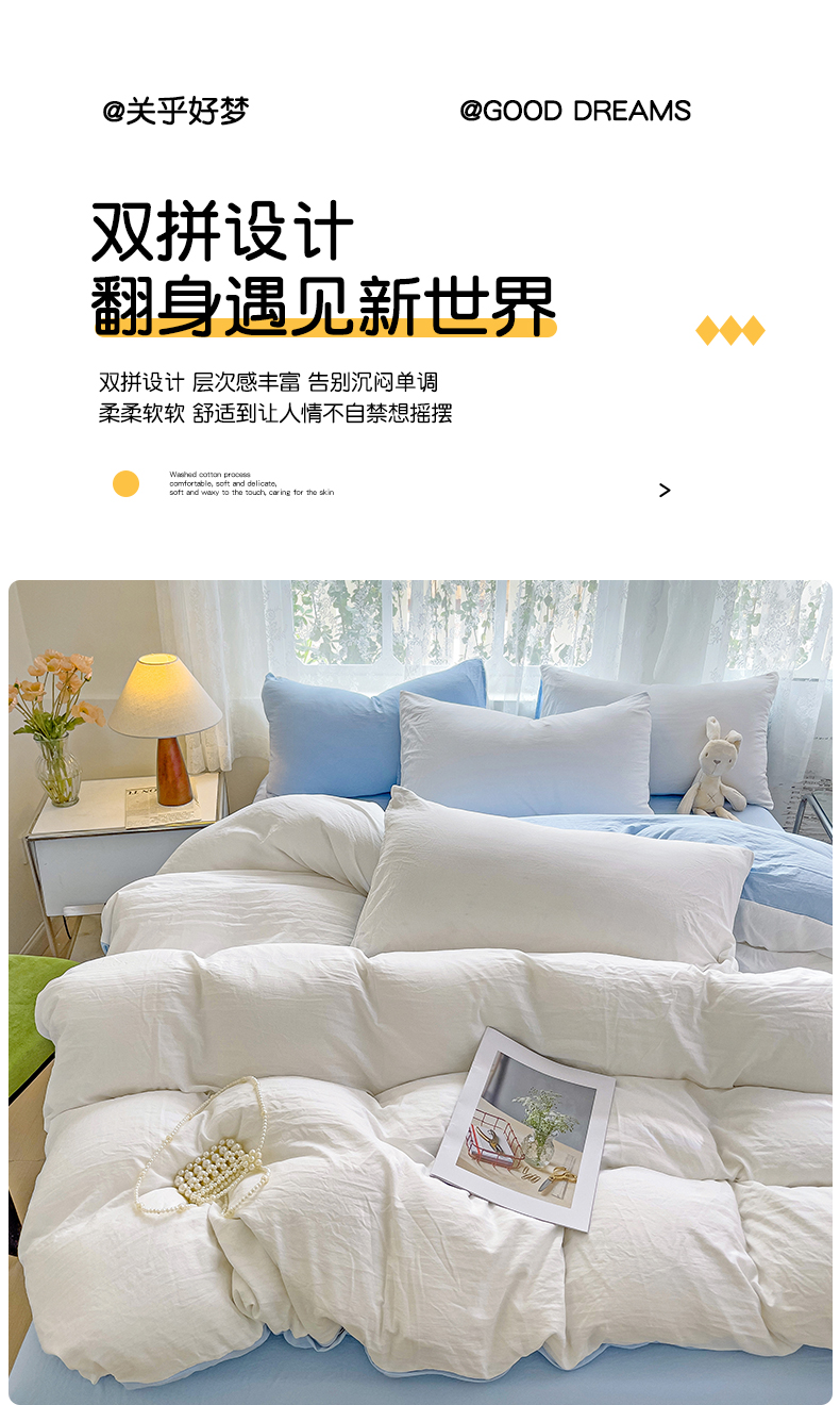 当前位置: 91家纺网 > 商品网购 > 床品套件 > 四件套 > 水洗棉四件套 > 韩巢家纺 2024新款ins风超柔褶皱亲肤水洗棉四件套 -纯色双拼系列(提供卖家秀) 水洗棉白蓝