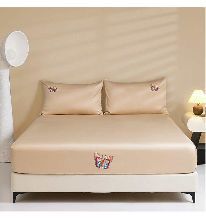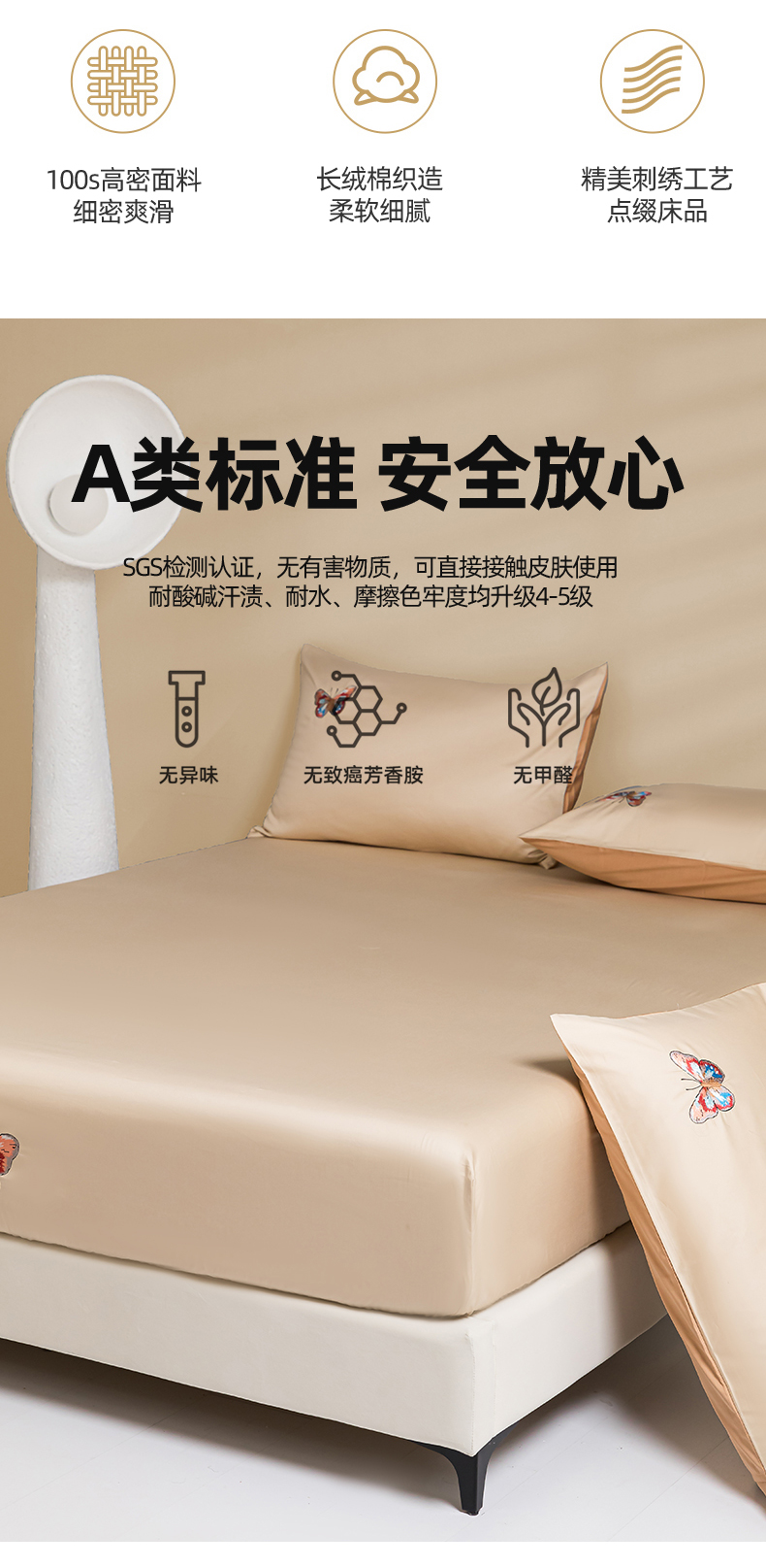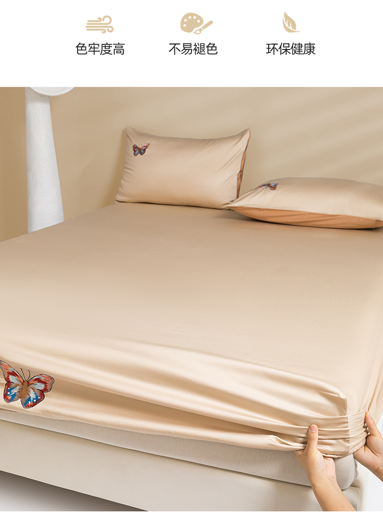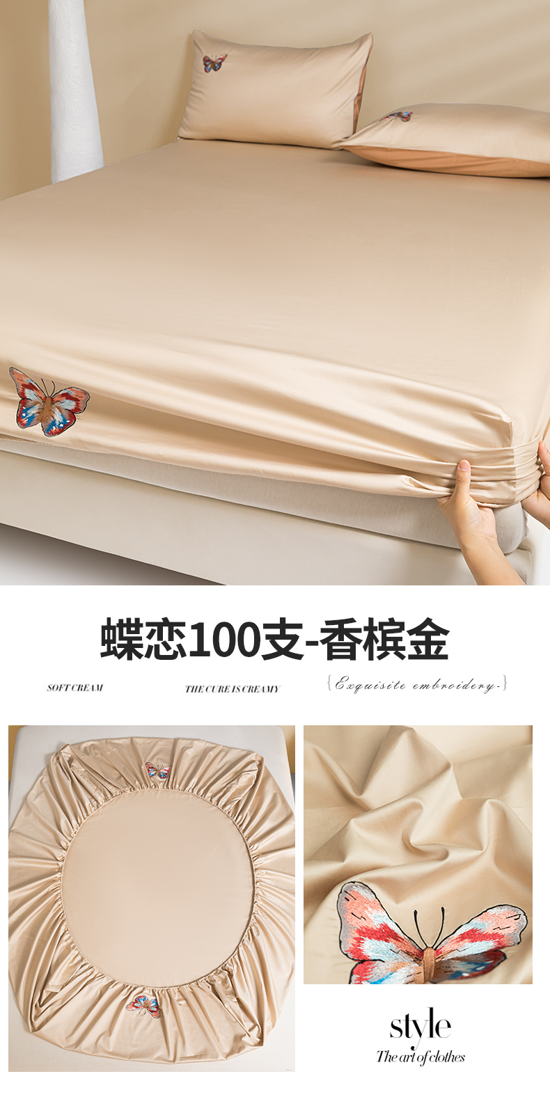 蓝米卡夫 2024新款A类100支全棉刺绣蝶恋系列单床笠三件套 蝶恋100支-香槟金