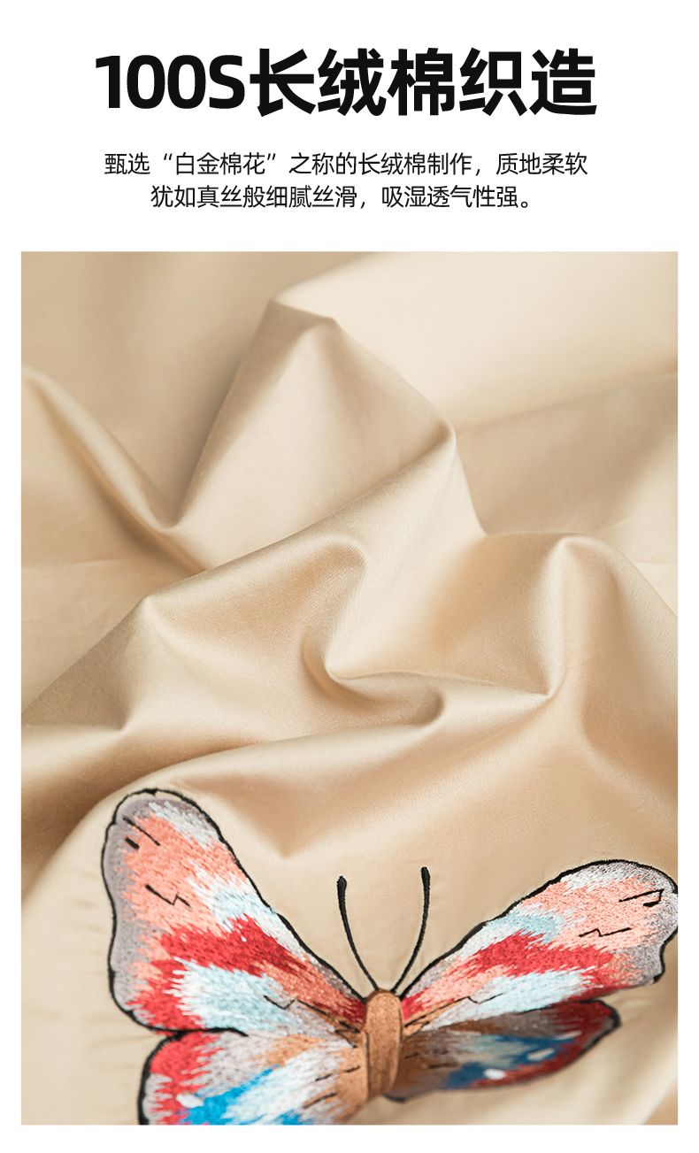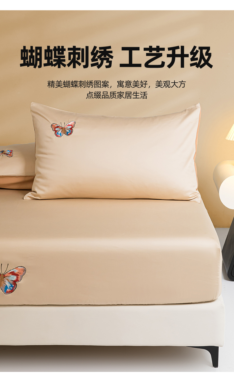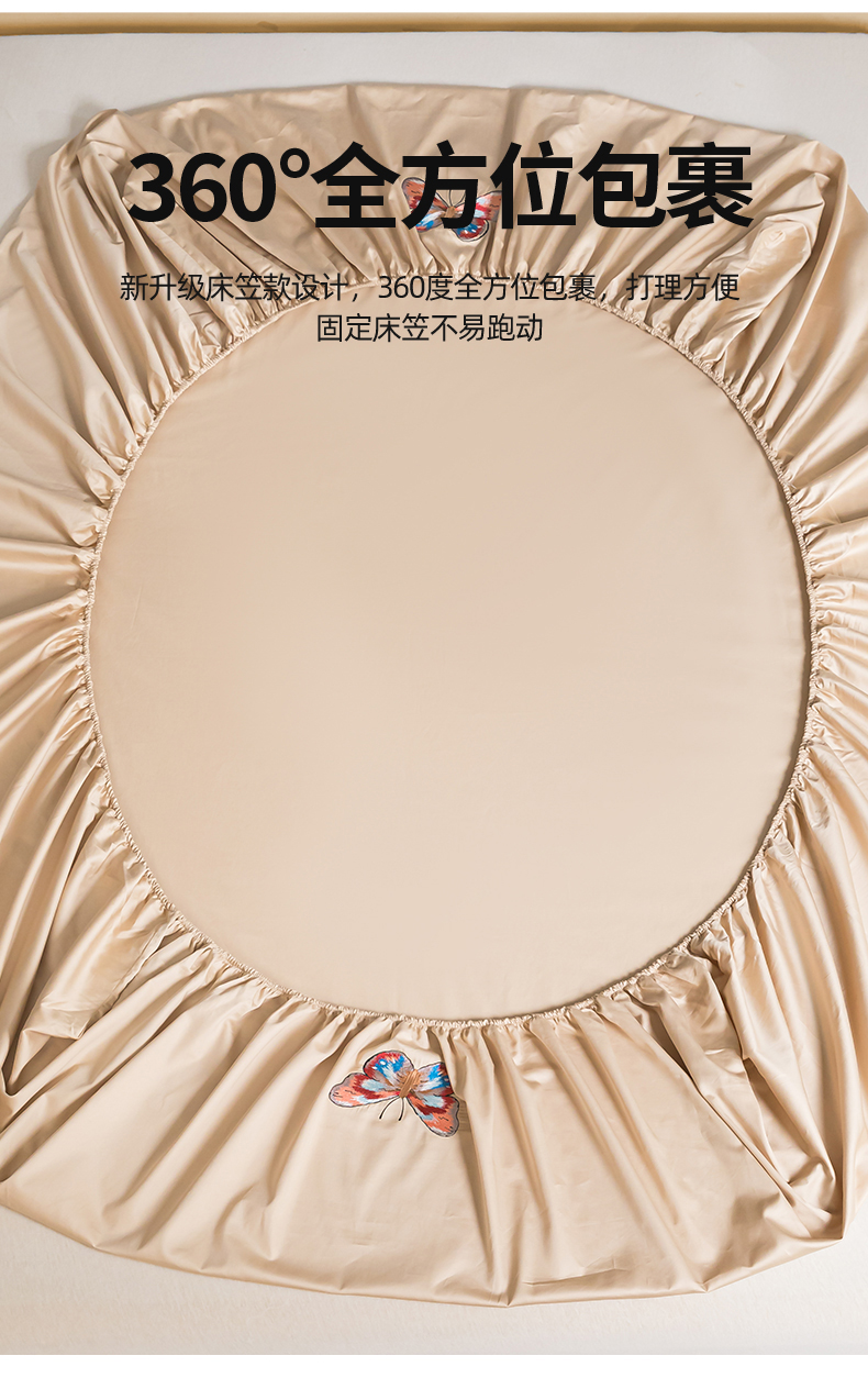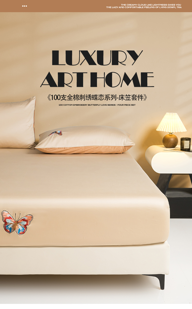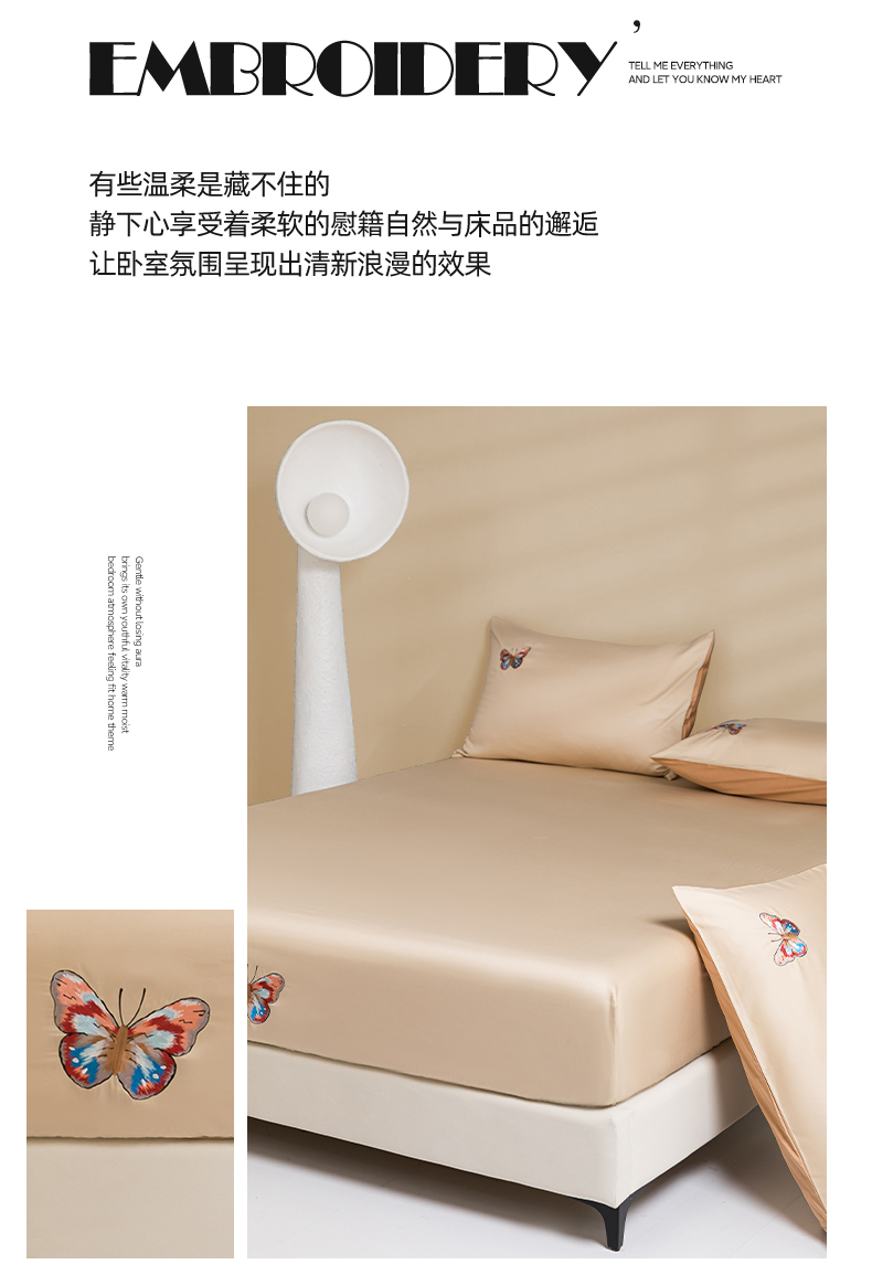 • 91家纺网 家纺一手货源 找家纺 蓝米卡夫 2024新款A类100支全棉刺绣蝶恋系列单床笠三件套 蝶恋100支-香槟金