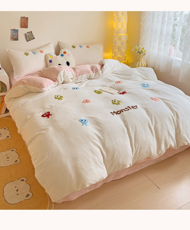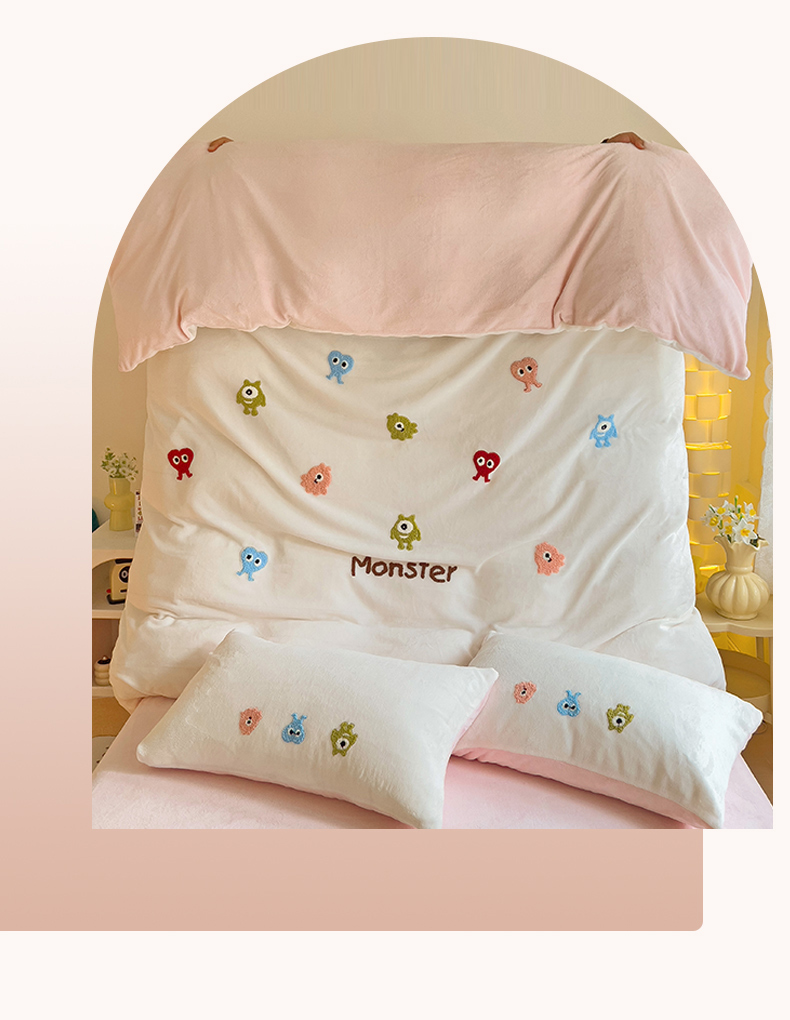 当前位置: 91家纺网 > 商品网购 > 床品套件 > 四件套 > 毛巾绣四件套 > 梦之岛 2024新款多巴胺小怪兽可爱牛奶绒毛巾绣四件套 小怪兽-白粉
