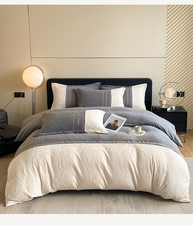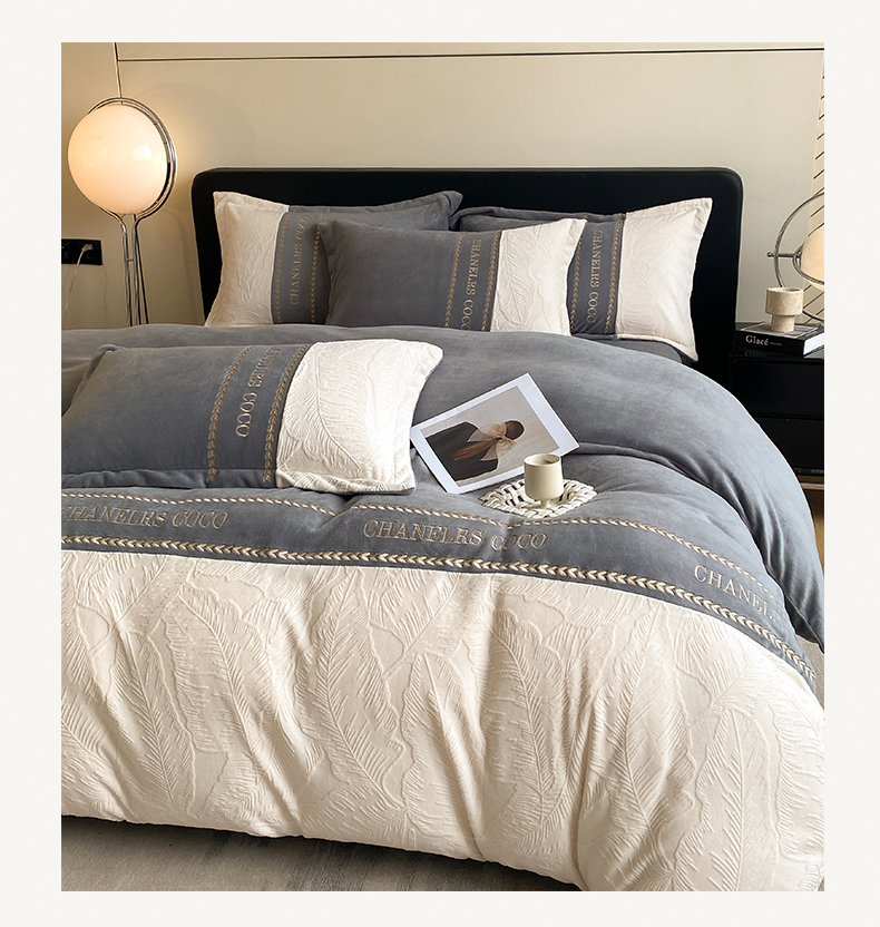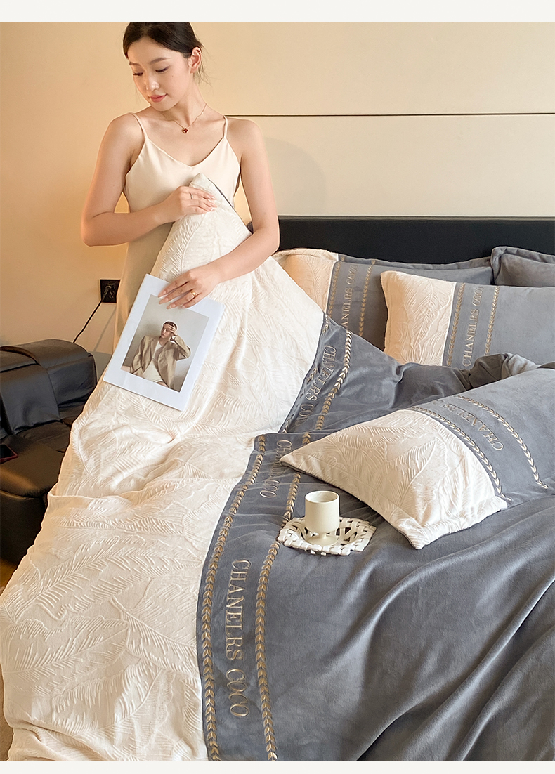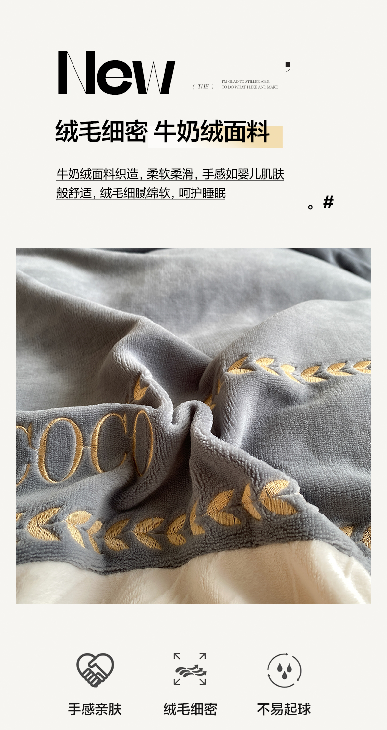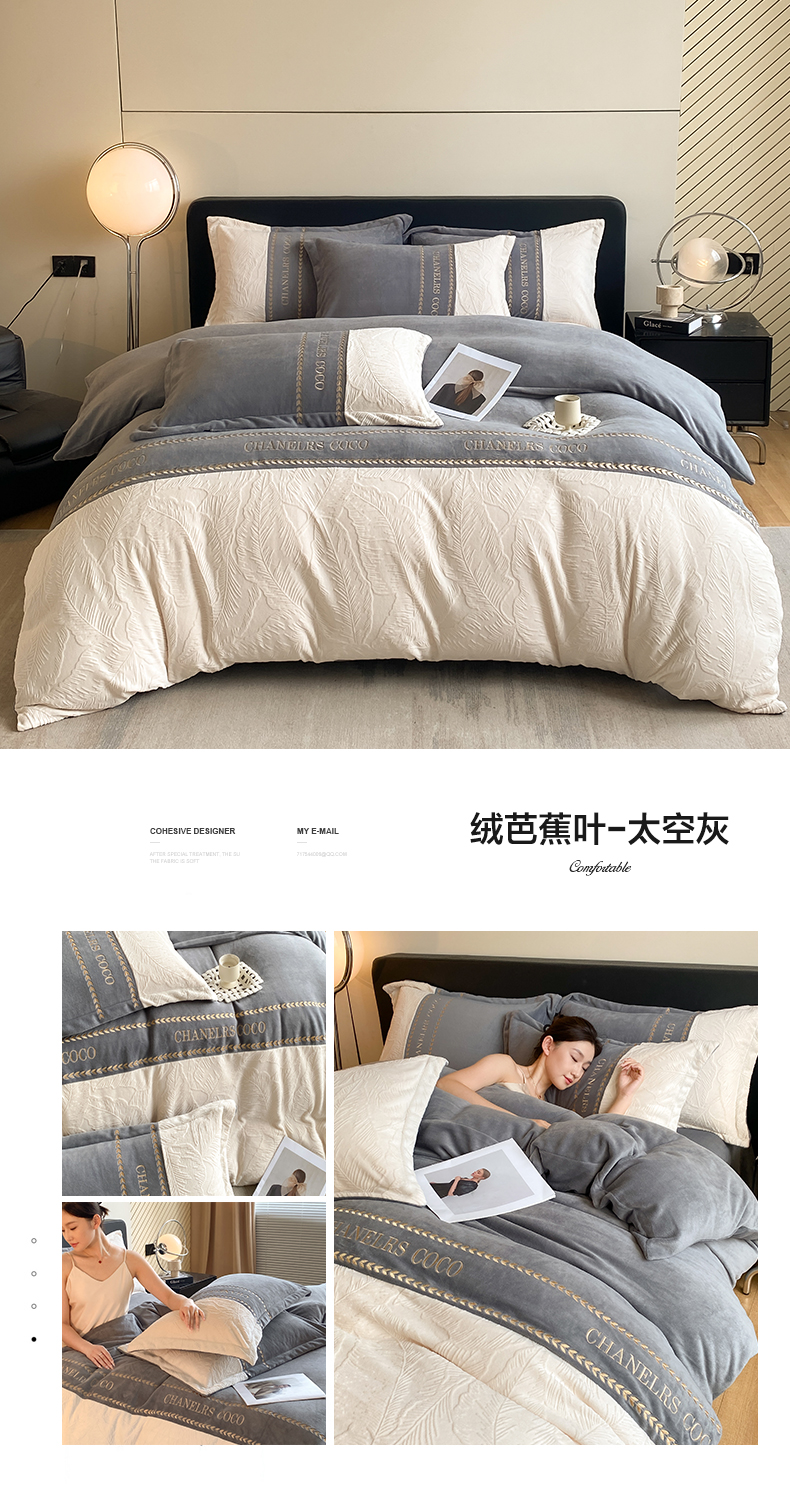 商品名称:宇航家纺 2025新款轻奢风芭蕉叶牛奶绒绣花四件套(提供买家秀) 绒芭蕉叶太空灰