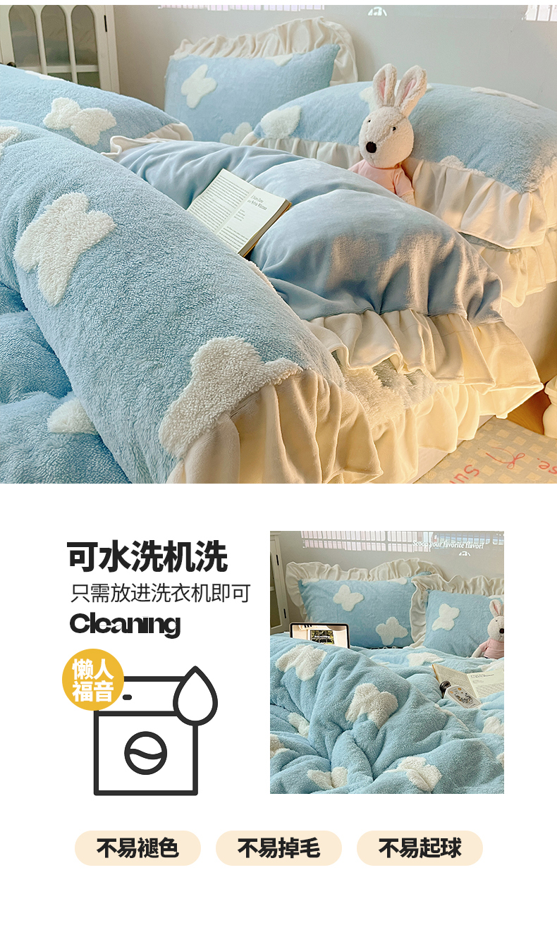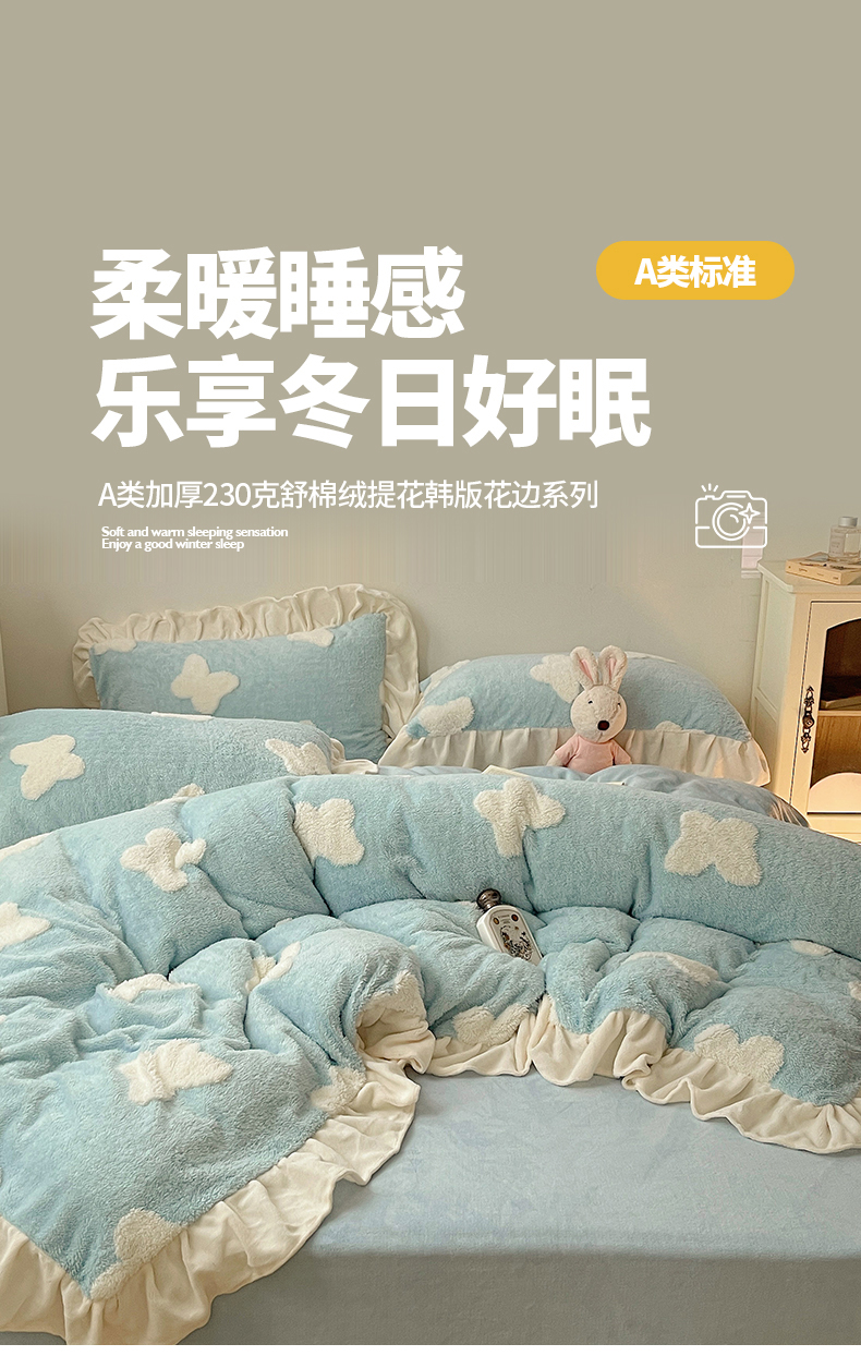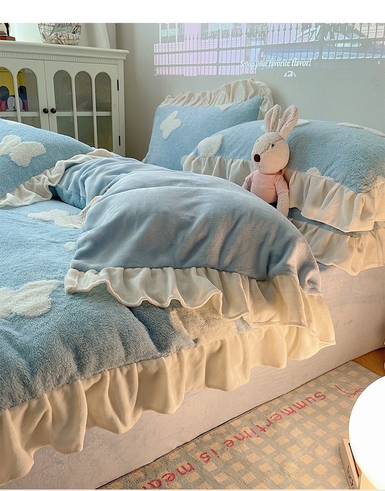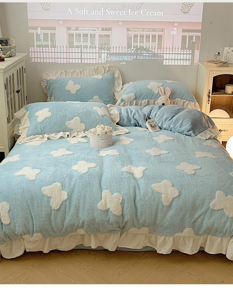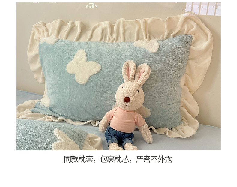 当前位置: 91家纺网 > 商品网购 > 床品套件 > 四件套 > 牛奶绒四件套 > 桃子家居 2024新款A类加厚230克色纱提花蝴蝶少女花花韩版花边舒棉绒牛奶绒系列四件套 舒棉绒花边-浪漫蝴蝶蓝白