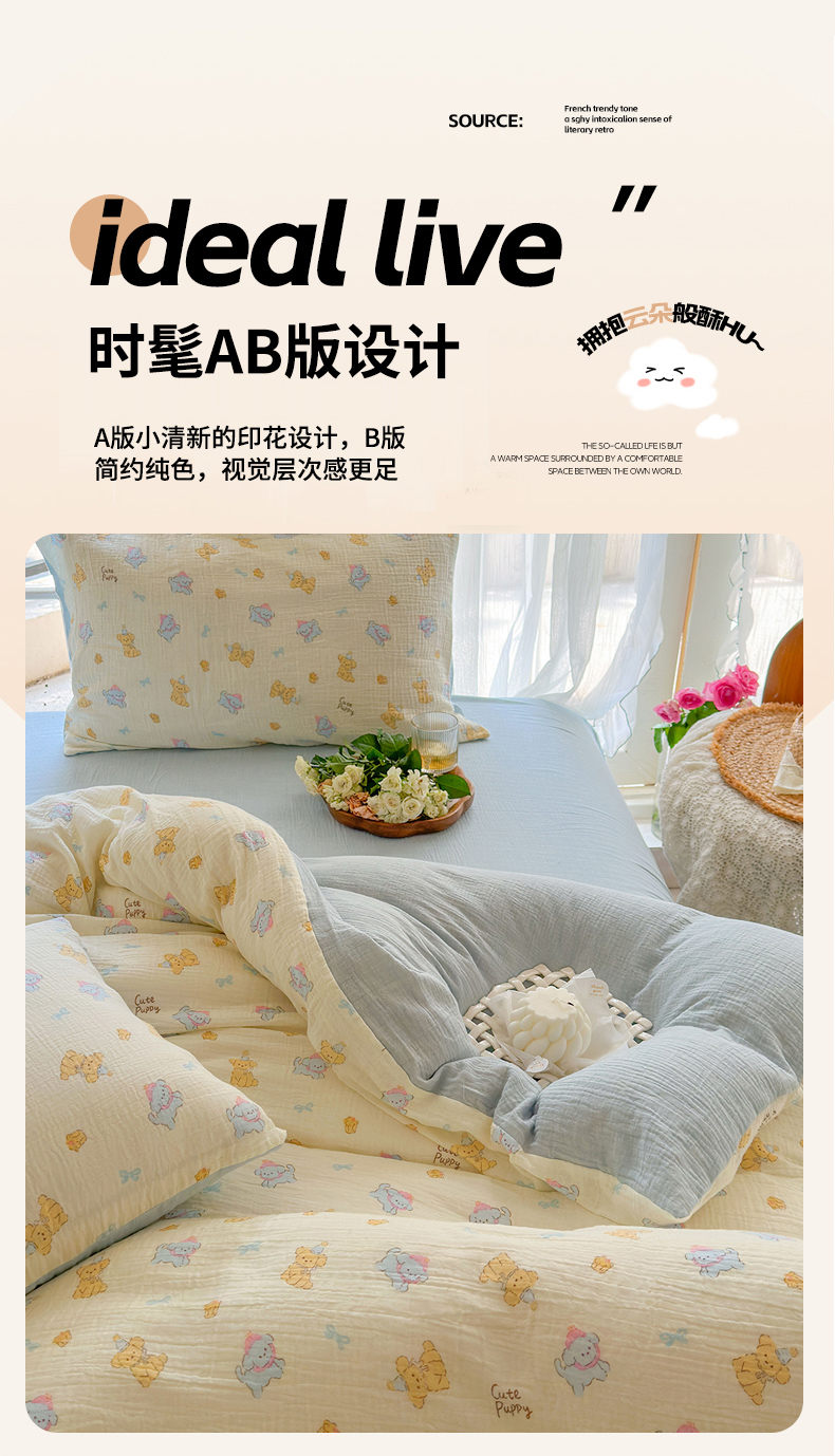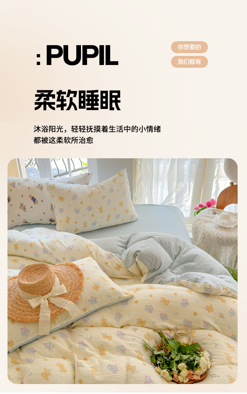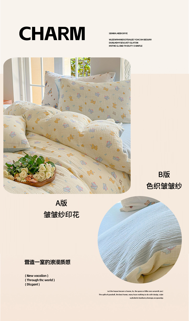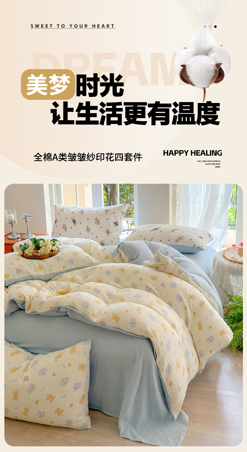(总)木楌 2025新款全棉A类皱皱纱印花四件套,彼得熊,春泥,丁香-绿,丁香-紫,哈尼,海皮狗,涵雅,赫本熊,可心兰,可心咖,兰菲,美芽,木兰,奶油爱心,奶油波点,宁静,浅汐,沁香,微笑,星月,宾果熊,初颜,璎珞,花与兔,洛依,清新草莓,芮芮花,小彩蘑,小恐龙,小熊猫,幸运草,樱桃,知音,紫萱,小南国