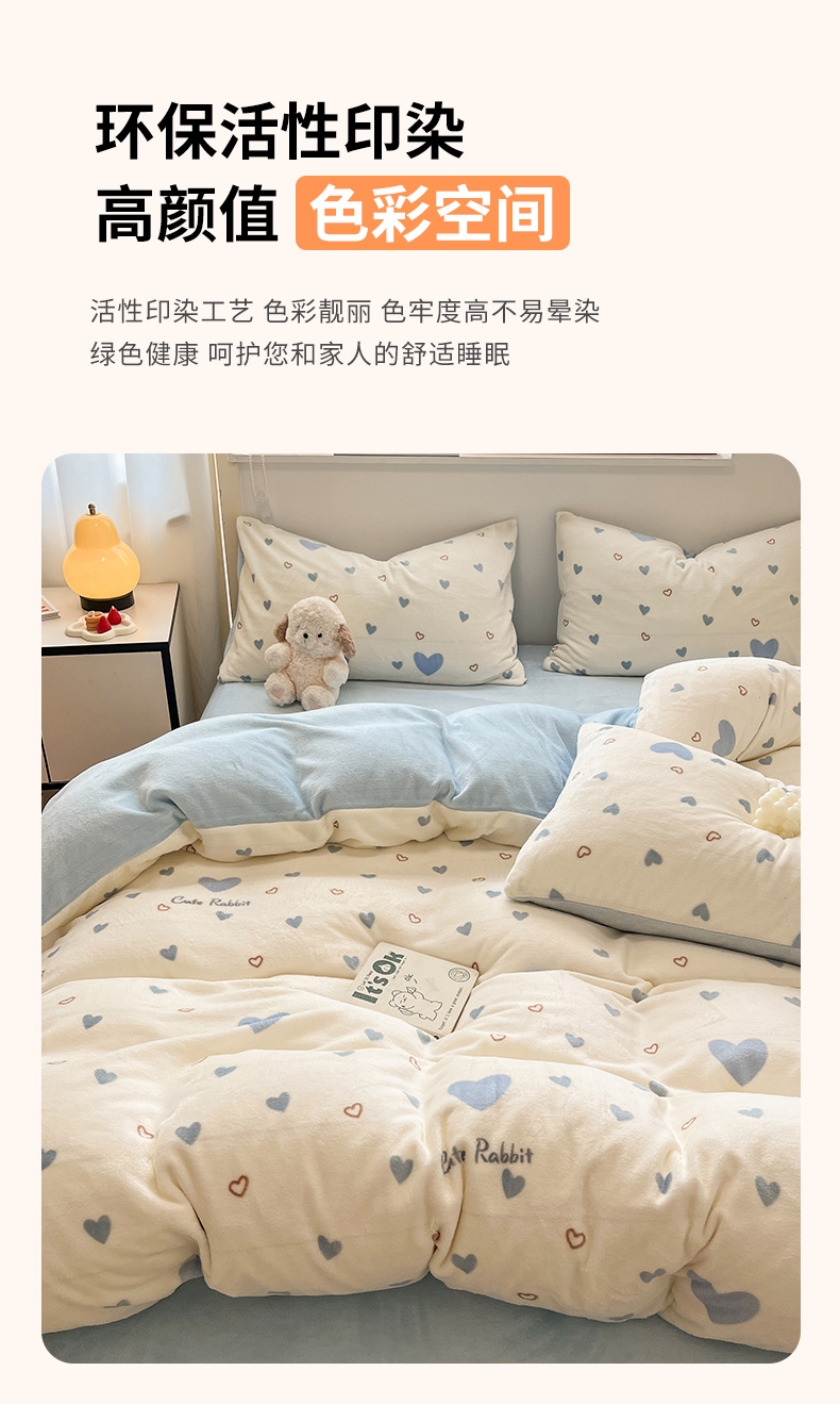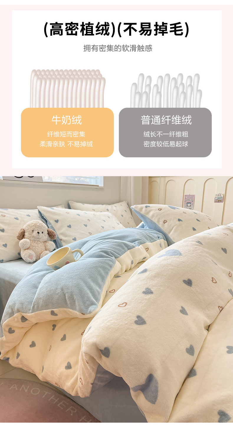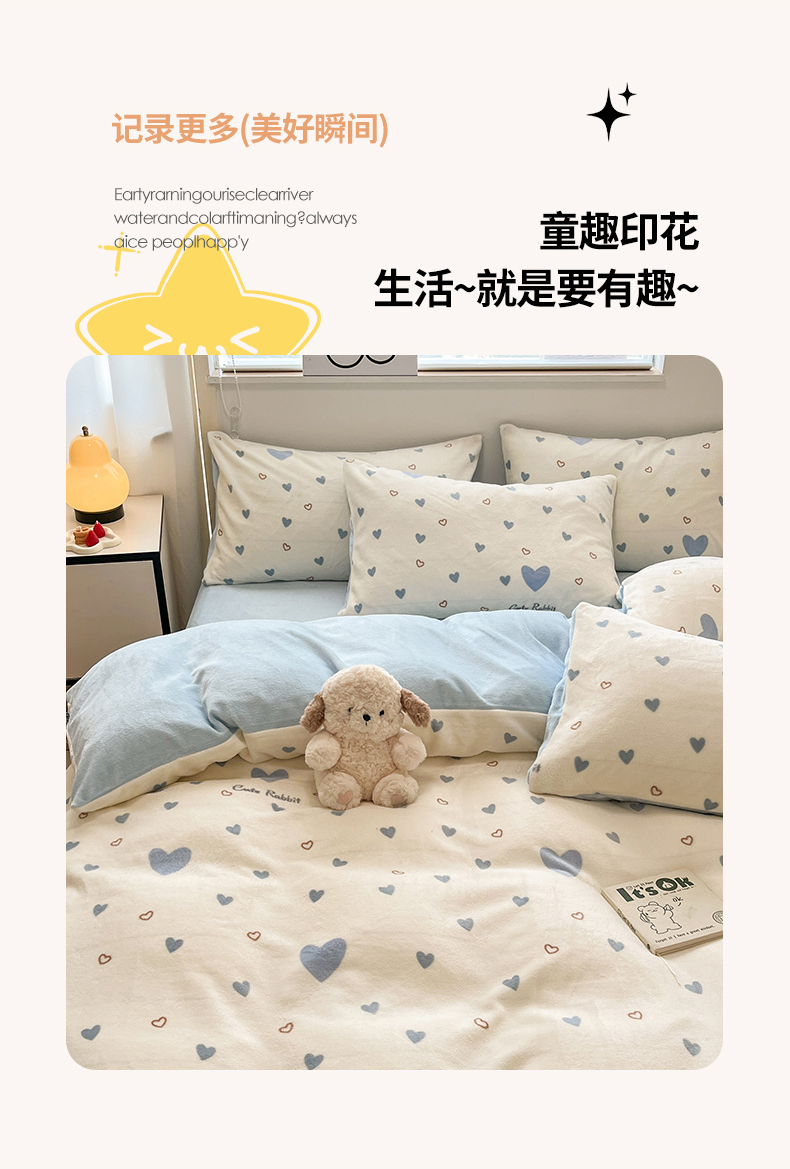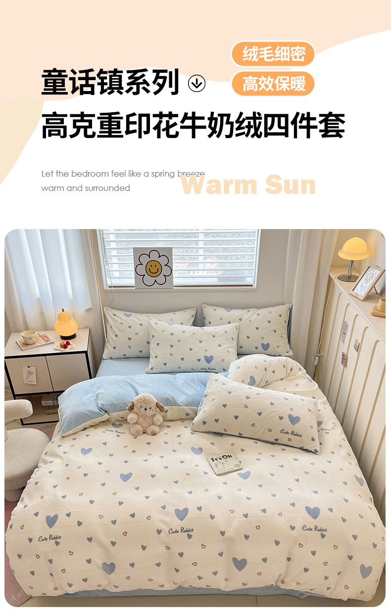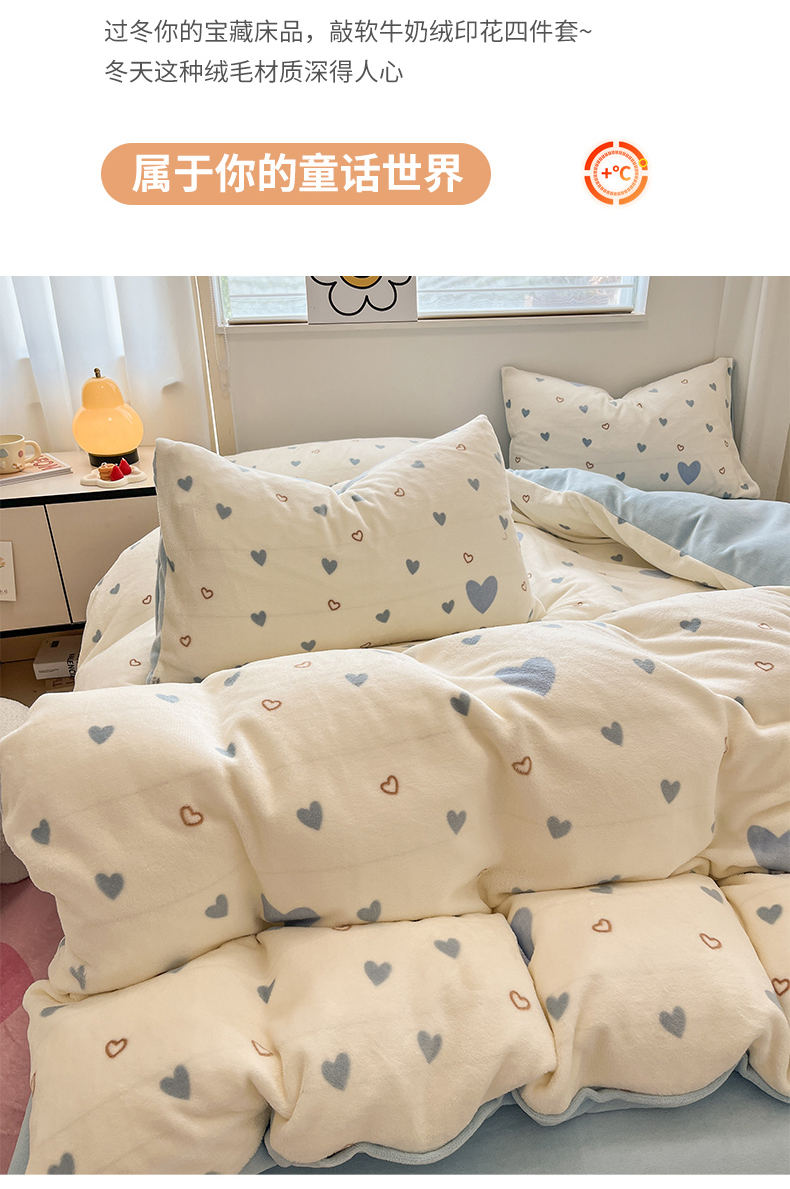 商品名称:捌月 2024新款童话镇系列高克重印花牛奶绒四件套卡通小清新加厚保暖绒套件 心动