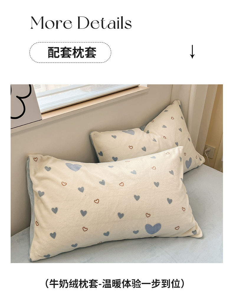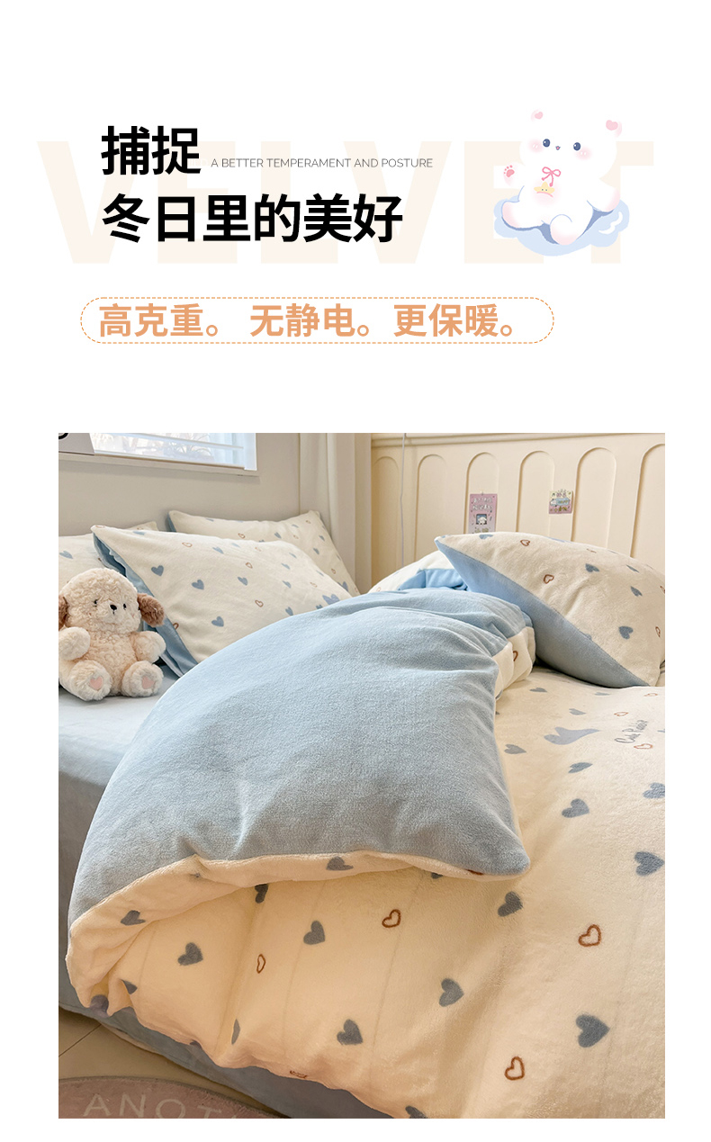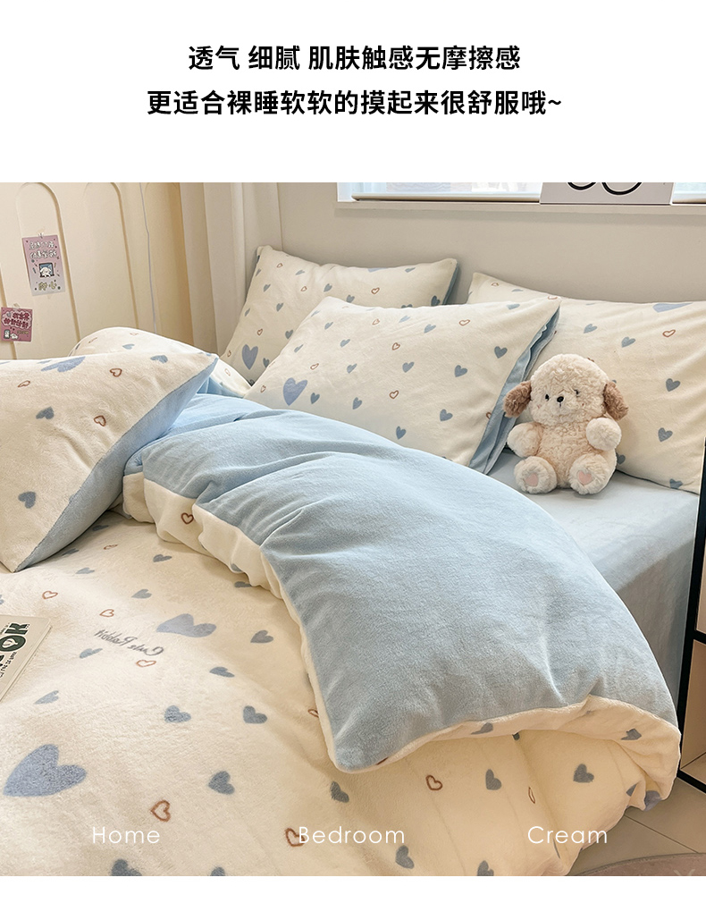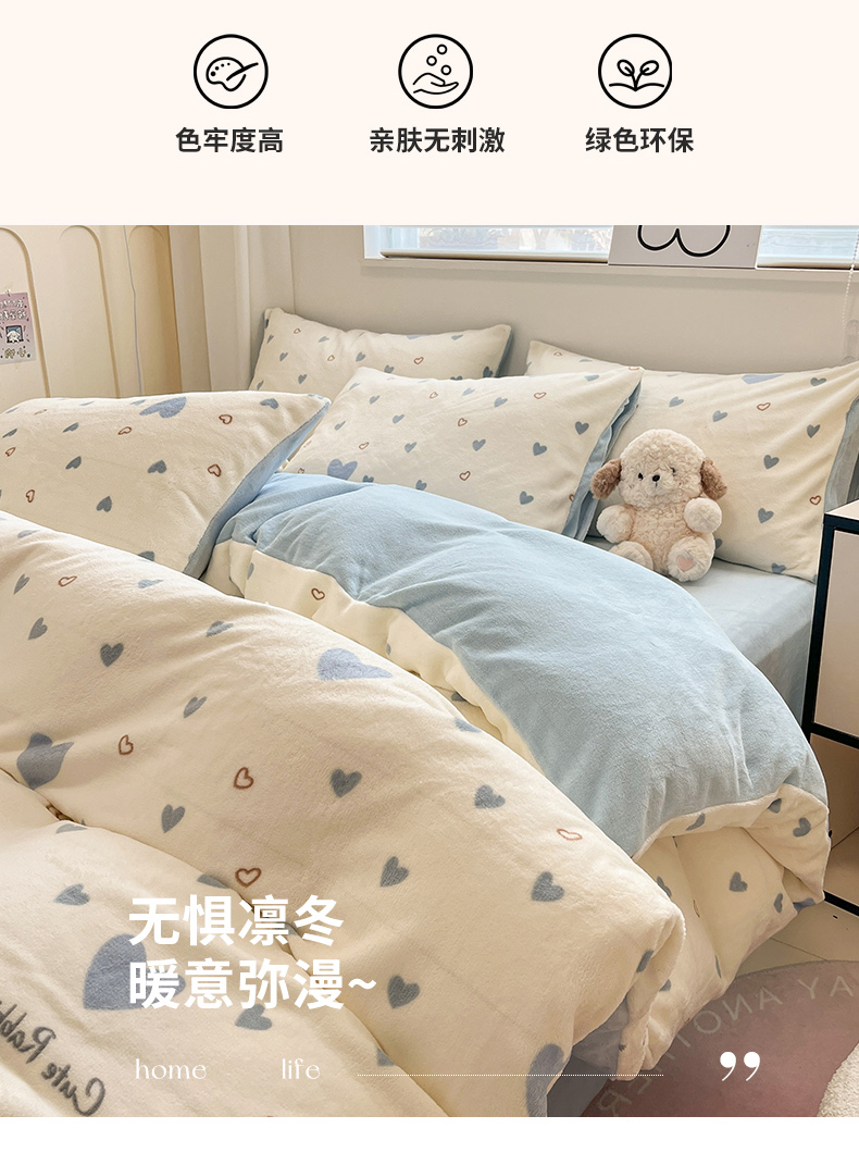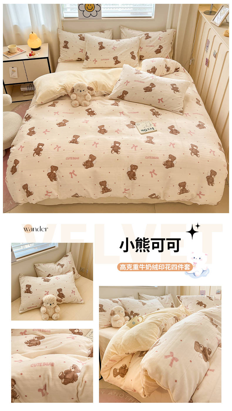 商品名称:捌月 2024新款童话镇系列高克重印花牛奶绒四件套卡通小清新加厚保暖绒套件 心动