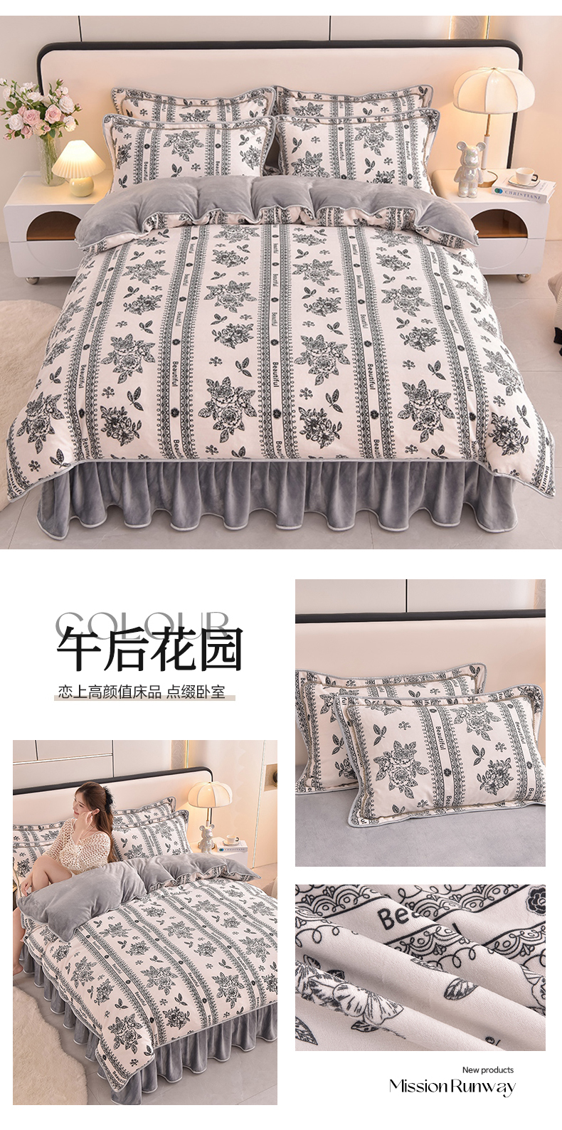 商品名称:富之航 2024新款8-9斤高克重印花牛奶绒四件套保暖绒套件直播爆款午后花园