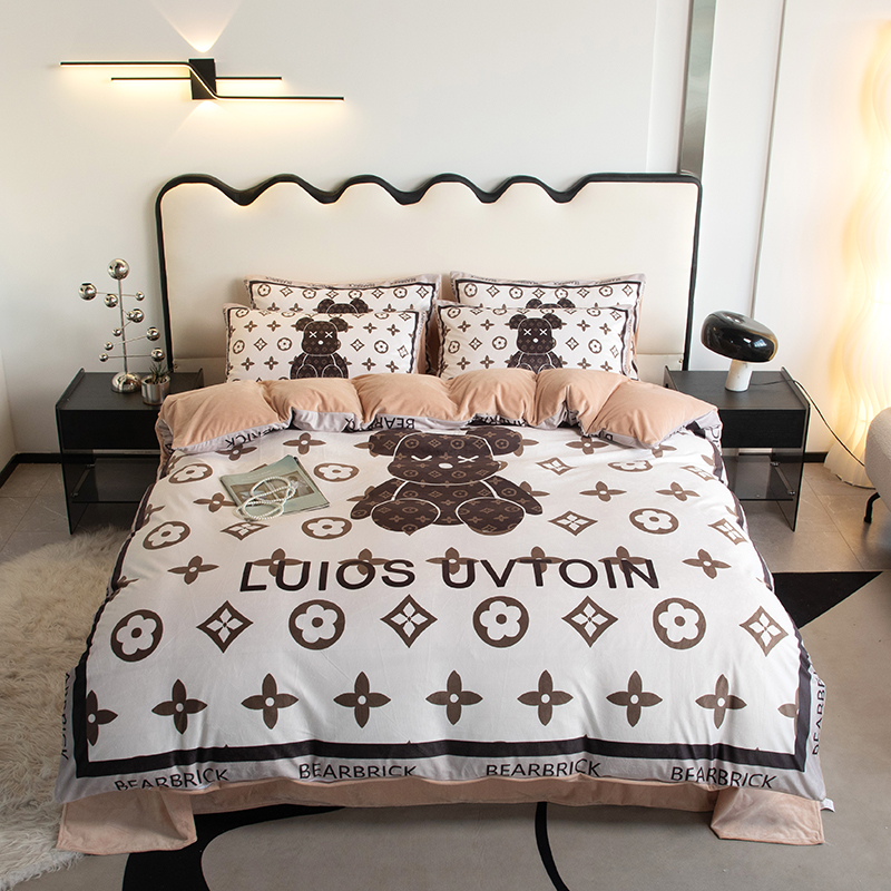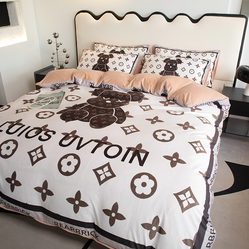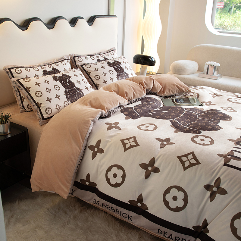 商品名称:色鬼布艺 2024新款婴儿绒数码印花牛奶绒四件套仿大牌直播爆款网红款 熊仔咖