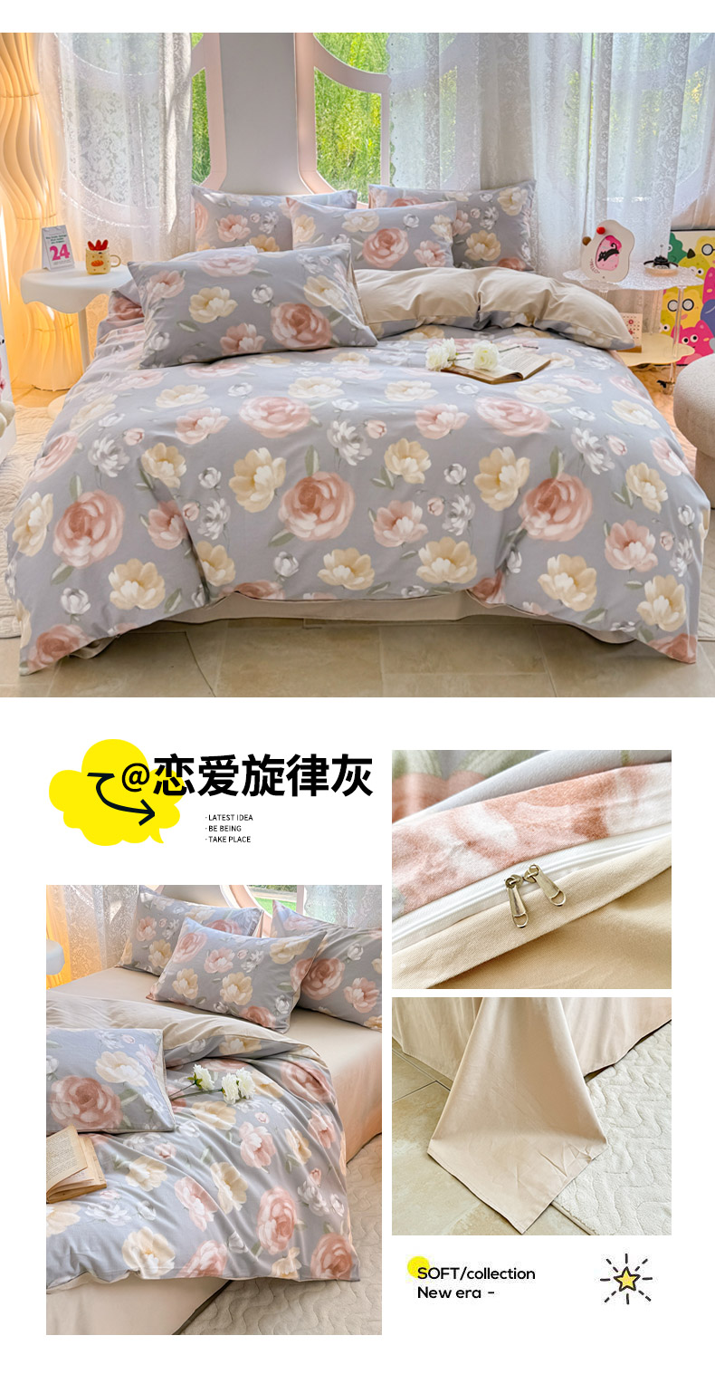 千朵 2024新款全棉磨毛小清新印花四件套 恋爱旋律灰