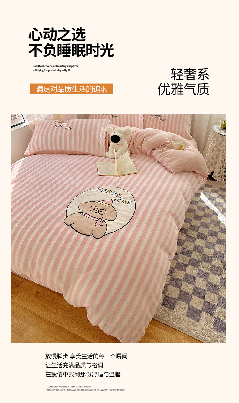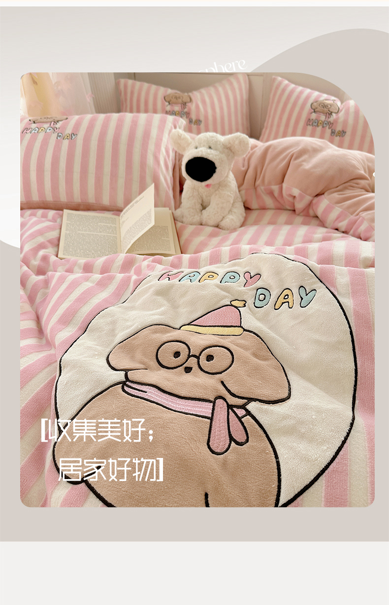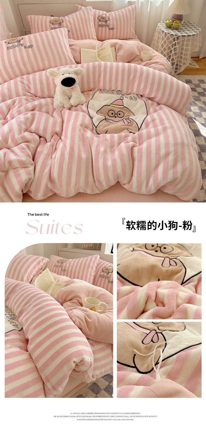 丽涵家纺 2024秋冬新品牛奶绒作色剪花贴布绣四件套 软糯的小狗-粉