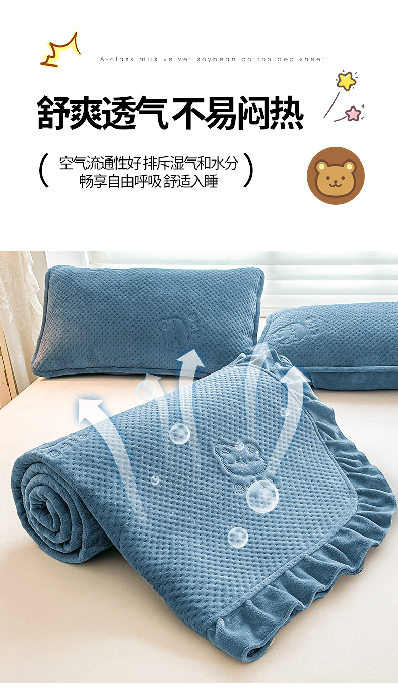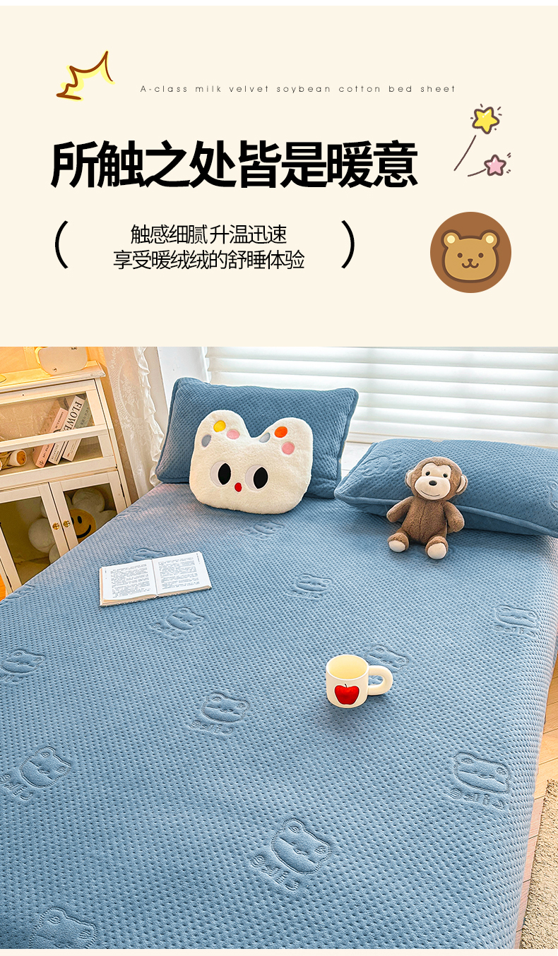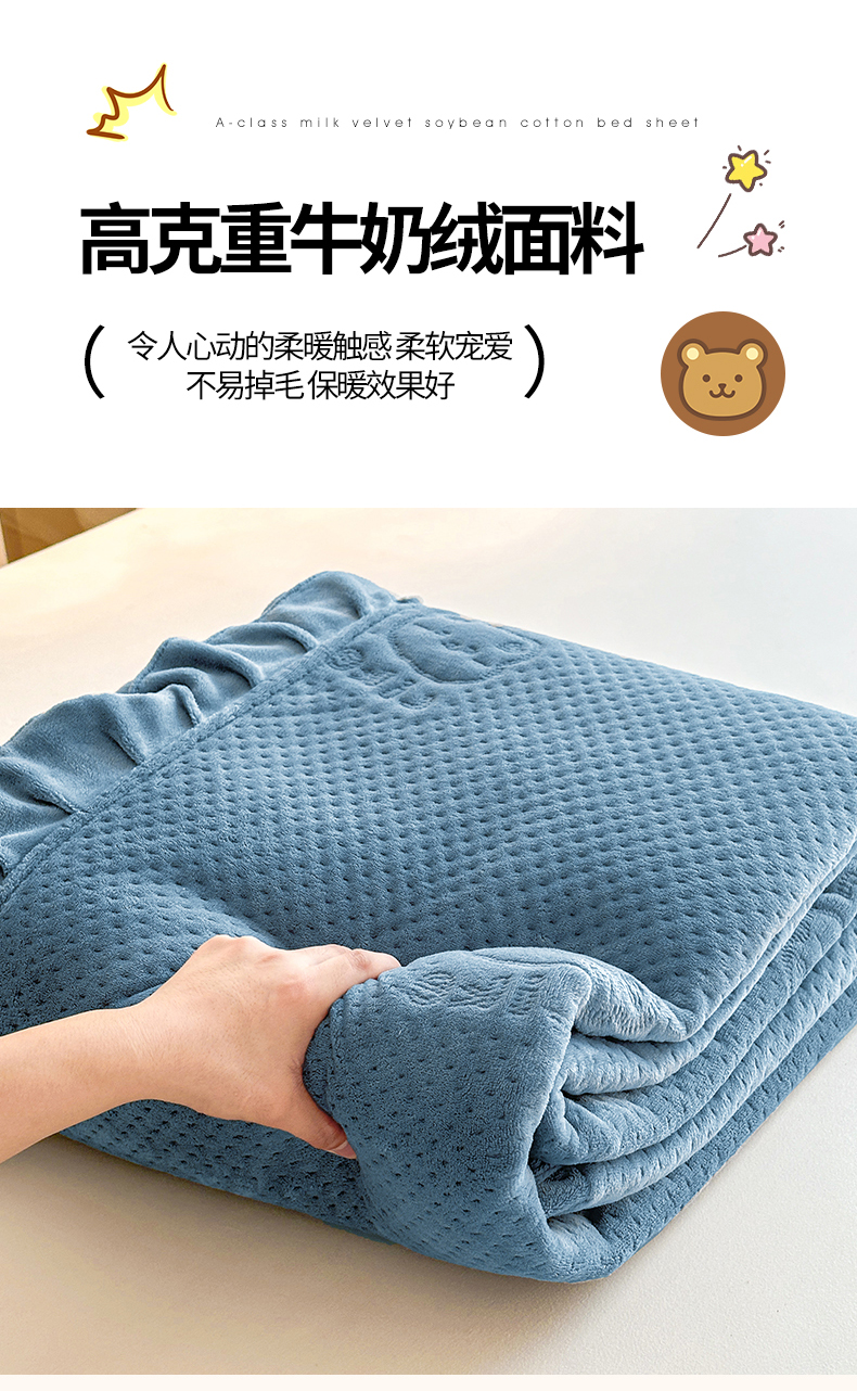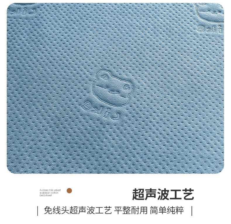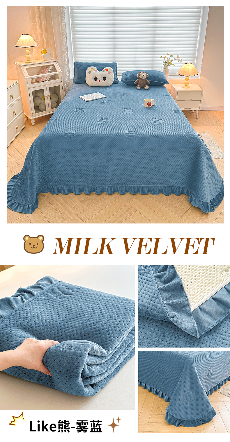 商品名称:居眠 2024新款A类牛奶绒like小熊系列大豆夹棉床单 Like熊-雾蓝