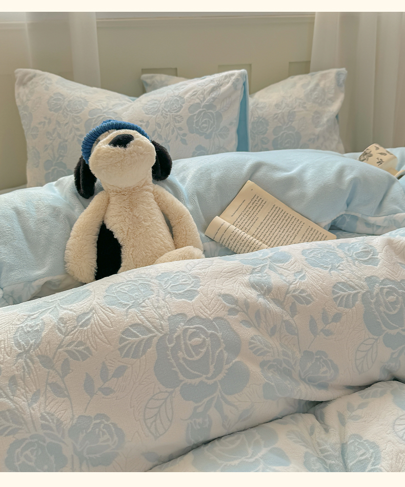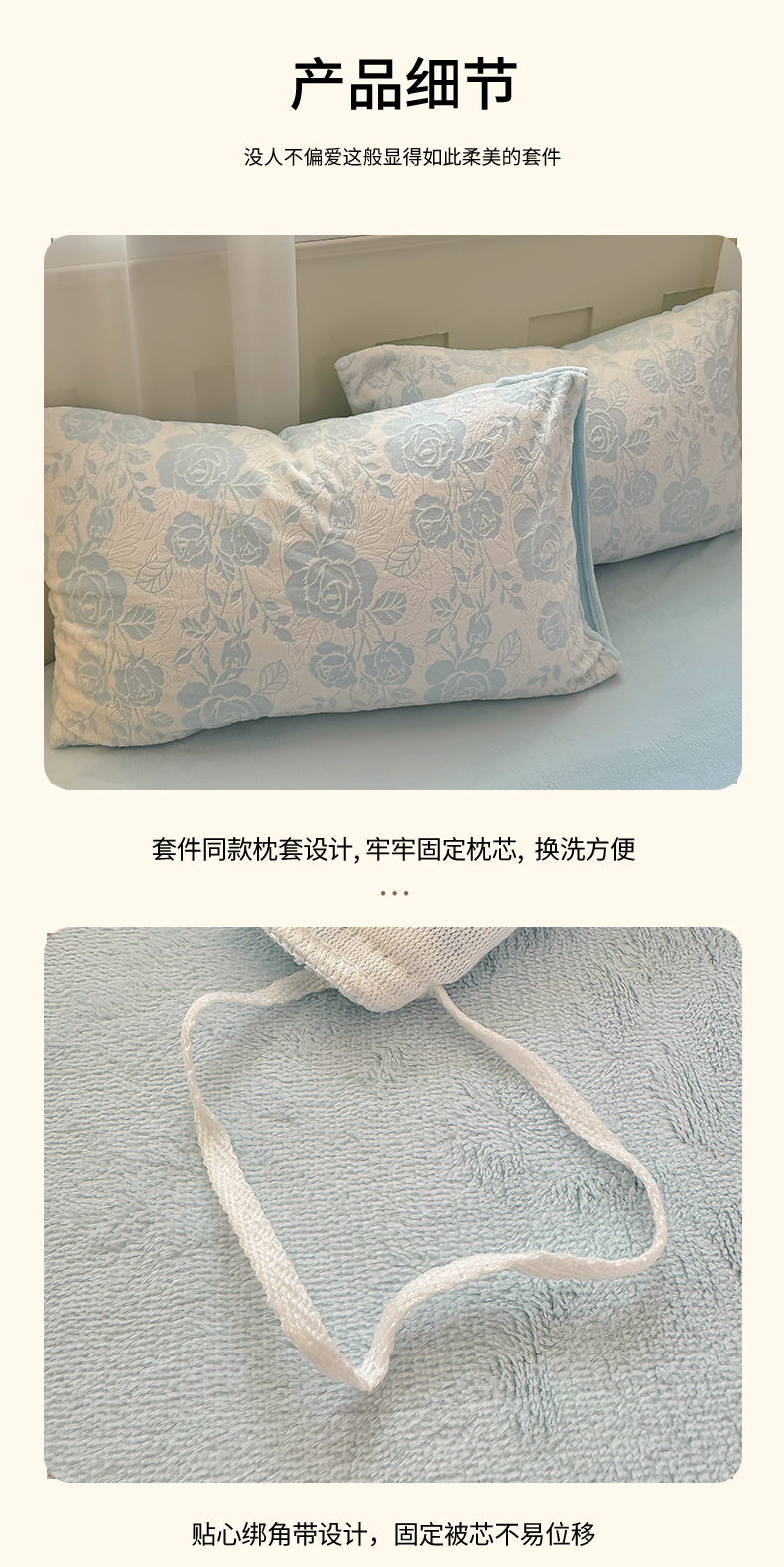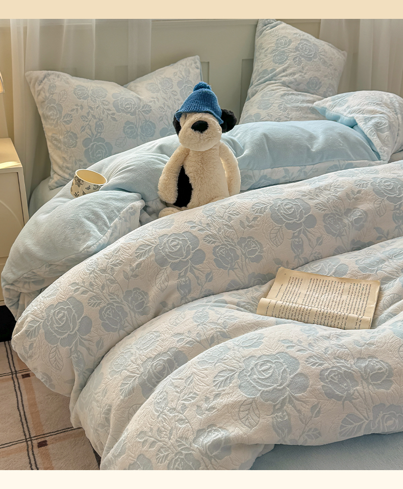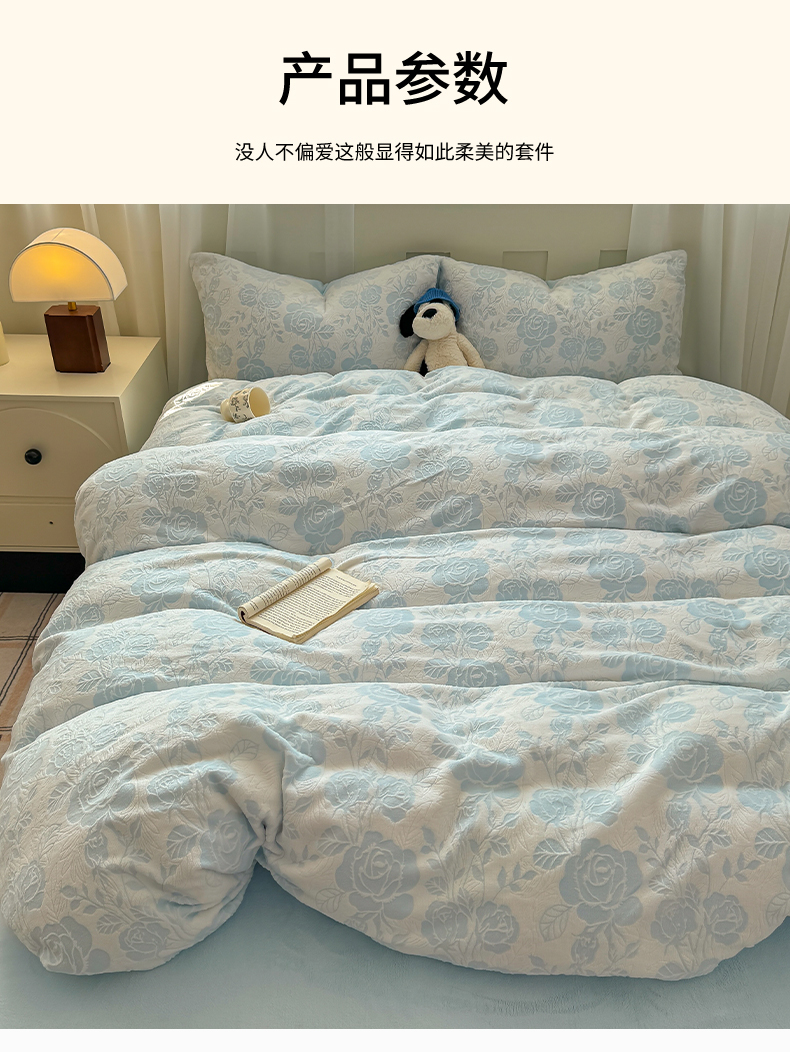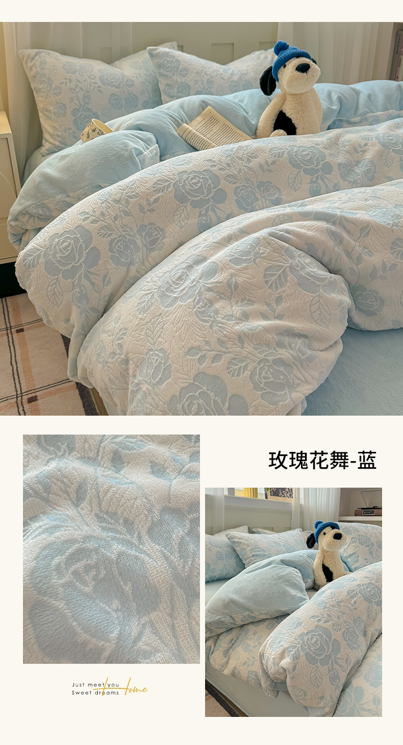 当前位置: 91家纺网 > 商品网购 > 床品套件 > 四件套 > 牛奶绒四件套 > 繁花家居 2024新款雕花绒牛奶绒静谧烂花系列四件套 玫瑰花舞-蓝