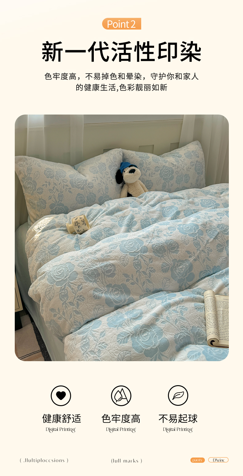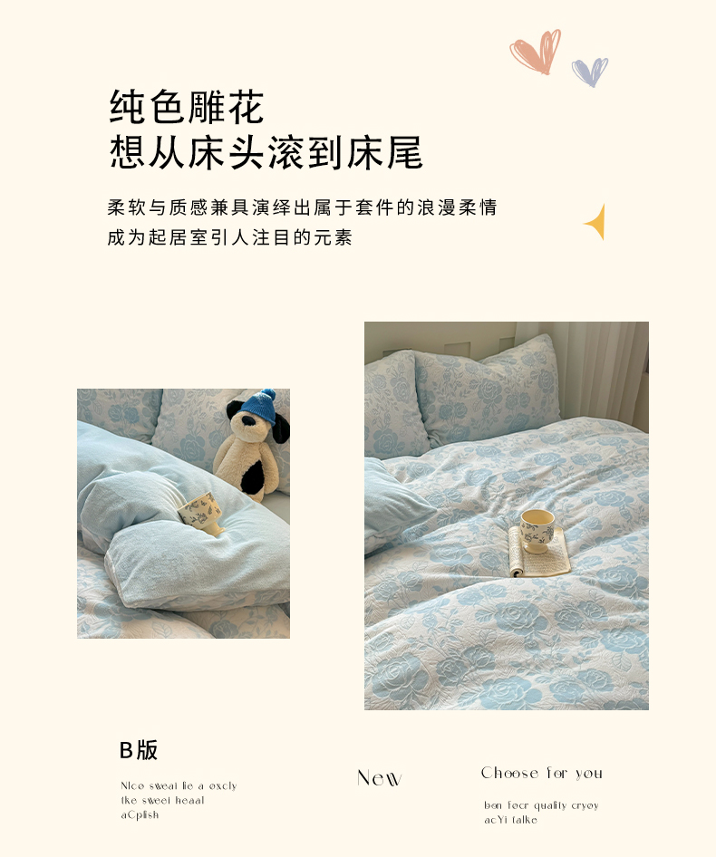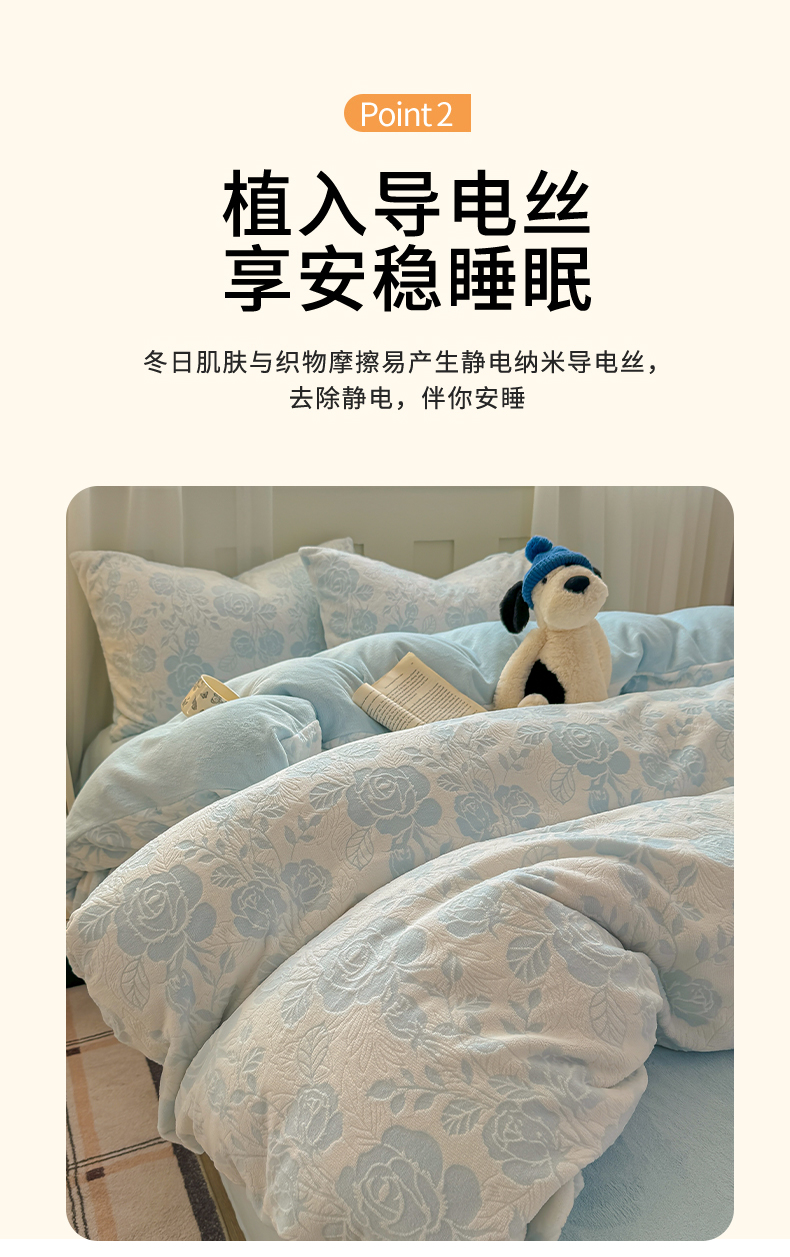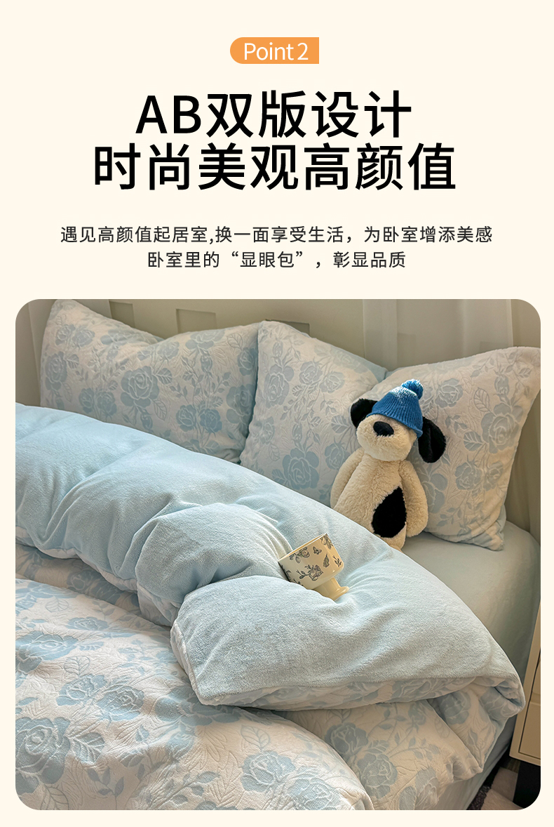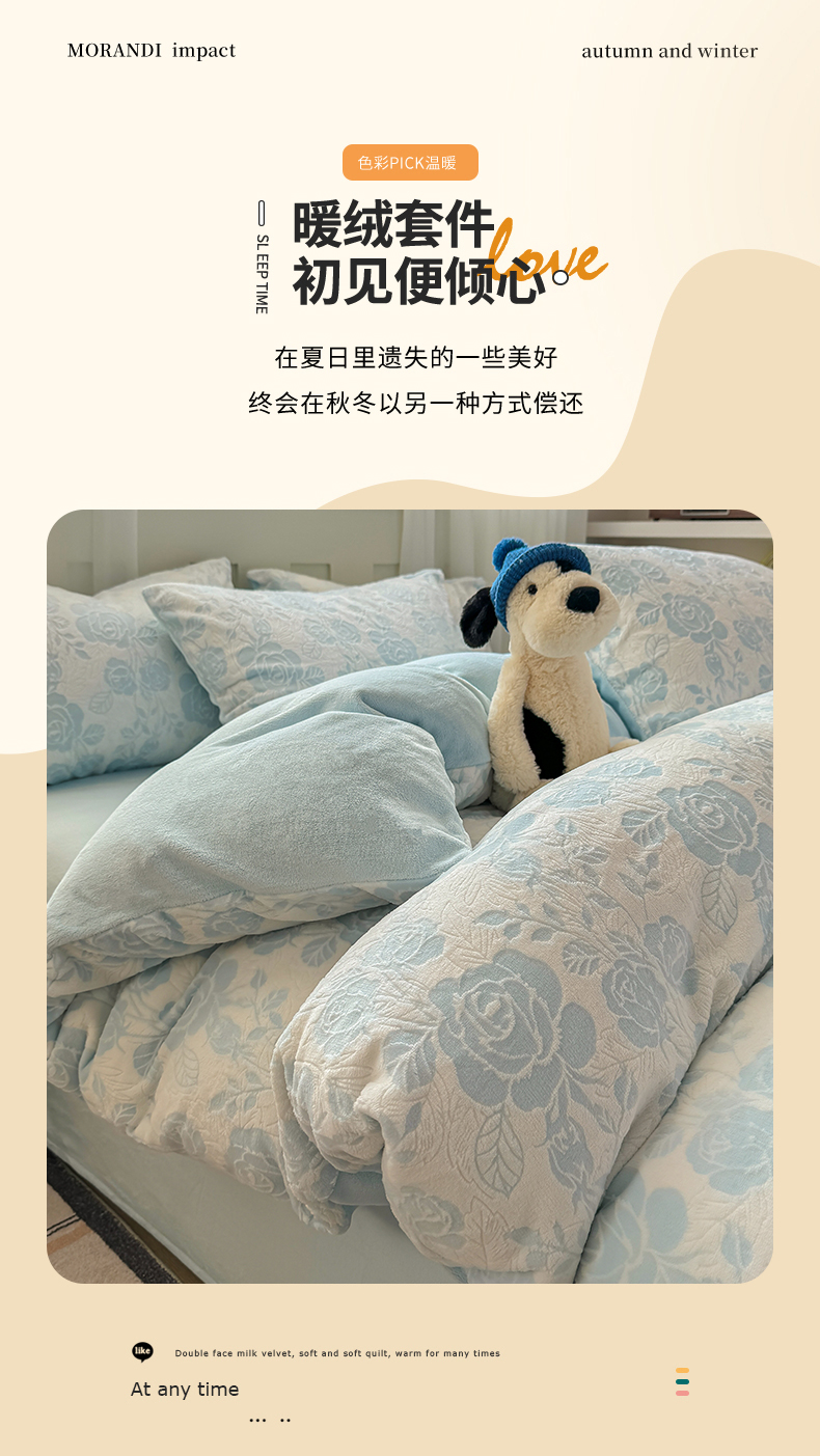 当前位置: 91家纺网 > 商品网购 > 床品套件 > 四件套 > 牛奶绒四件套 > 繁花家居 2024新款雕花绒牛奶绒静谧烂花系列四件套 玫瑰花舞-蓝