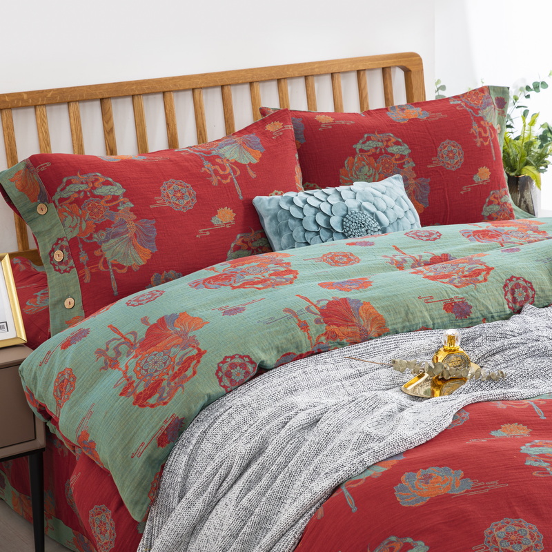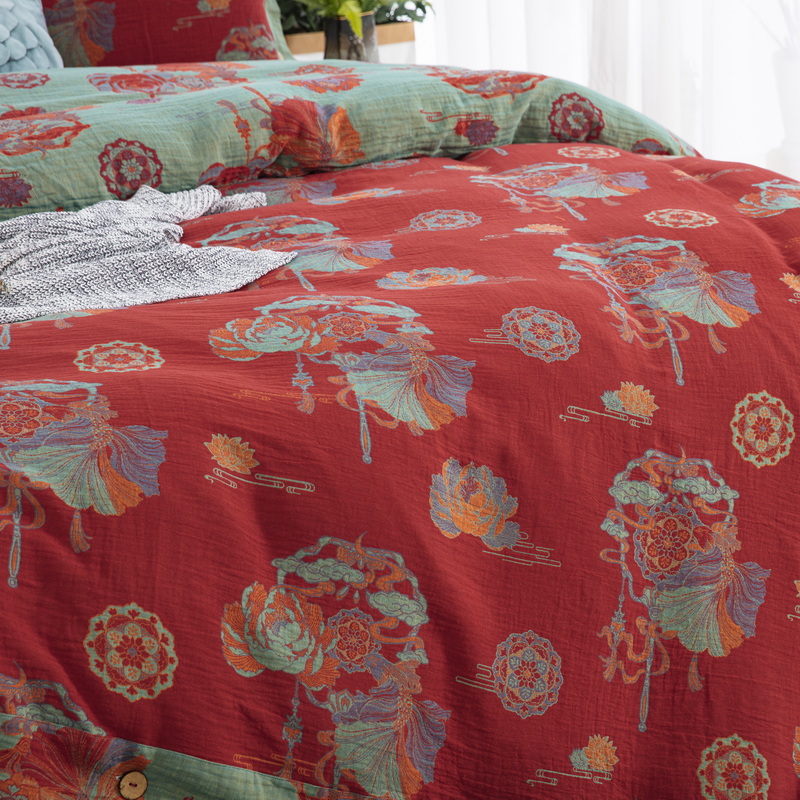 商品名称:鲁爱 2025新款全棉色织双层纱纽扣款四件套 荷塘月色