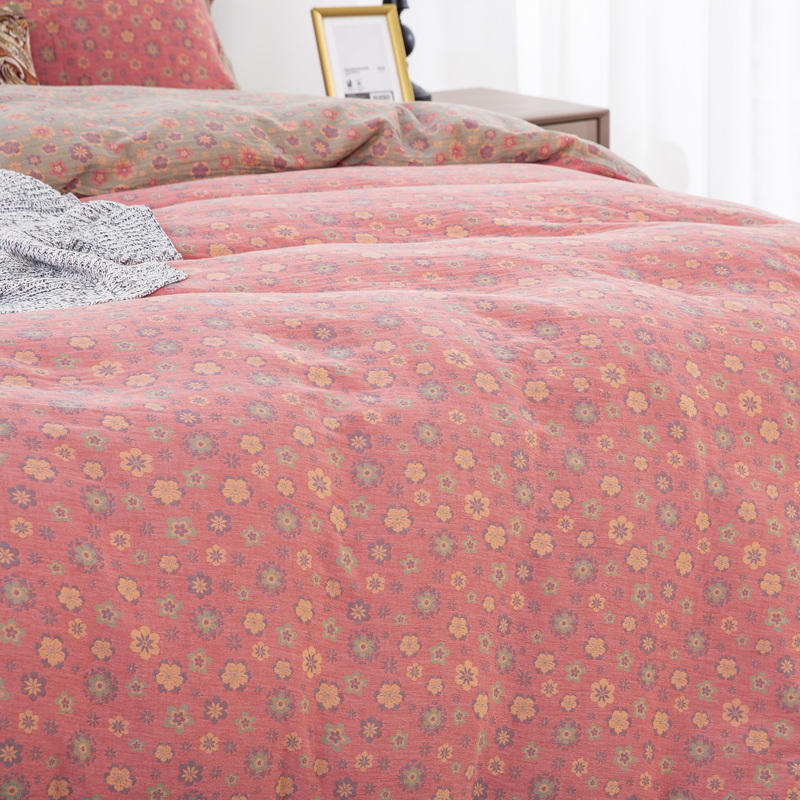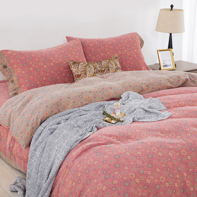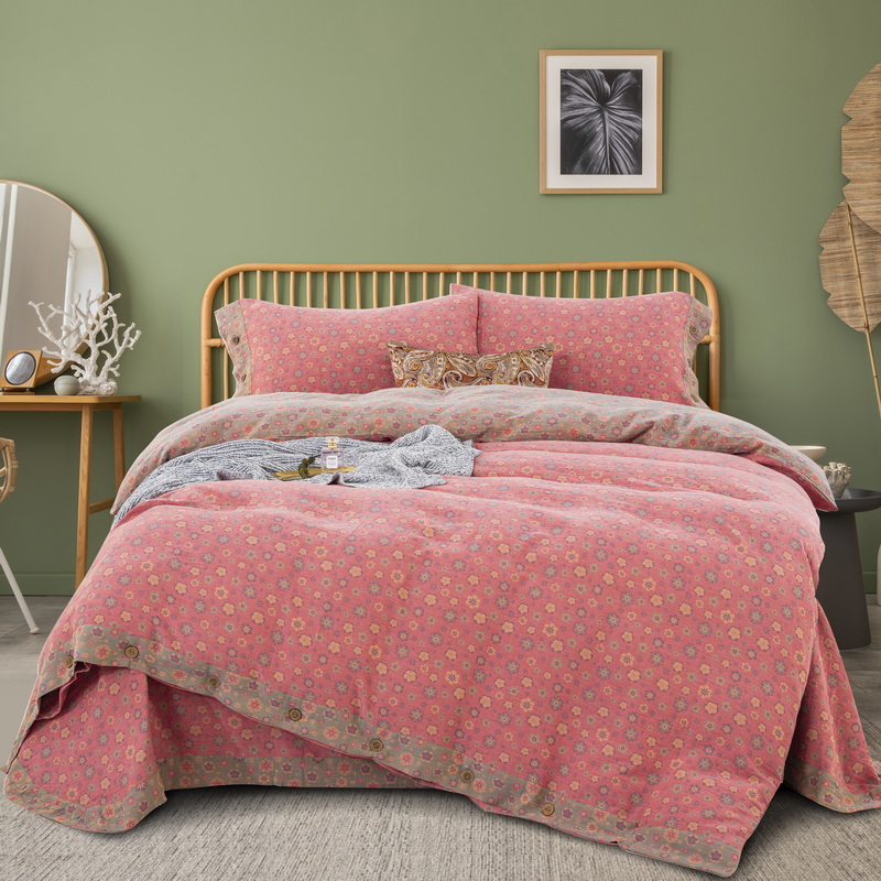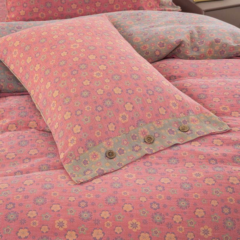 鲁爱 2024新款全棉色织双层纱纽扣款四件套 花香四溢-粉