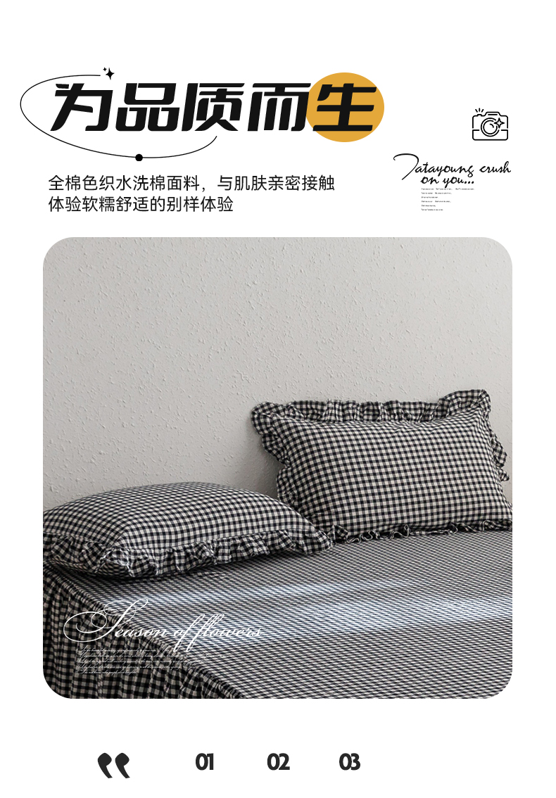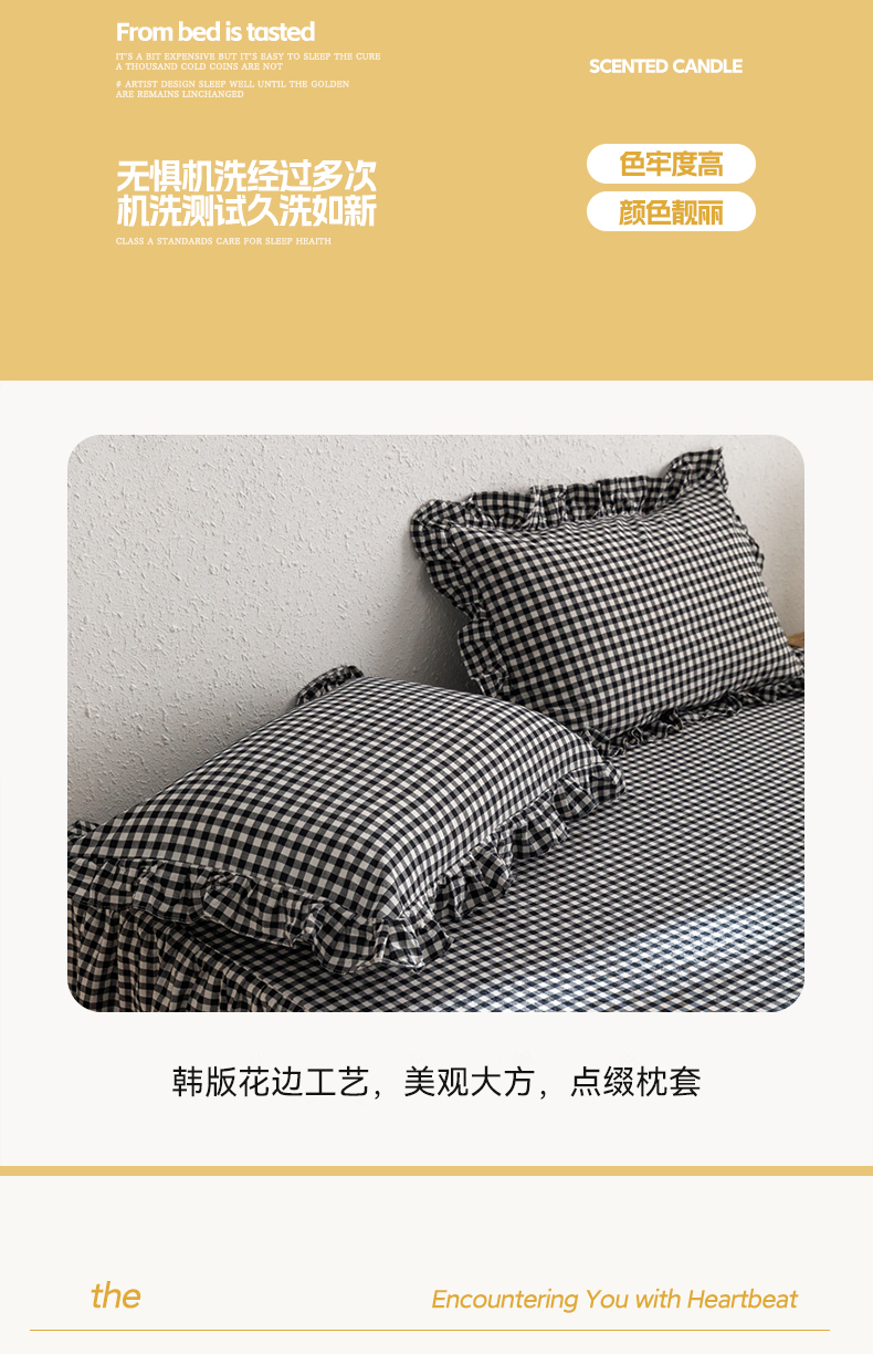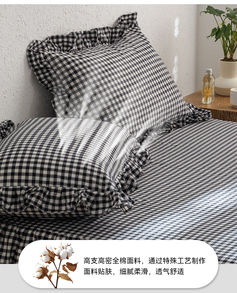 忘忧草 2024新款全棉格子花边枕套 雅尚-黑小格
