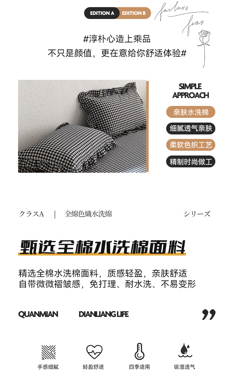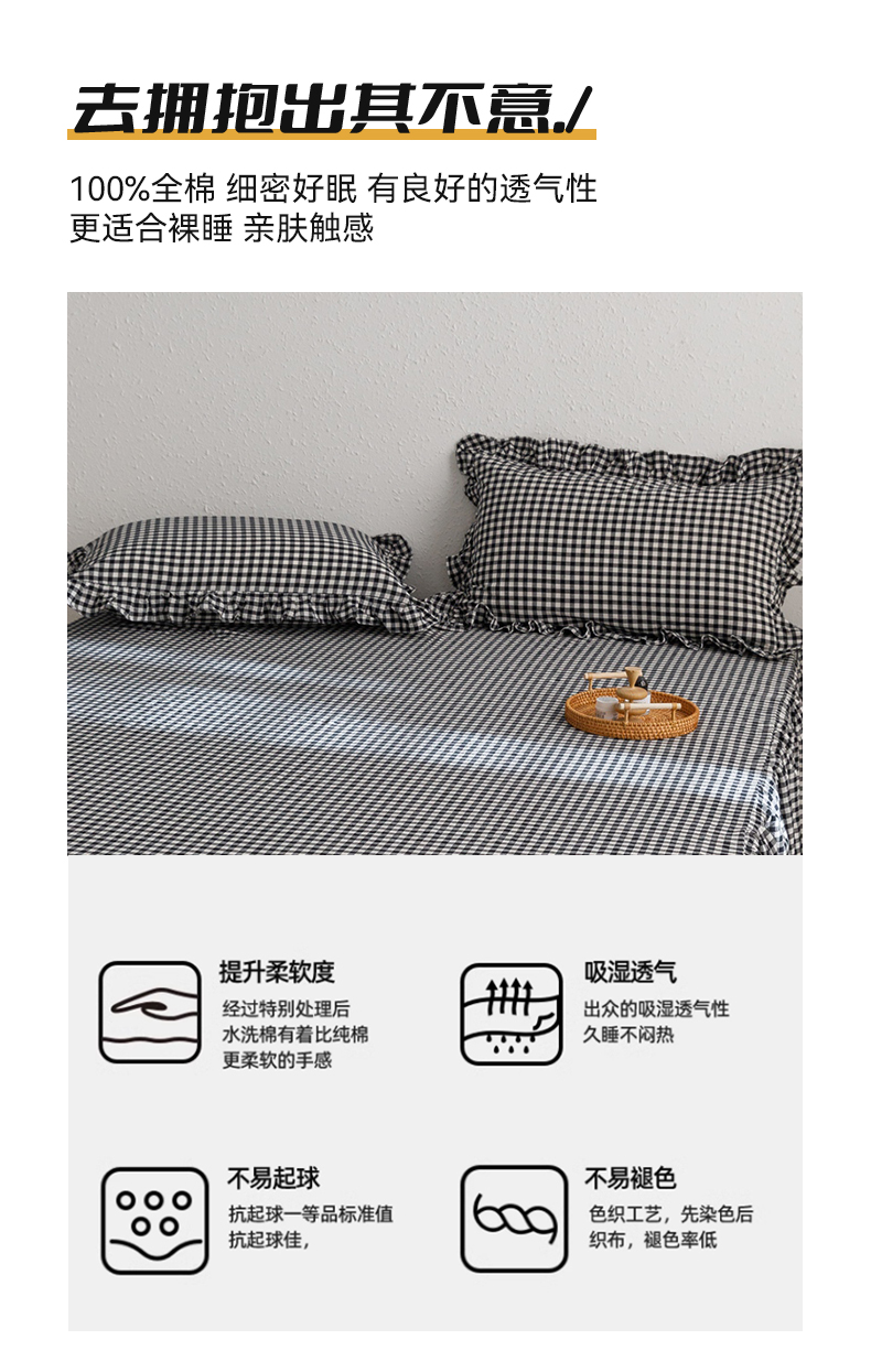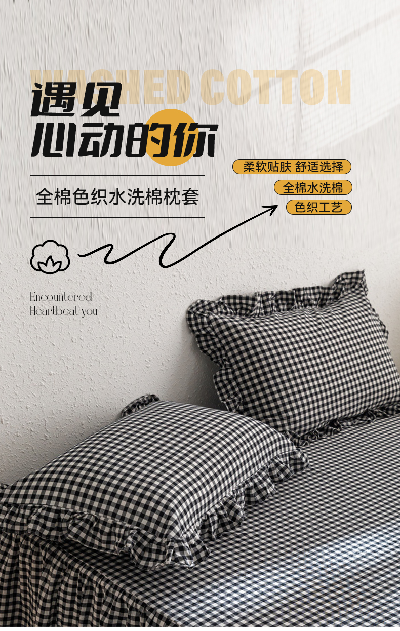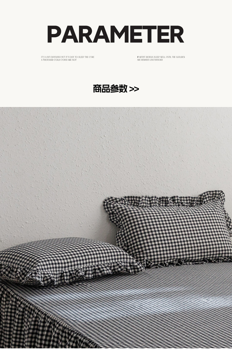 商品名称:忘忧草 2024新款全棉格子花边枕套 雅尚-黑小格