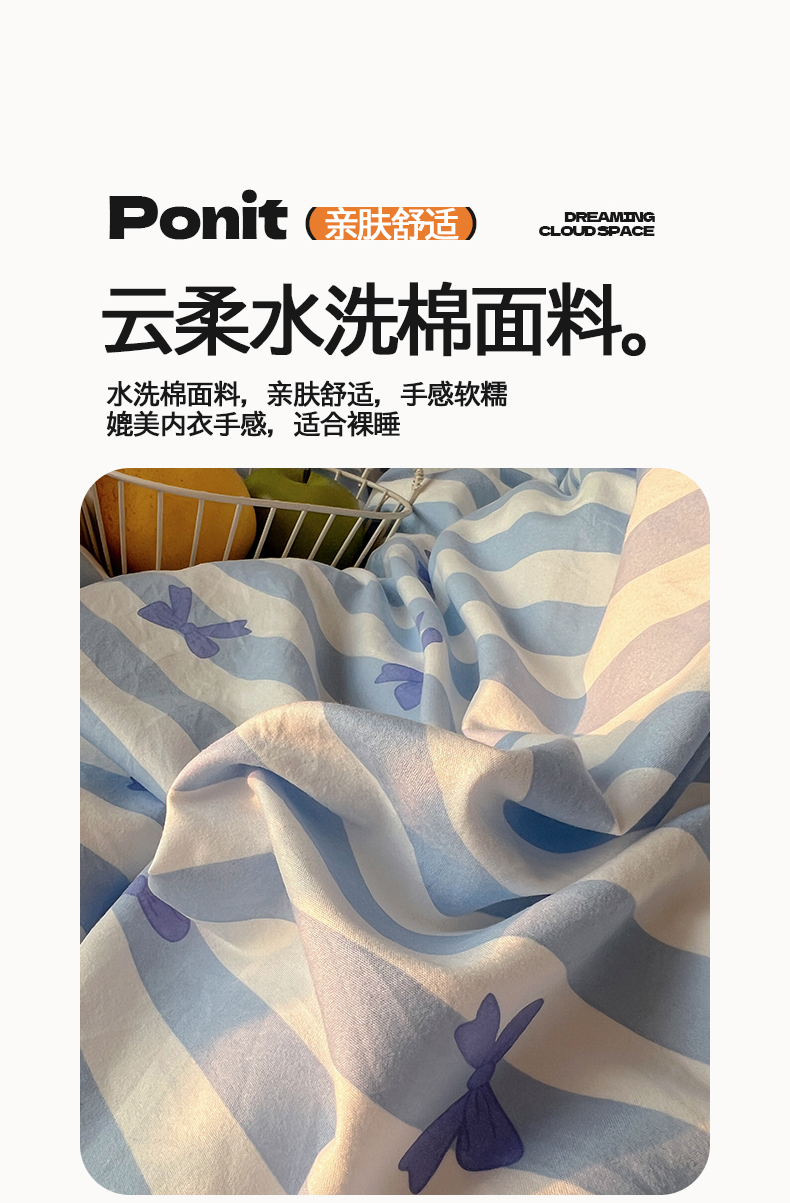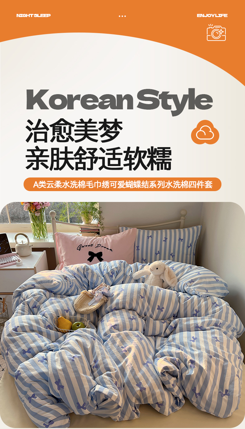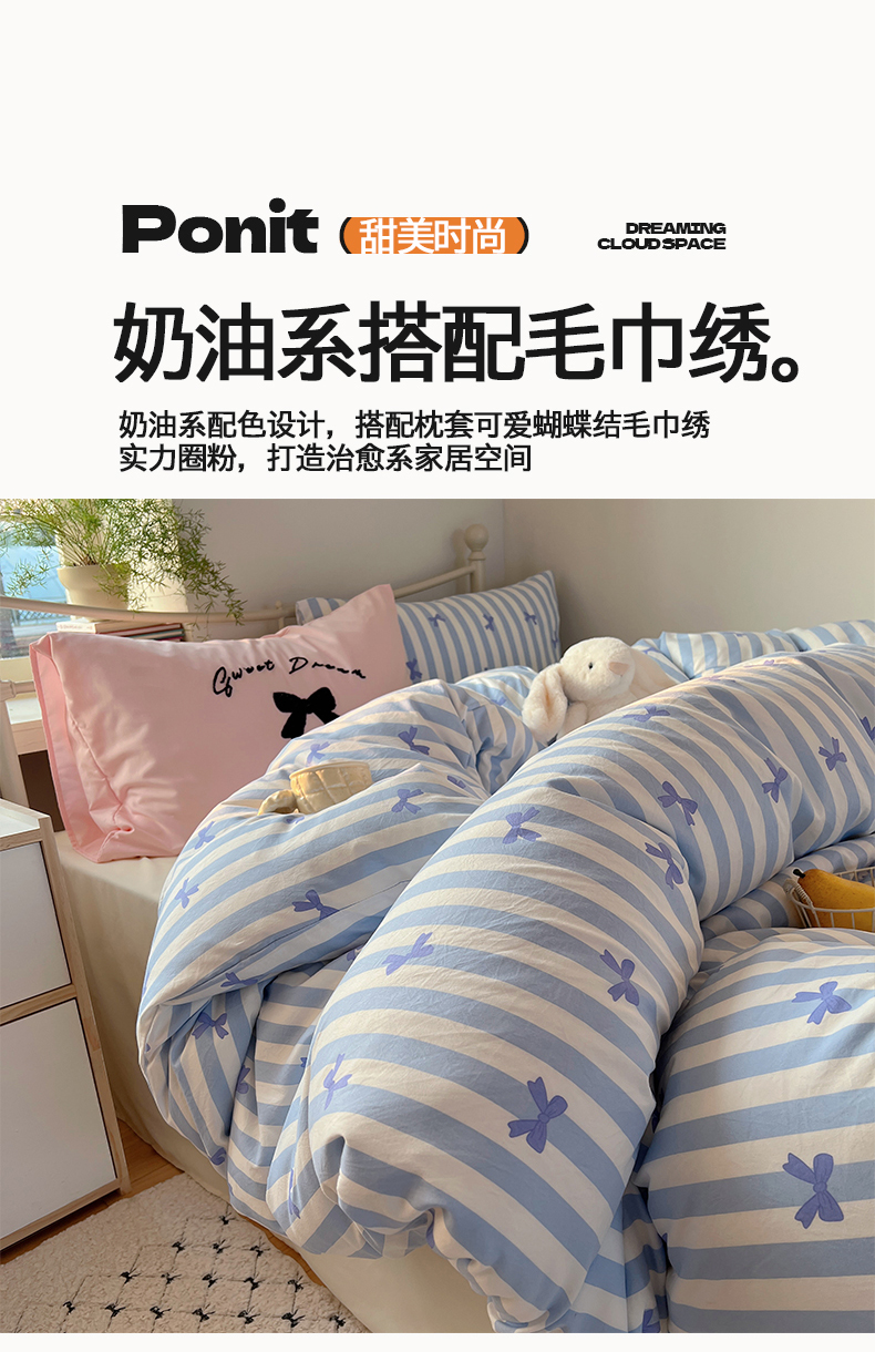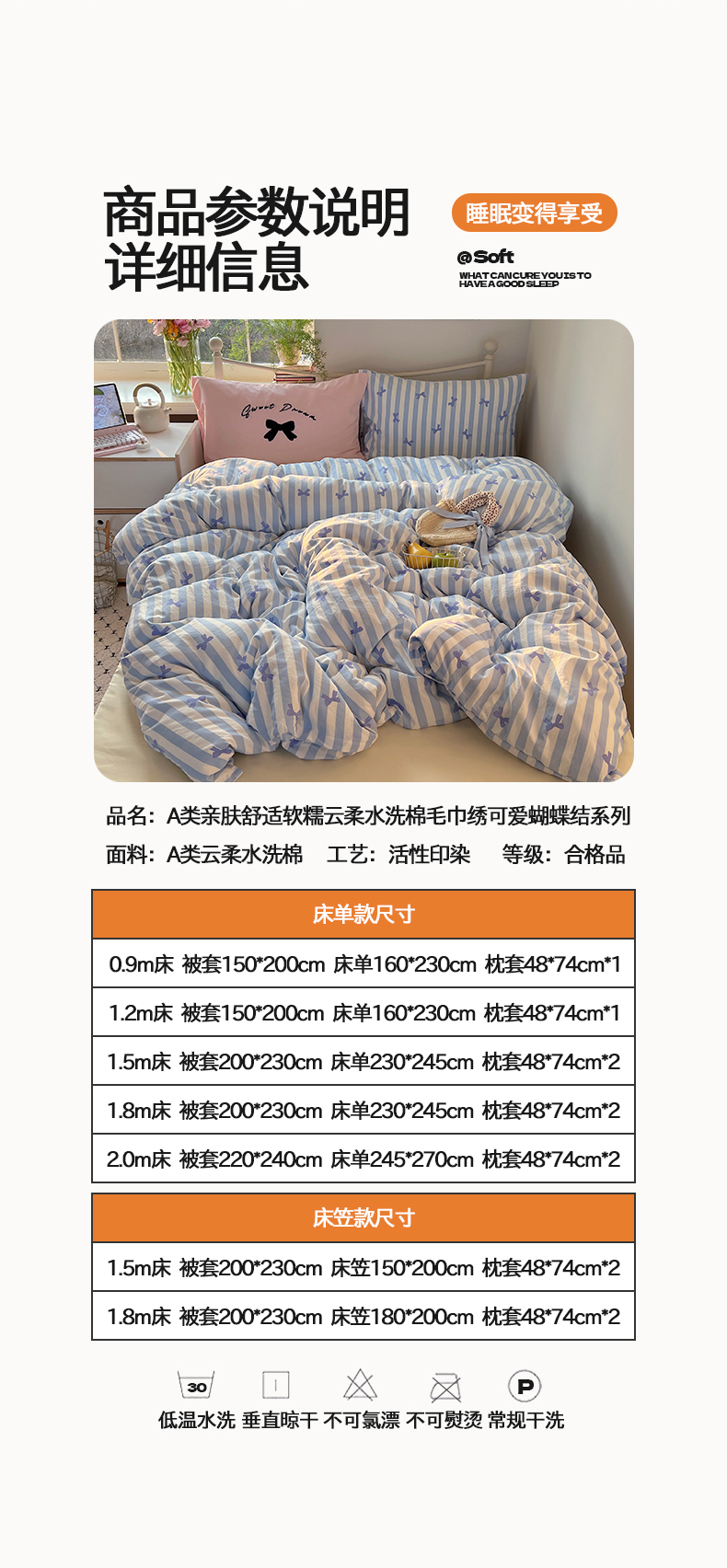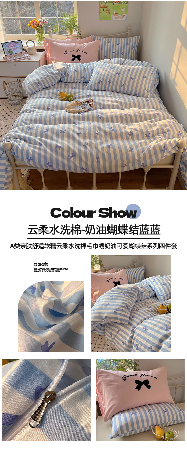 当前位置: 91家纺网 > 商品网购 > 床品套件 > 四件套 > 水洗棉四件套 > 桃心家居 2025新款A类亲肤舒适软糯云柔水洗棉毛巾绣奶油可爱蝴蝶结水洗棉系列四件套 云柔水洗棉-奶油蝴蝶结蓝蓝