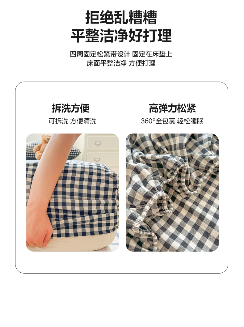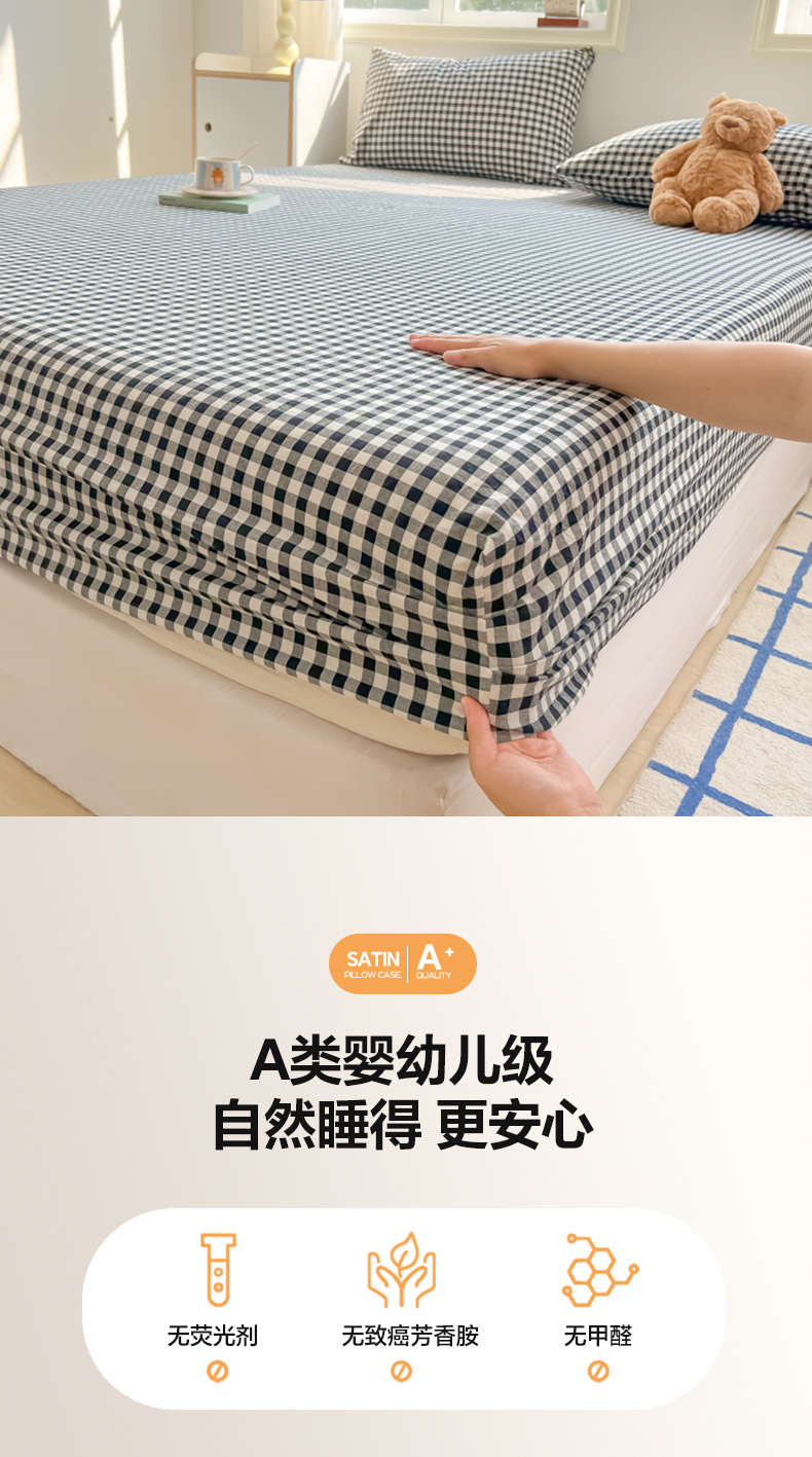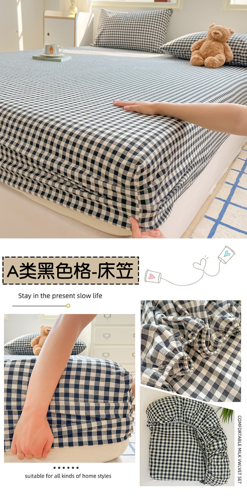 韩巢家纺 2025新款A类纯色格子水洗棉床笠单件床罩床套 A类黑色格-床笠