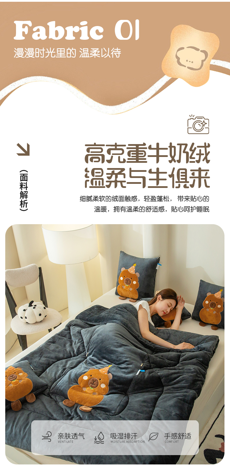 (总)雷娜家居 2025款加厚牛奶绒Happy Toast贴布绣抱枕被,藏青,橙橘,豆绿,海蓝,湖绿,暖玉色,深灰,温柔紫