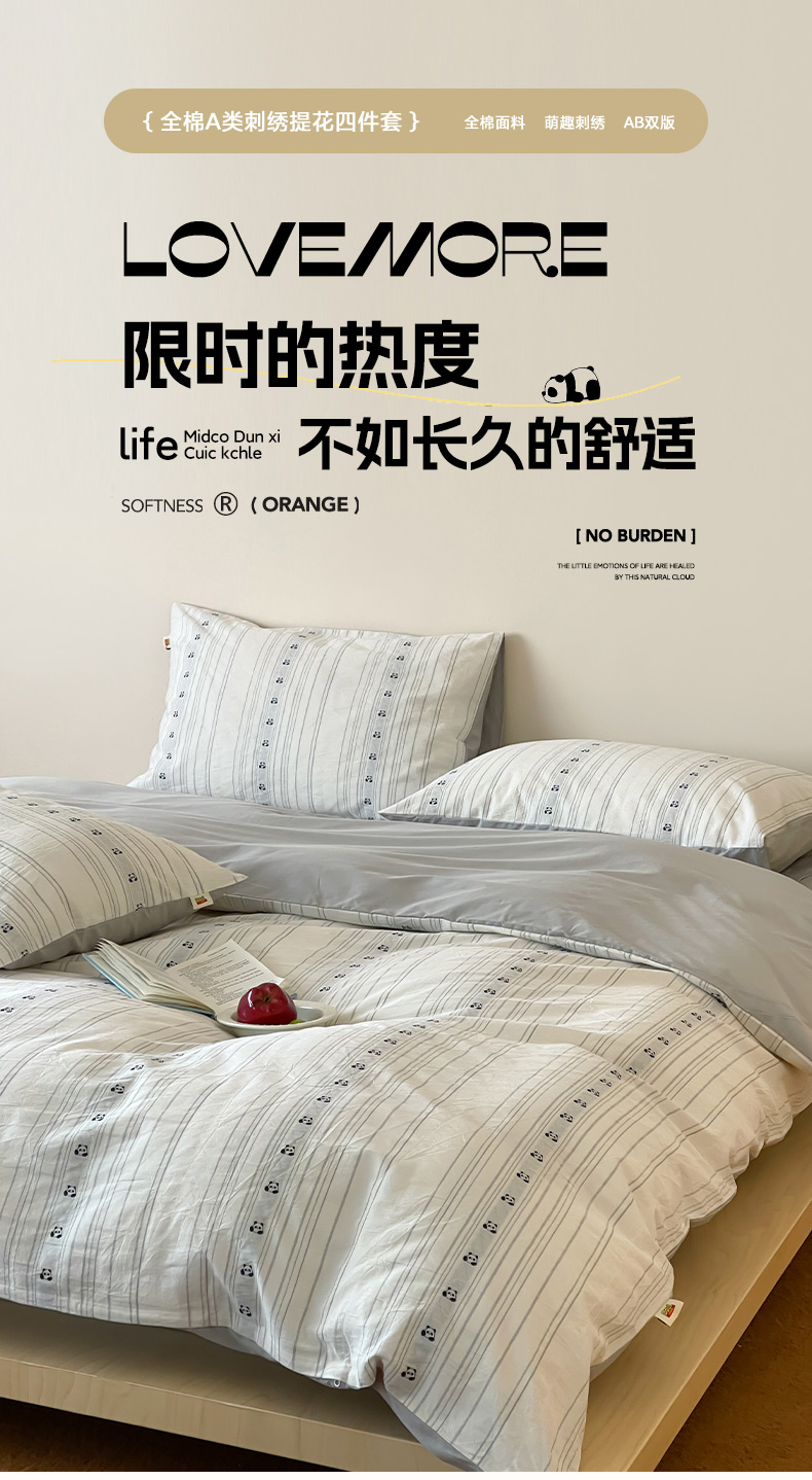 卡巴伦家纺 2025新款全棉A类刺绣提花四件套 熊猫宝贝-灰