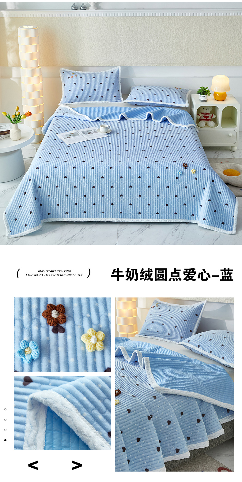 商品名称:买家秀 爆款不断货A类母婴级纯色床盖三件套牛奶绒床盖三件套珊瑚绒床盖三件套雪花绒床盖三件套牛奶绒床单 牛奶绒圆点爱心-蓝