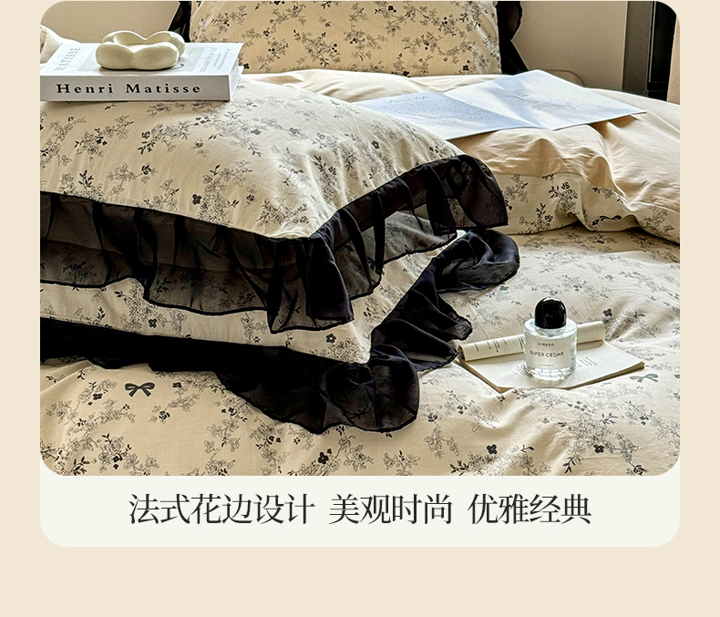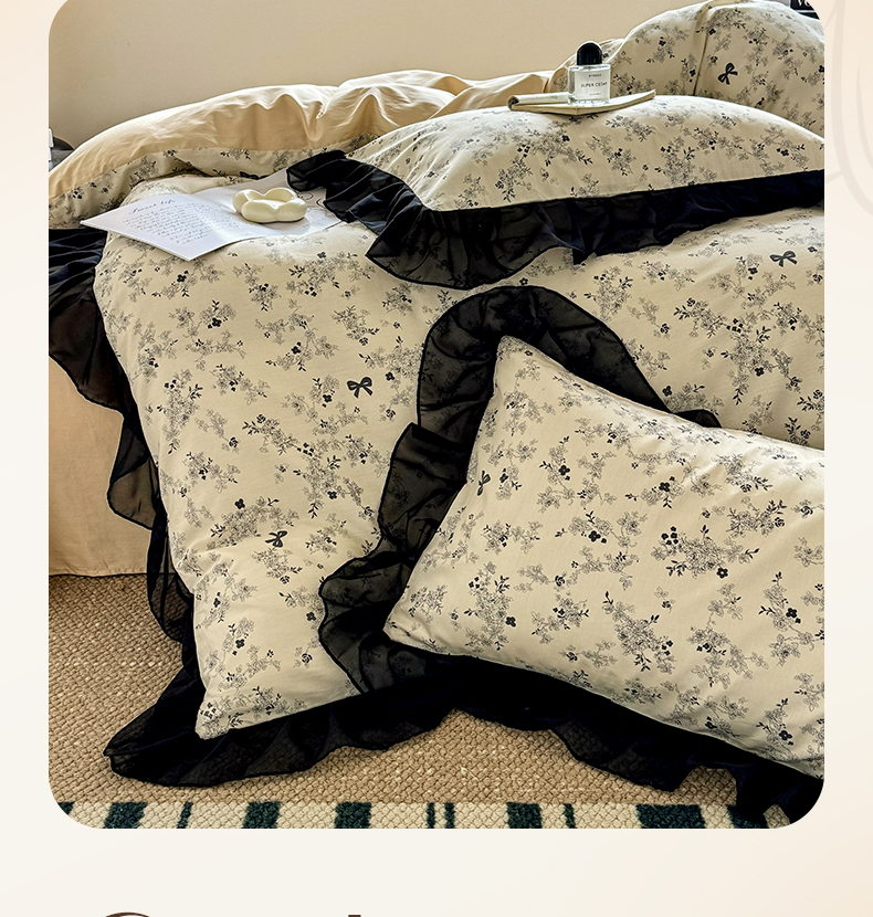 商品名称:宅家居 2025新款爆款轻法式赫本风复古印花13372纯棉四件套韩式黑色花边40支全棉三件套 蝴蝶结