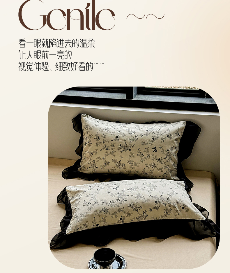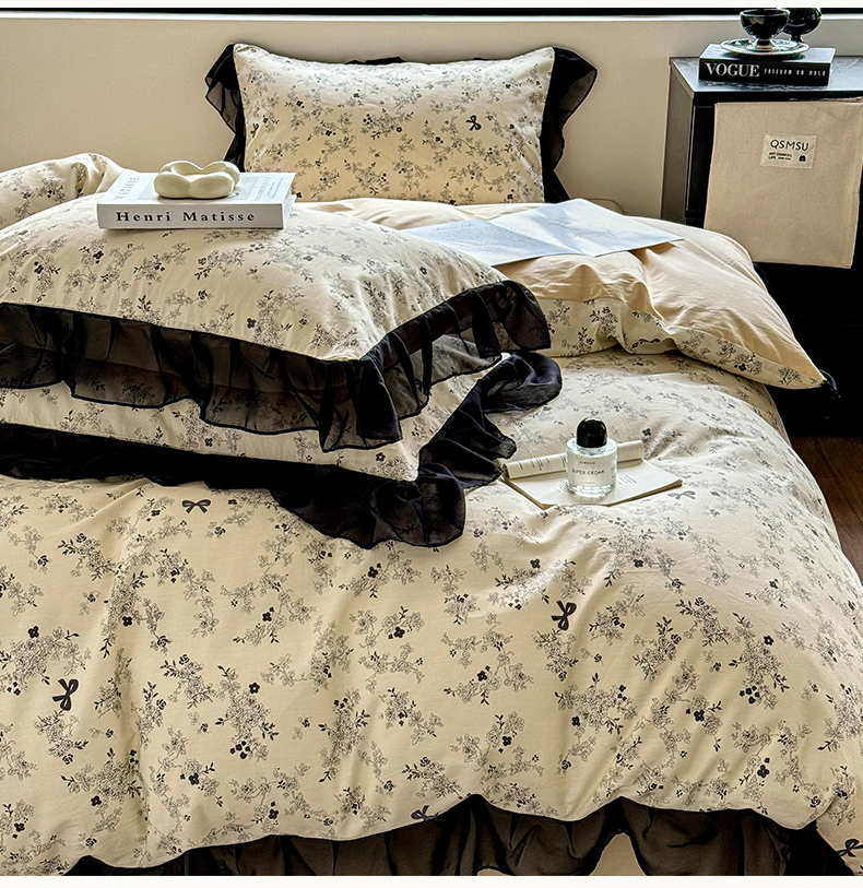 床品套件 > 宅家居 2025新款爆款轻法式赫本风复古印花13372纯棉四件套韩式黑色花边40支全棉三件套 蝴蝶结