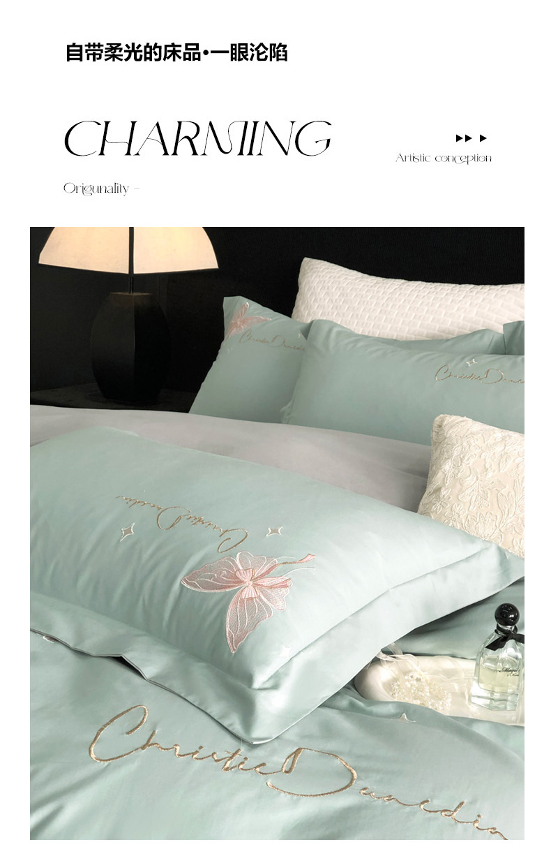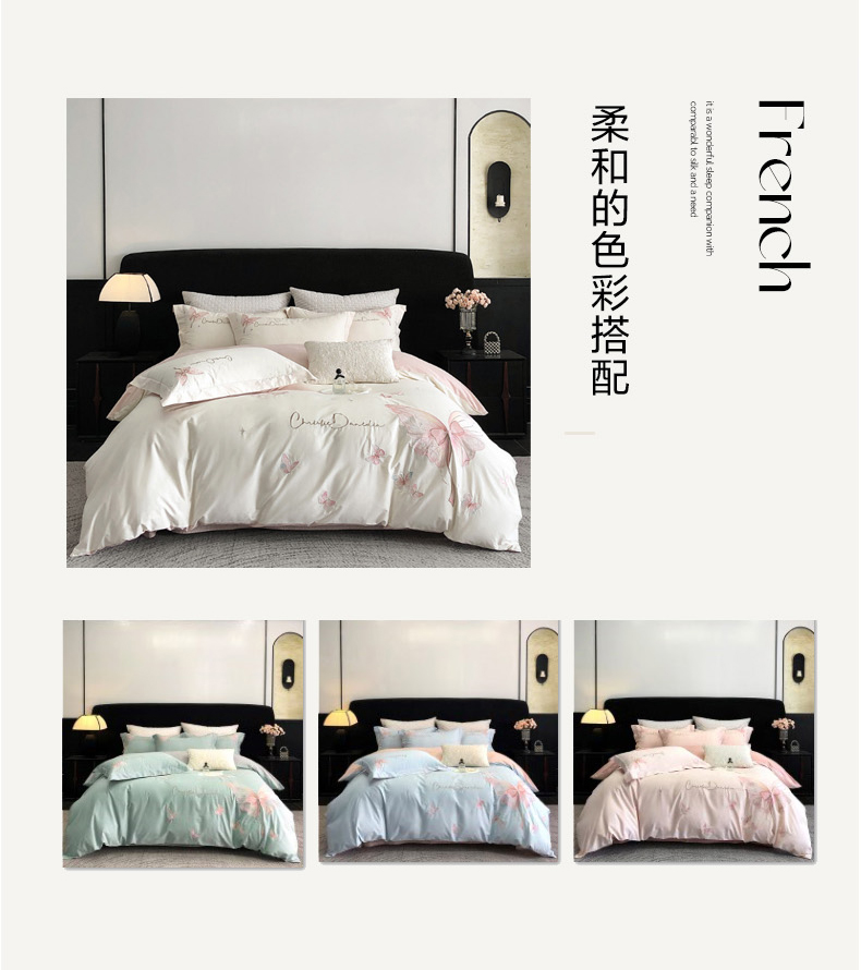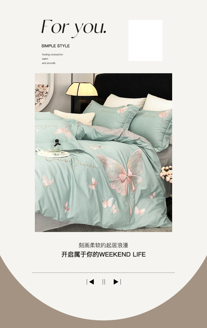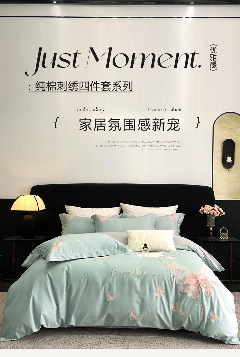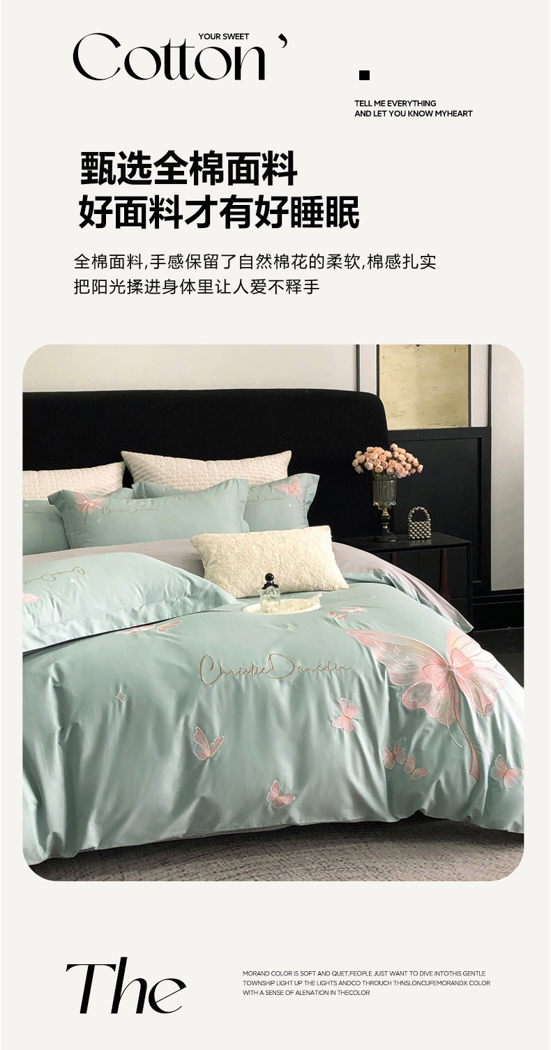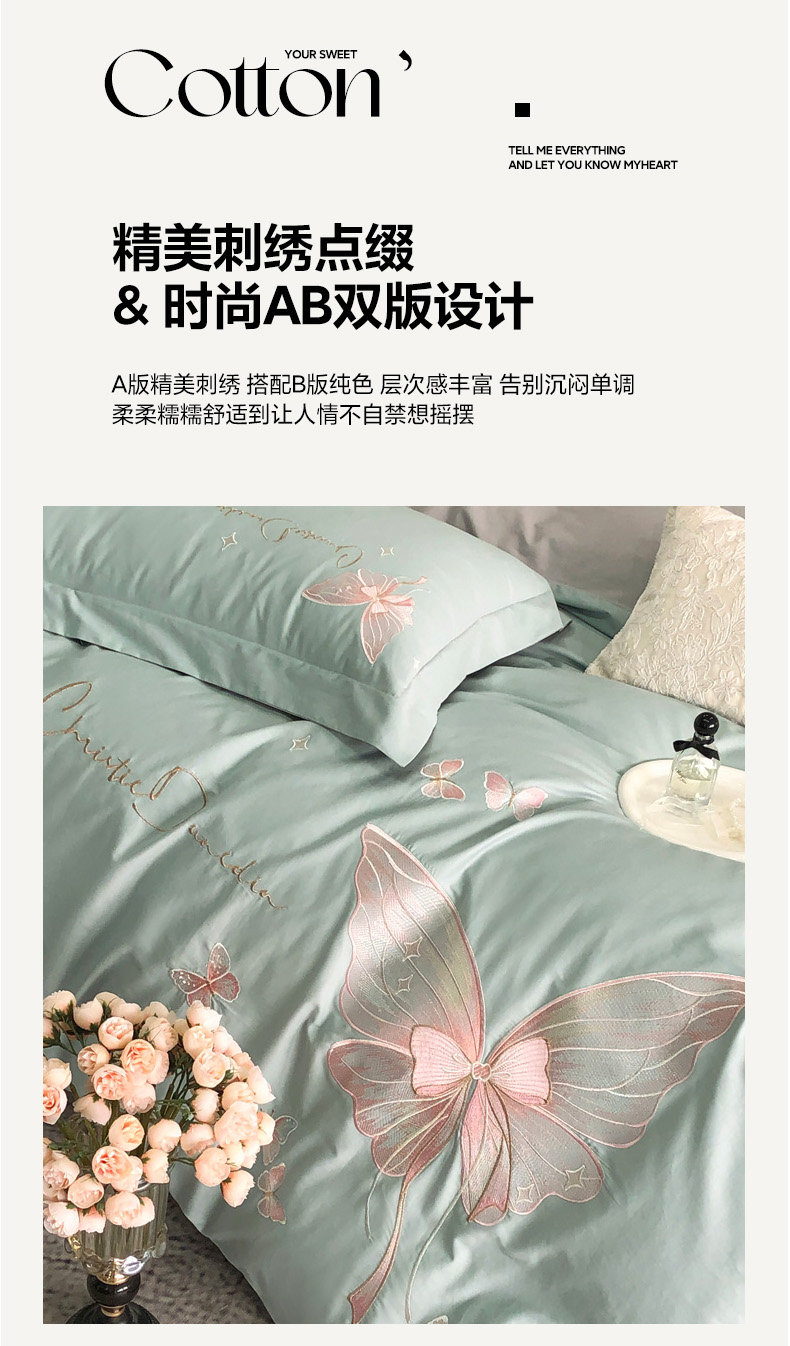 (总)万盛家纺2025年全棉刺绣四件套,茶白-蝴蝶粉,湖绿,花青兰,玫瑰粉
