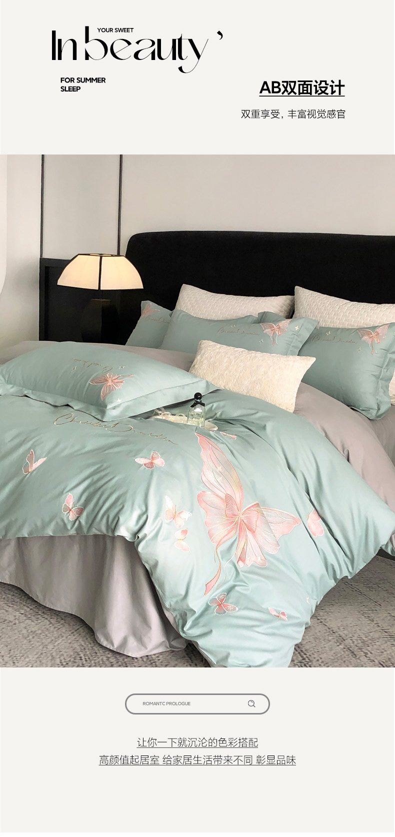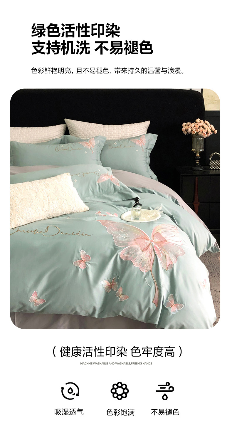 商品名称:万盛家纺2025新款全棉时尚刺绣花四件套--蝴蝶系列 湖绿-玄铁灰