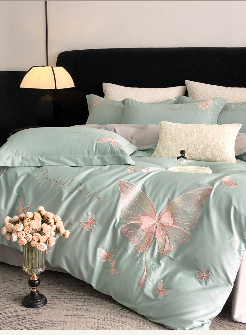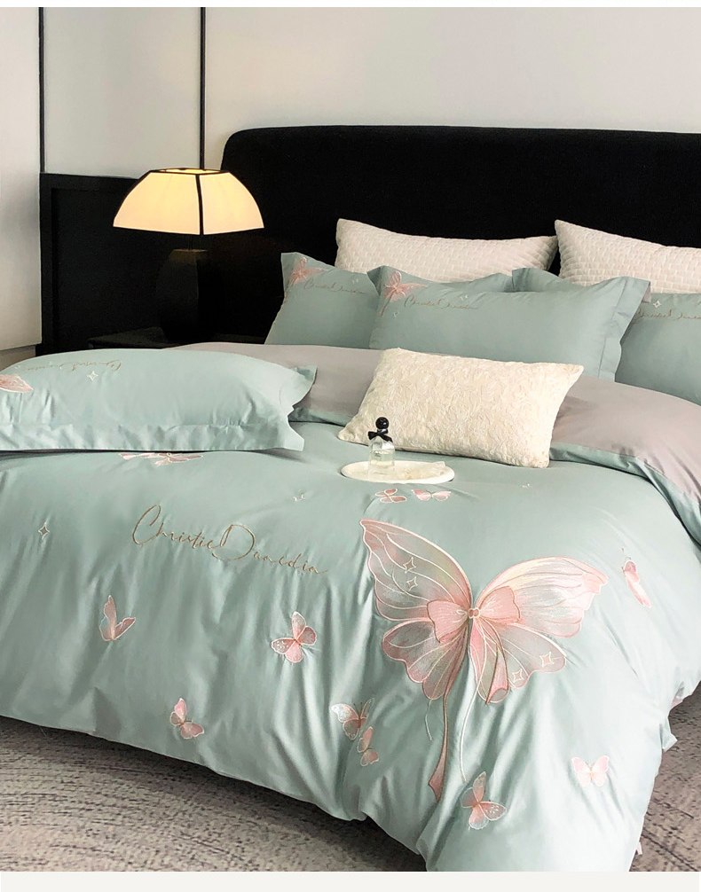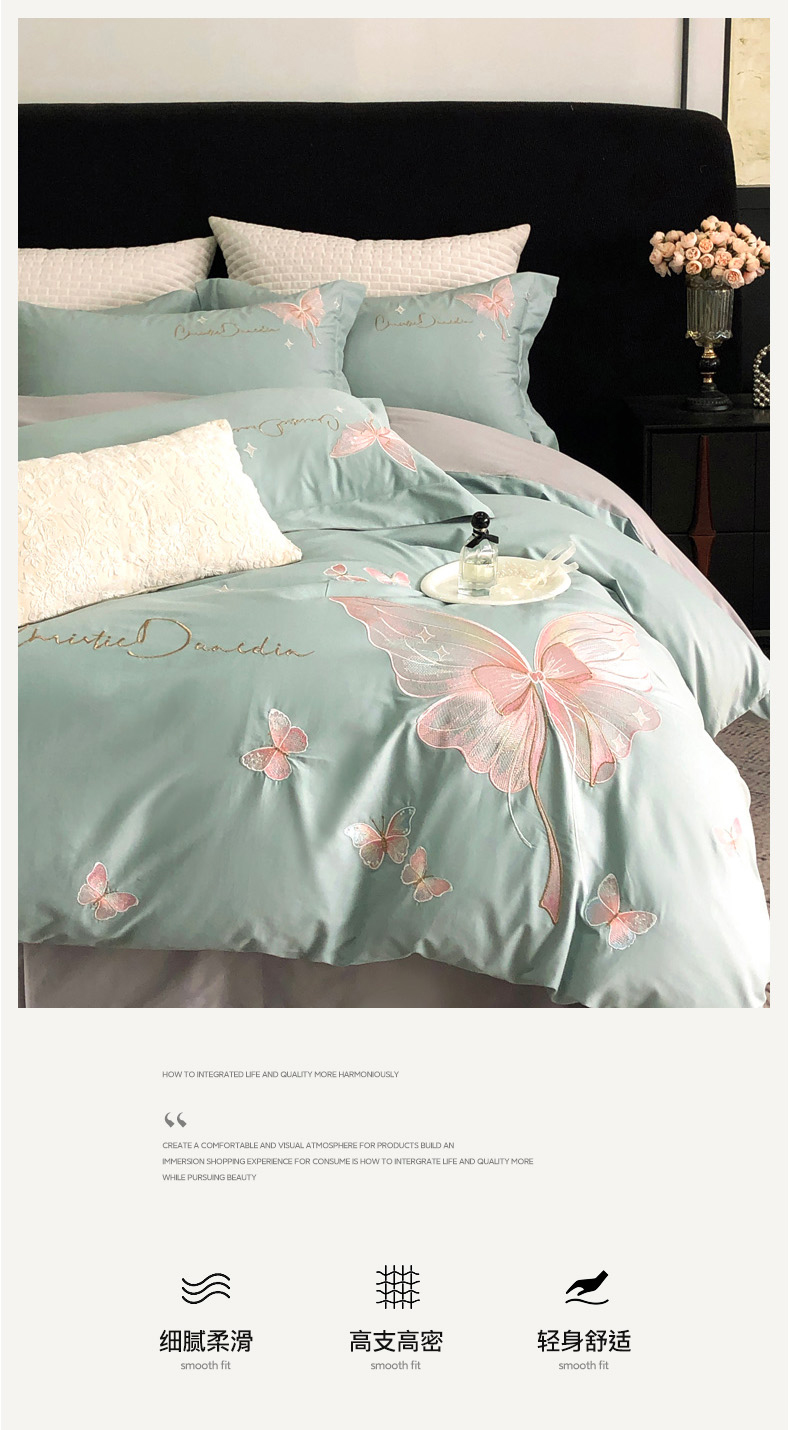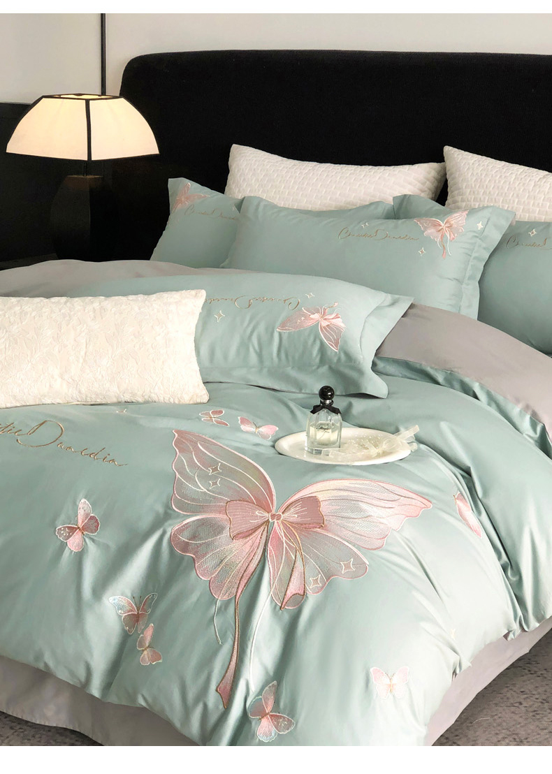 万盛家纺2025新款全棉时尚刺绣花四件套--蝴蝶系列 湖绿-玄铁灰