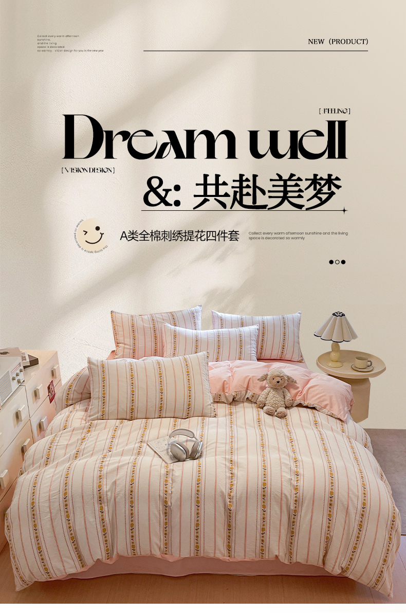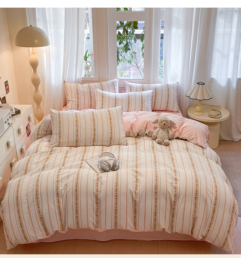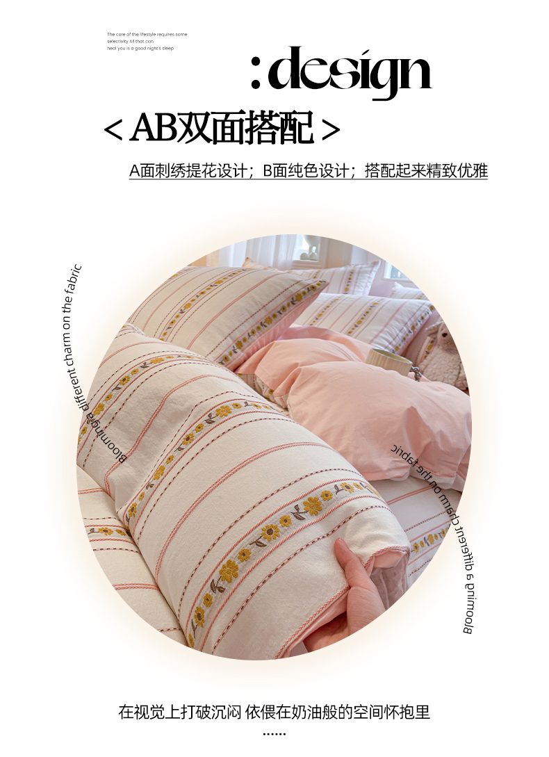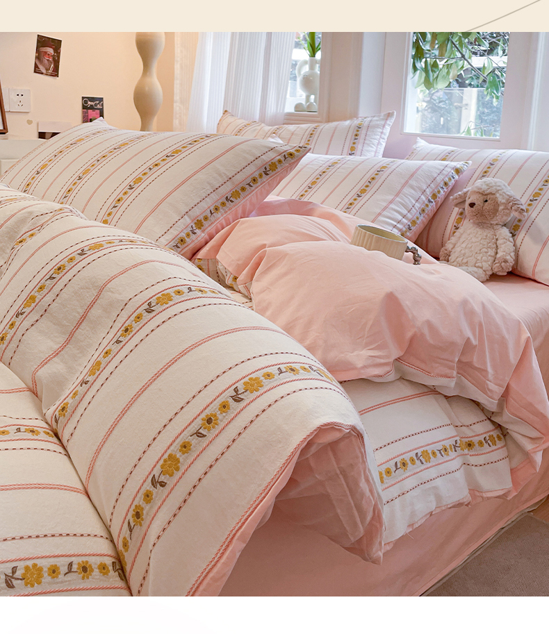 莱茵家居 2025春夏新款A类田园风小碎花色织钩花全棉四件套-沐阳系列 沐阳-浅樱玉+暖黄