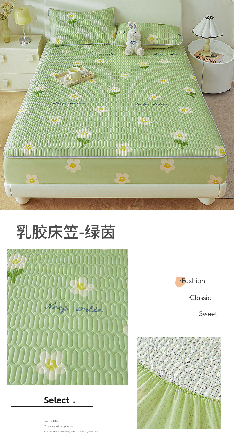 商品名称:雯豆2025夏季新品0.4乳胶凉席床笠款三件套凉感丝印花纯色床罩 乳胶床笠-绿茵1