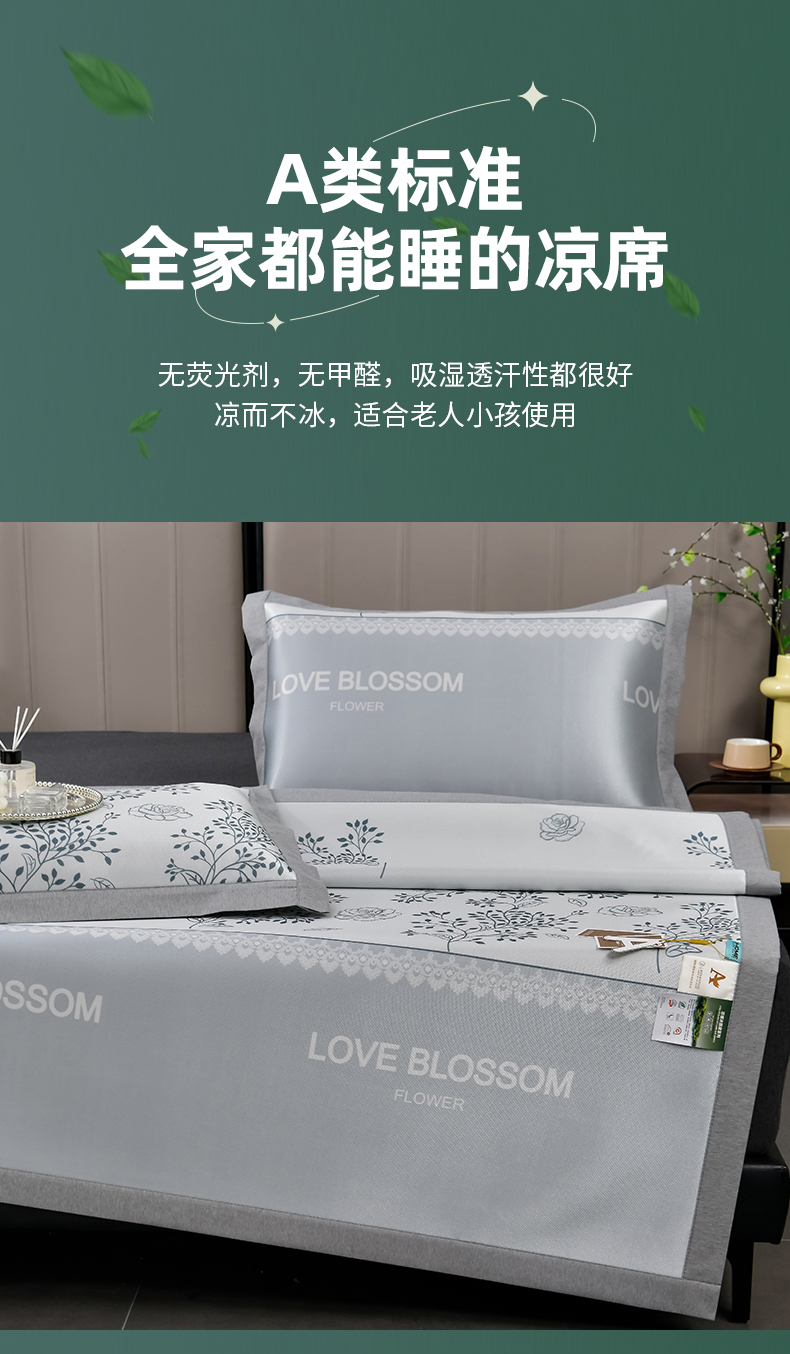 商品名称:2025新款加厚款-碳光凉感印花冰丝席系列 清新叶语-灰