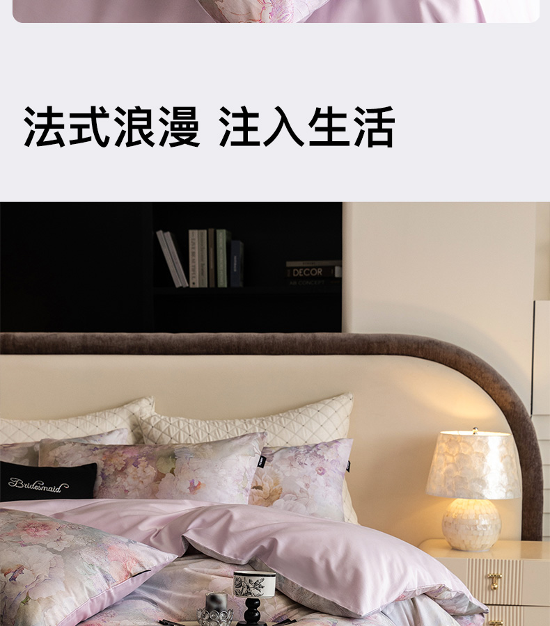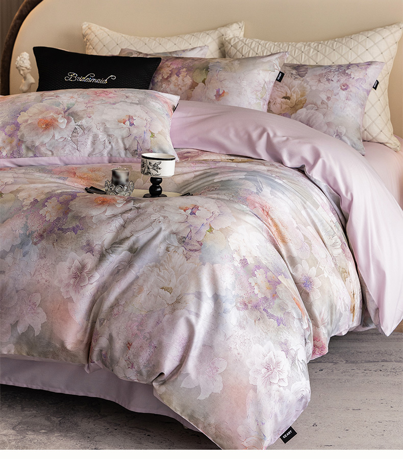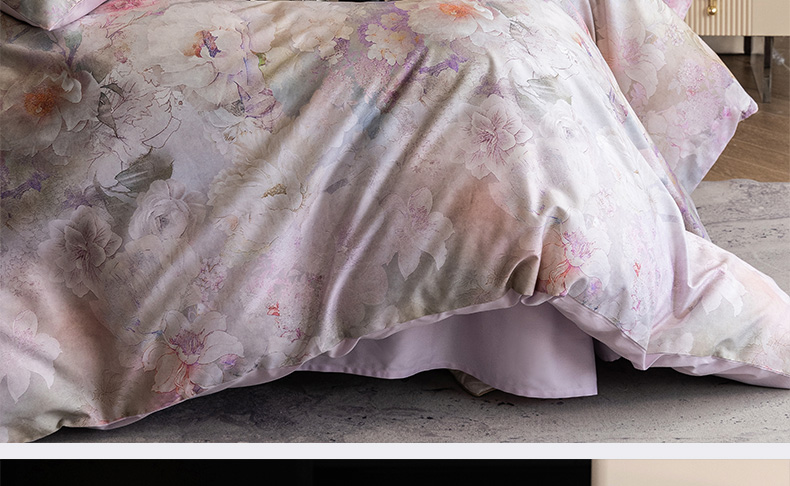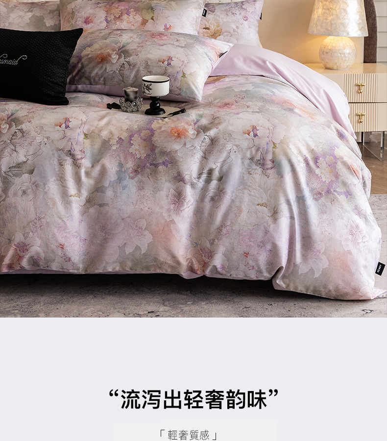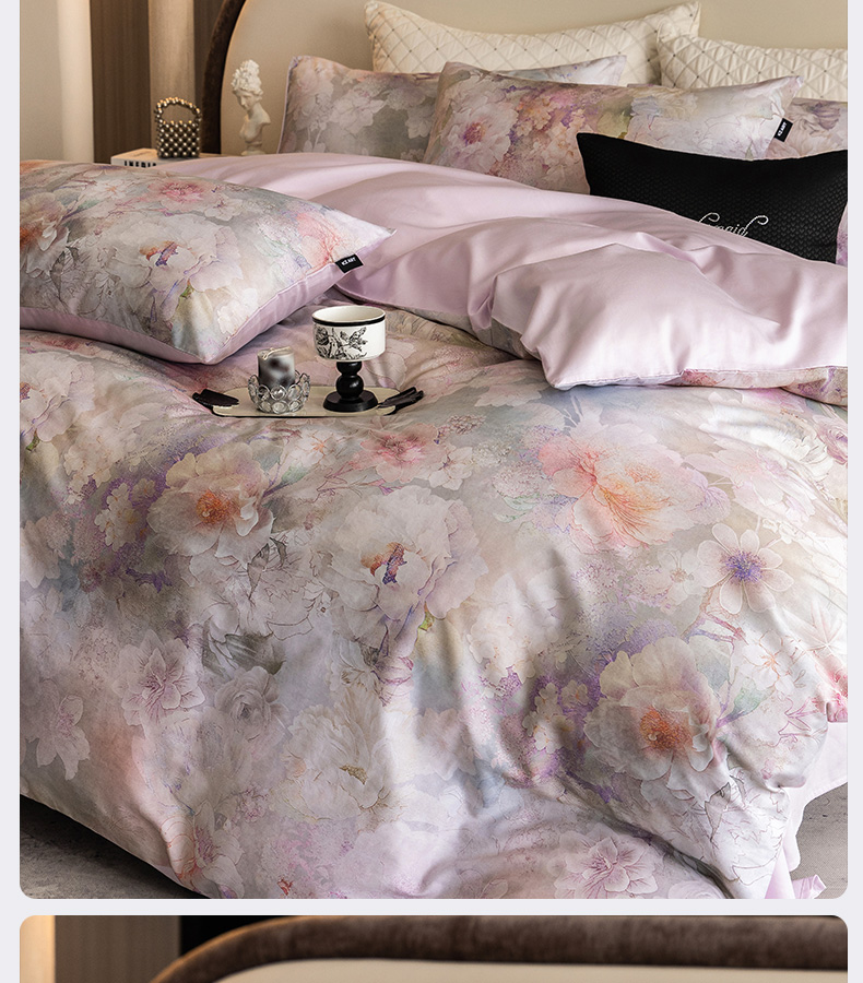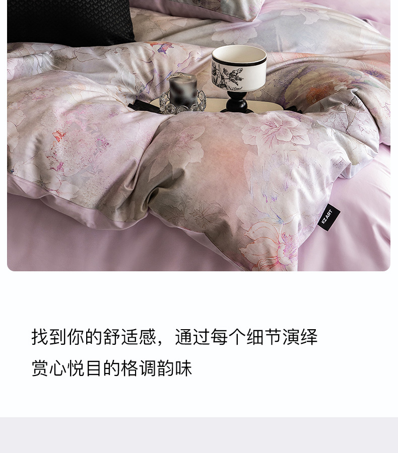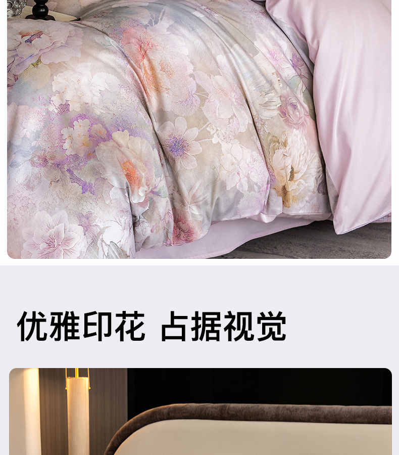 佳汐蓝家纺 2025新款春夏100贡缎长绒棉数码印花四件套 闲云归处-粉